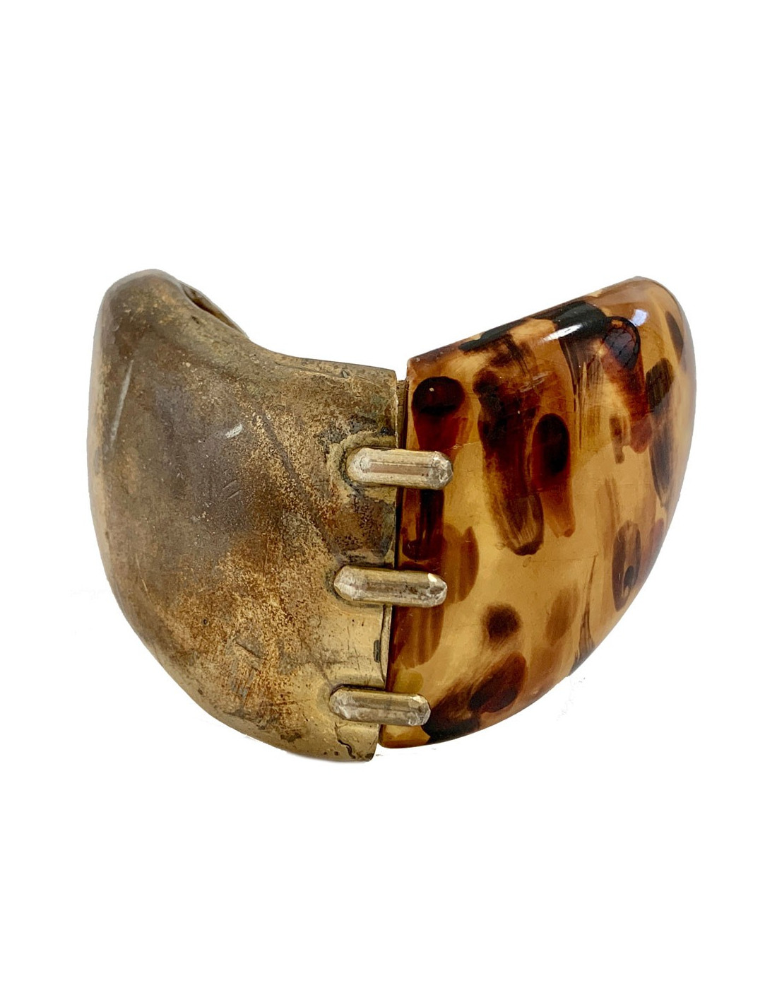 Belle manchette YSL de la Maison YVES SAINT LAURENT Rive Gauche bi matière, rigide. Elle est en résine marron façon écaille de tortue et métal de couleur or vieilli. Une partie de l'intérieur de la manchette est en bois peint à la feuille d'or.