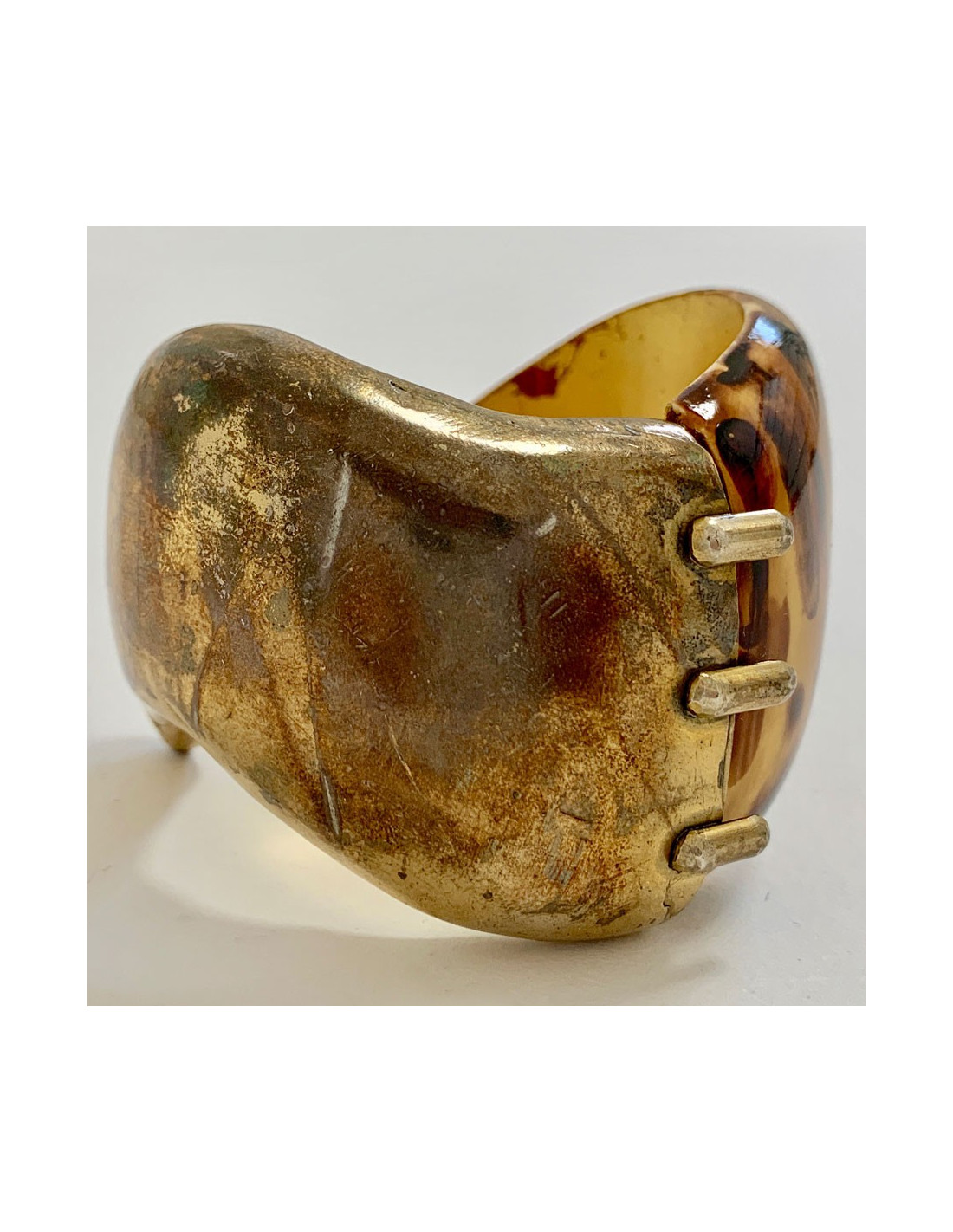 La manchette est en bon état. Micro rayures sur la résine, traces d'usure sur le métal. La couleur or de la partie intérieure est légèrement écaillée.