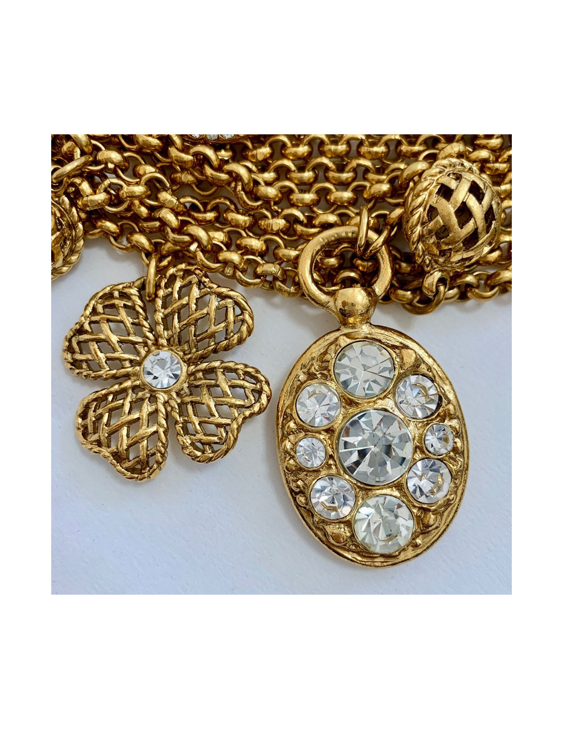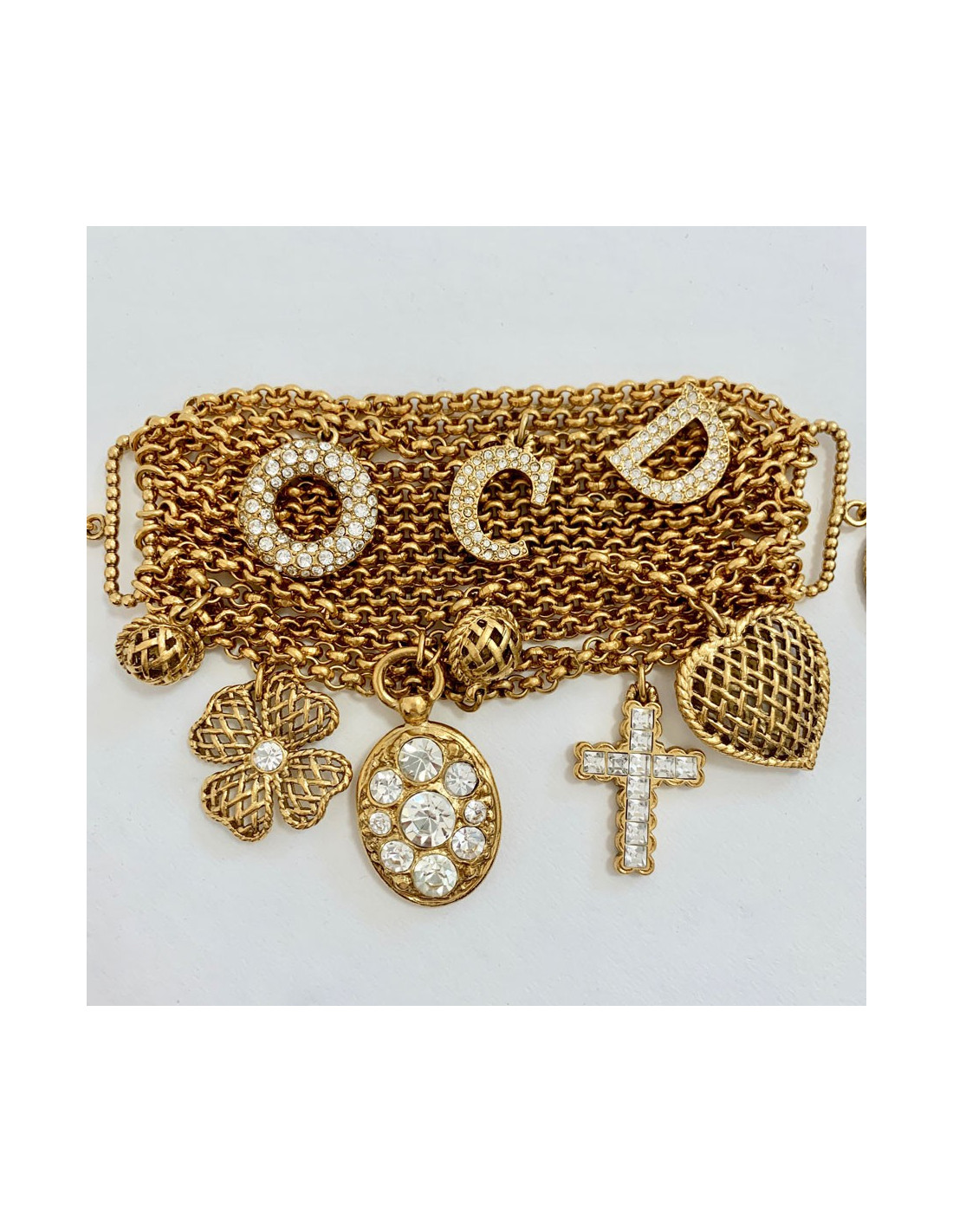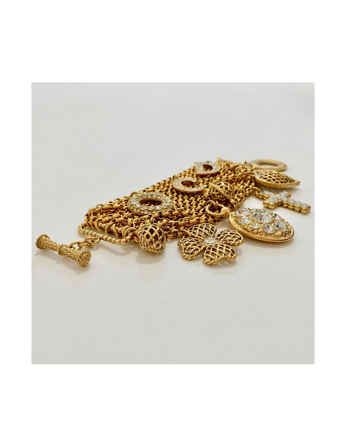 Exceptionnel bracelet de la Maison CHRISTIAN DIOR, multi chaines (15 chaines) en métal doré et agrémenté de divers charms tels que : un trèfle, une croix, un coeur ainsi que les initiales CD. Tous ces charms sont sertis de strass de différentes tailles. Le fermoir est un fermoir T. Epoque Gianfranco Ferré.
