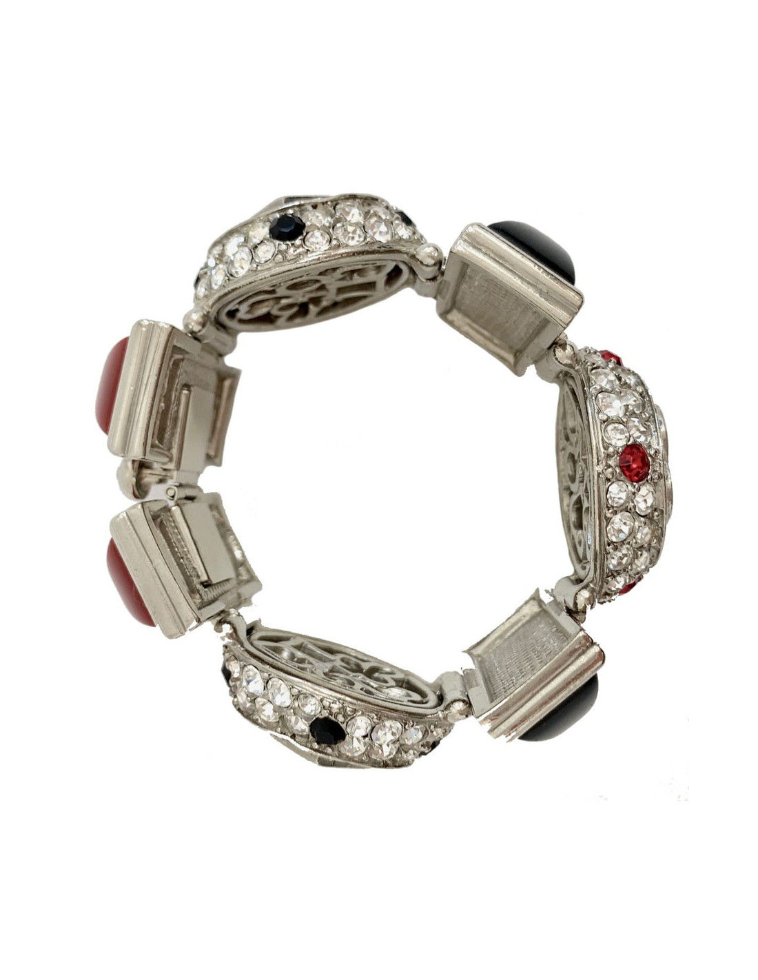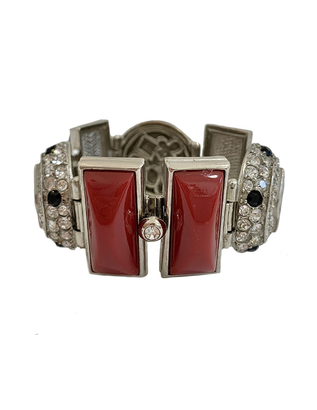 Superbe bracelet articulé de la Maison CHRISTIAN DIOR de l'époque Gianfranco Férre, en métal argenté agrémenté de pièces rectangulaires en résine rouge et noire, des éléments circulaires sertis entièrement de strass blancs, rouges et noirs. Epoque Gianfranco Ferré.