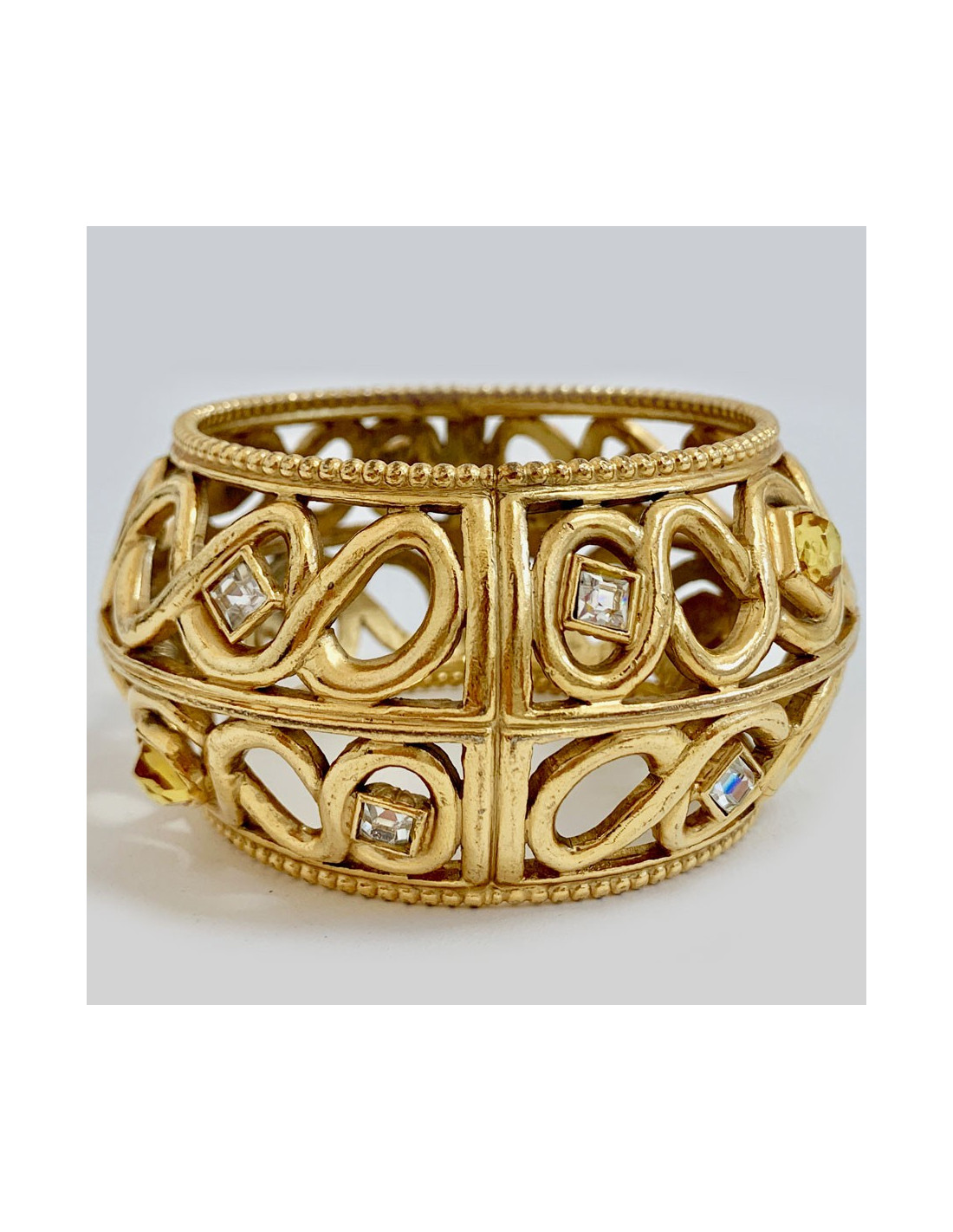 Très belle manchette Vintage ajourée, non signée attribuée à Gianfranco Ferré pour la Maison DIOR, en métal doré serti de quelques strass blanc et jaune. Elégante vous pouvez la porter seule ou superposer plusieurs manchettes. Manchette de défilé DIOR.