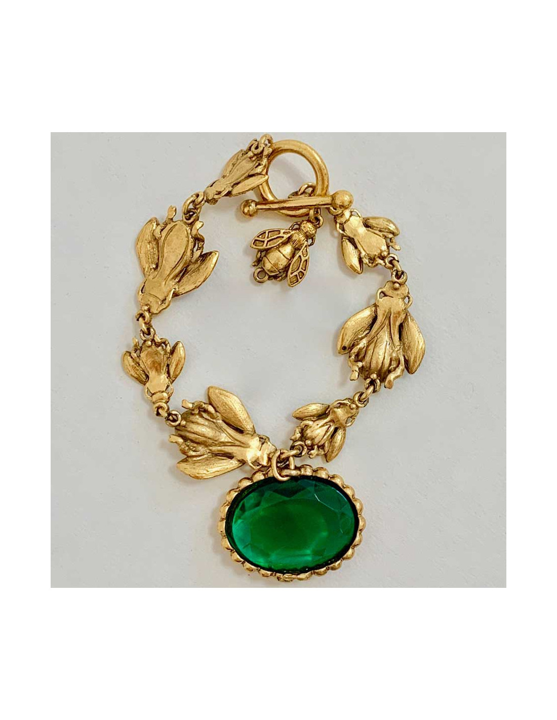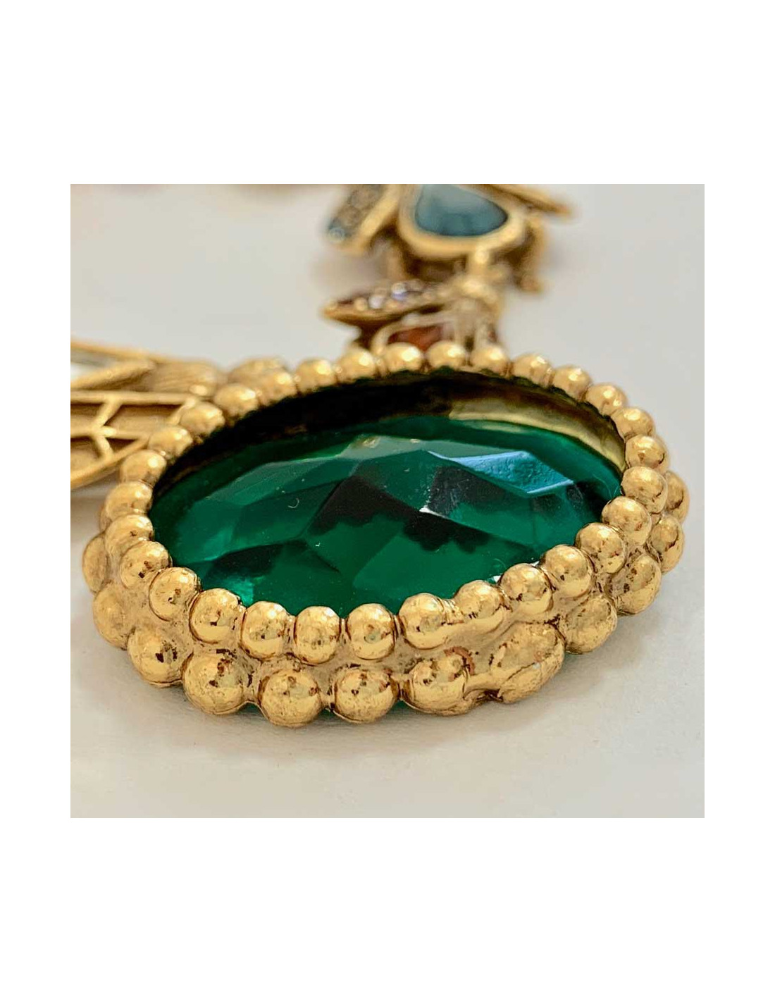 Il a également une pierre fantaisie facettée en résine vert transparent. Son fermoir est un fermoir en T.