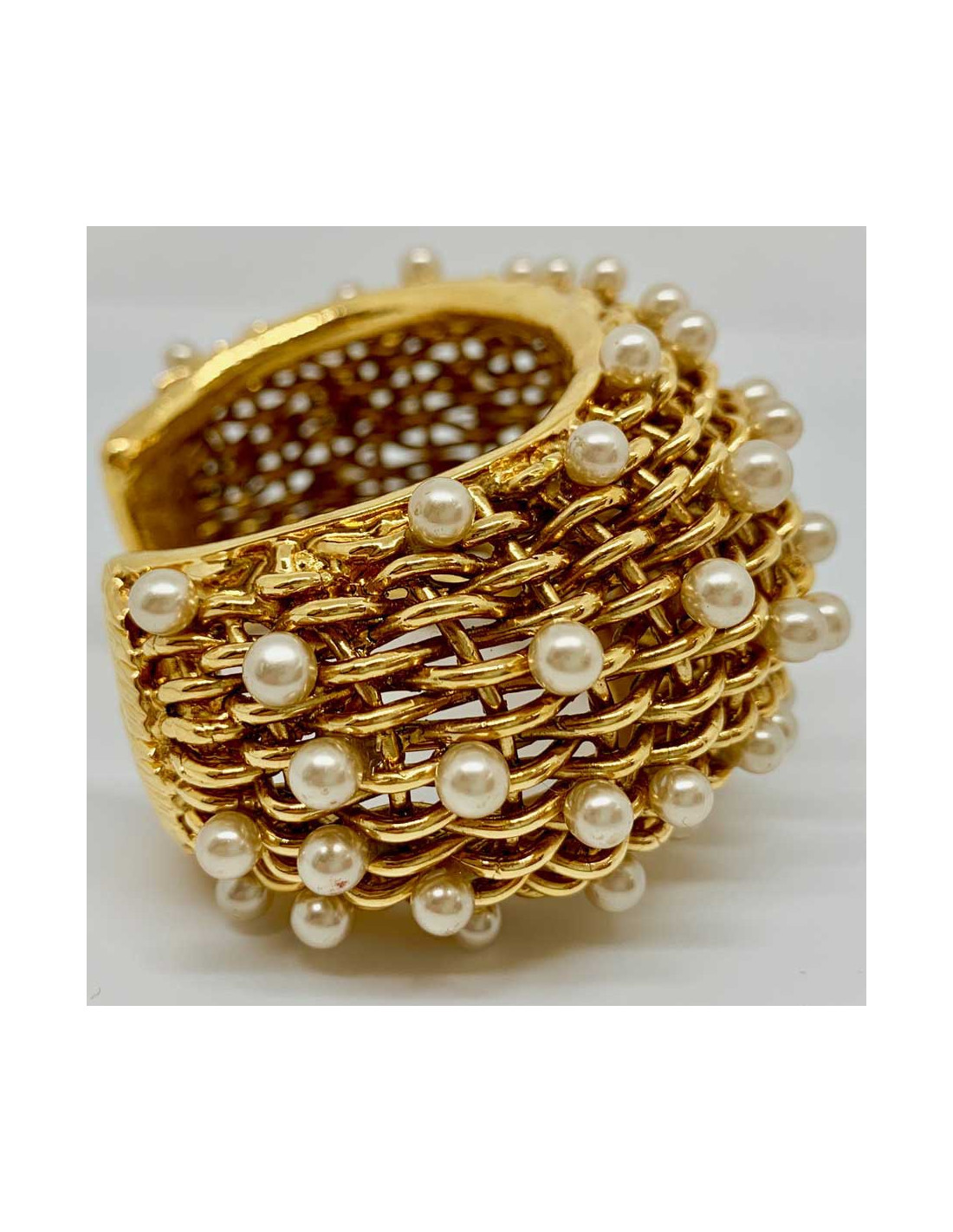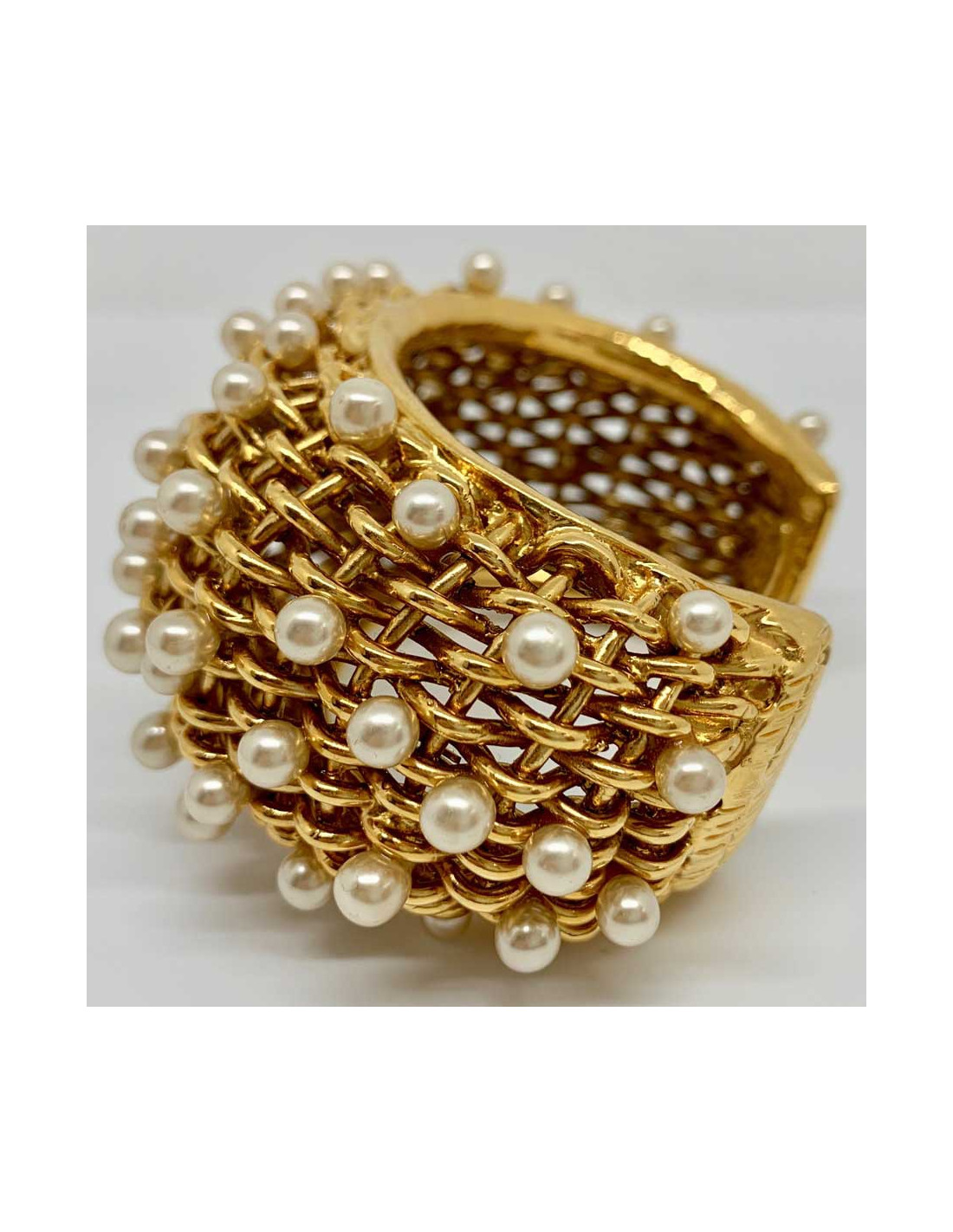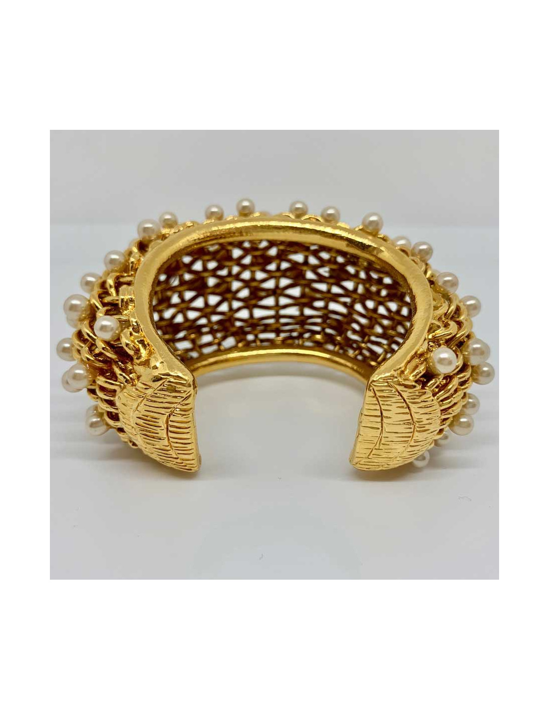 Du très beau vintage couture! Manchette ouverte de la Maison CHANEL en métal doré grillagé, agrémentée de perles fantaisies nacrées sur son ensemble.