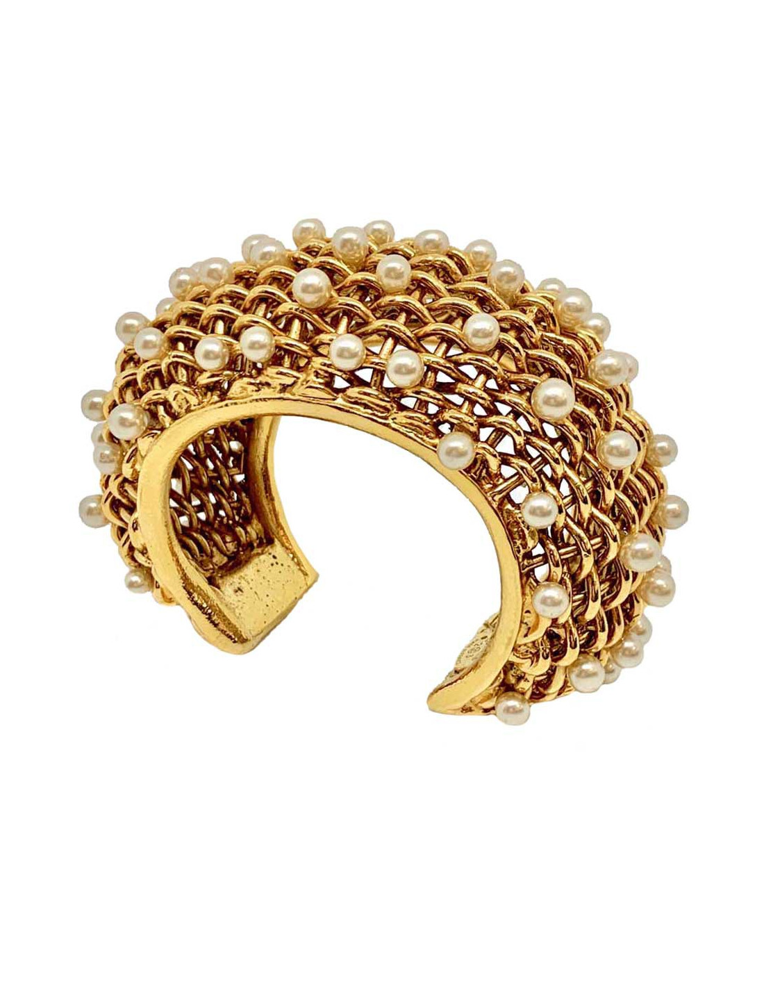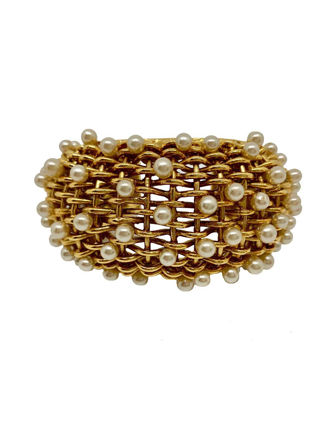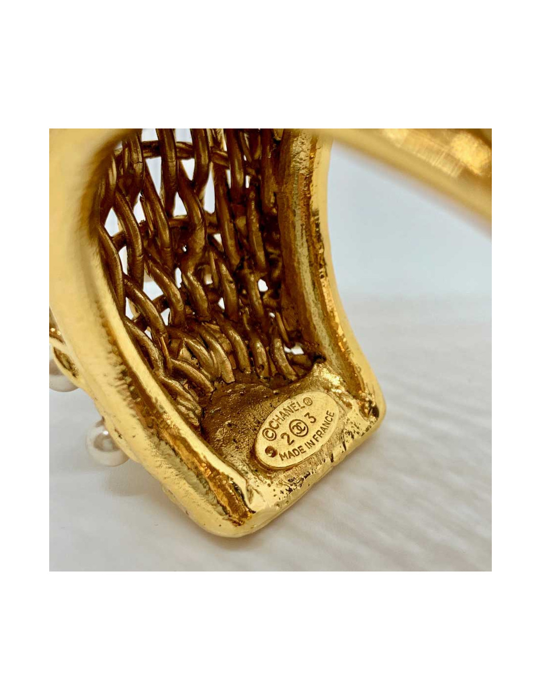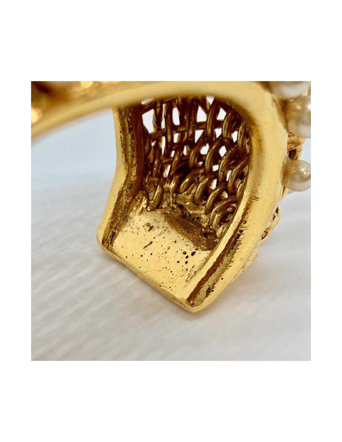 Du très beau vintage couture! Manchette ouverte de la Maison CHANEL en métal doré grillagé, agrémentée de perles fantaisies nacrées sur son ensemble.