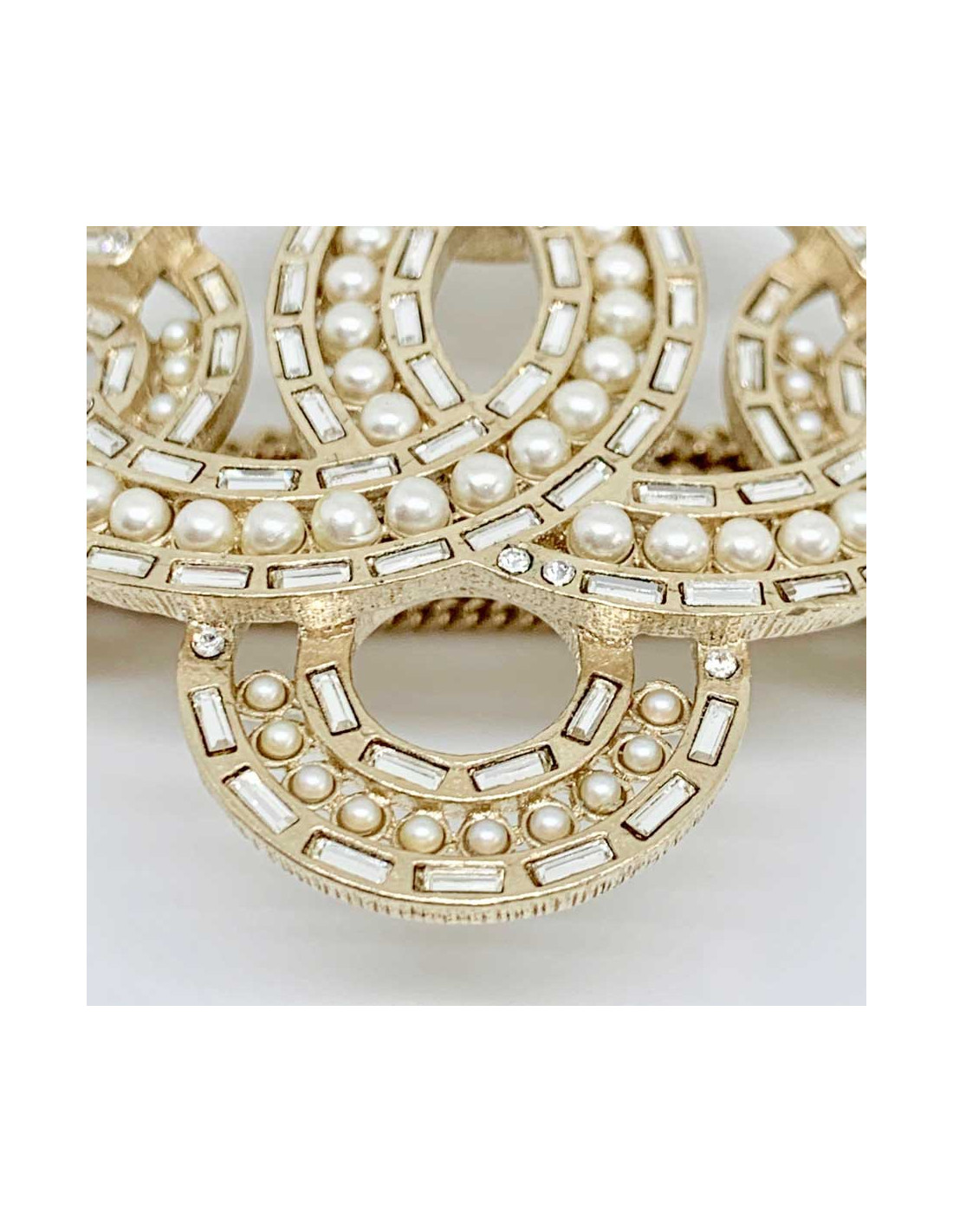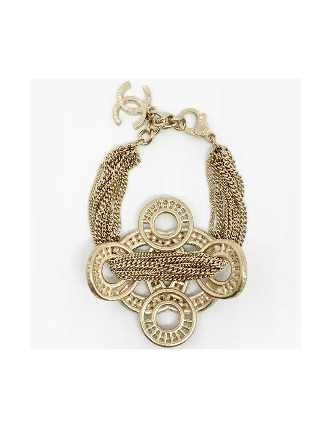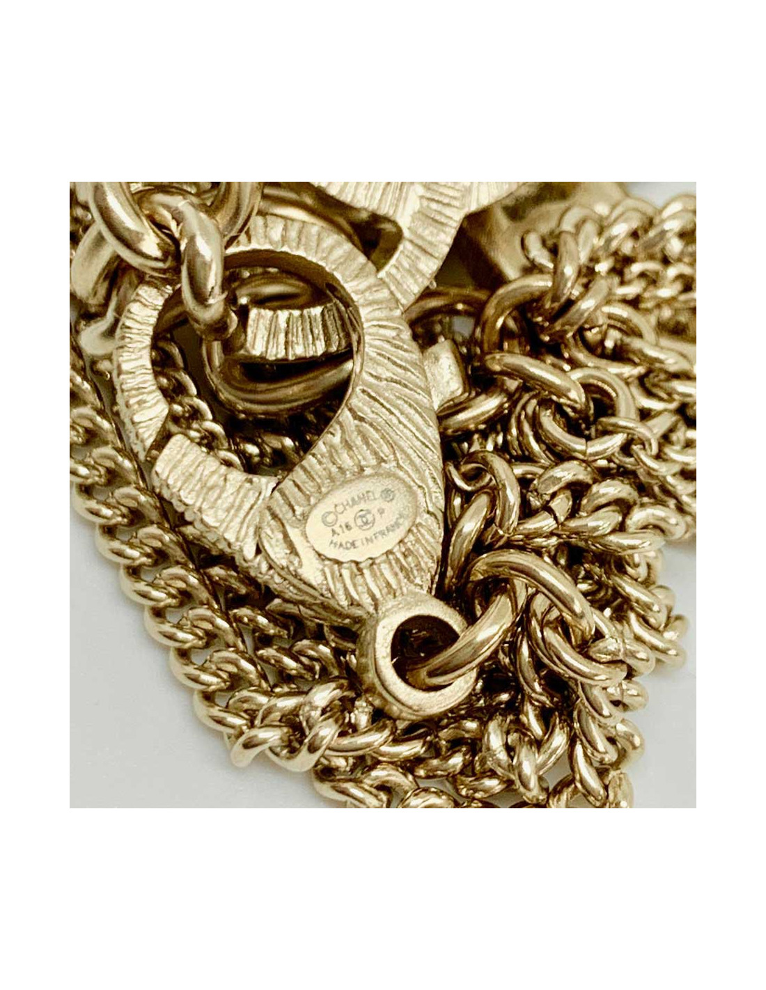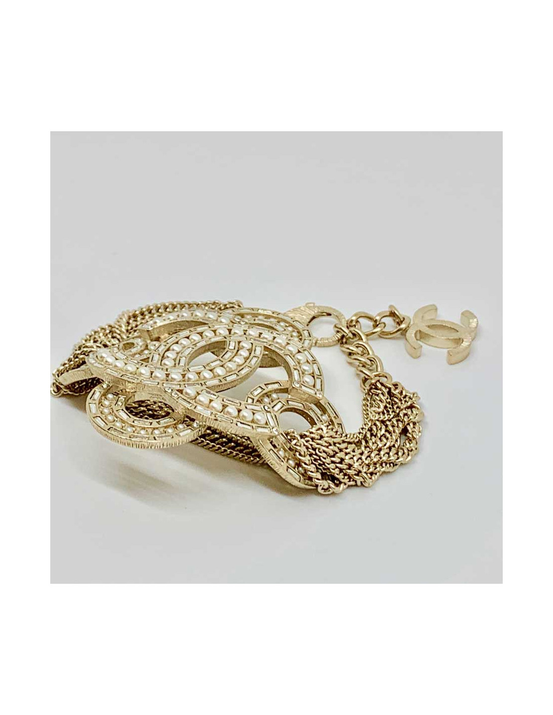 Le bracelet vient de la Maison CHANEL. Il se compose d'une chaîne multi-rang dorée avec comme élément central un CC serti de perles. Un autre CC doré pend en bout de chaîne. Pour un poignet sophistiqué tout en élégance.