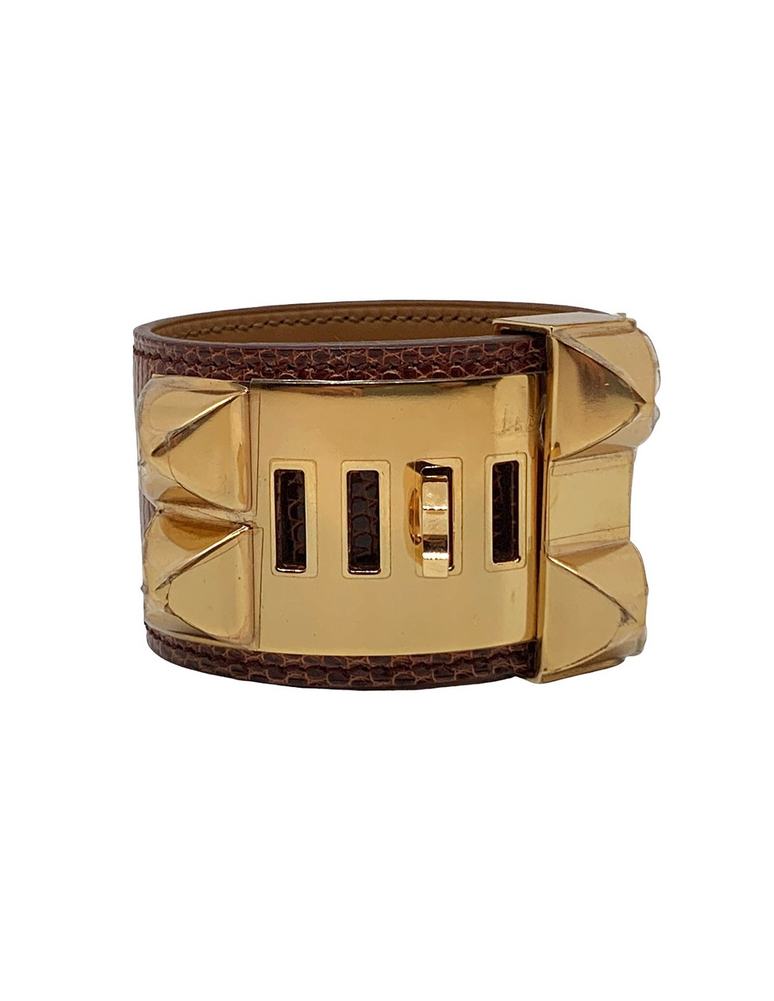 La manchette CDC est de la Maison HERMES. Un intemporel qui saura toujours donner une touche sophistiquée et rock à votre tenue. Elle représente un collier de chien, ici en cuir lisse de lézard de couleur étrusque (rouge brique/foncé). La manchette proposée ici a un accastillage en métal doré à l'or fin.