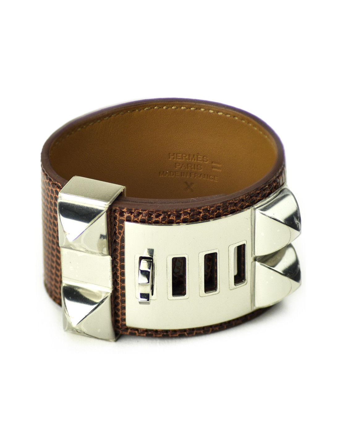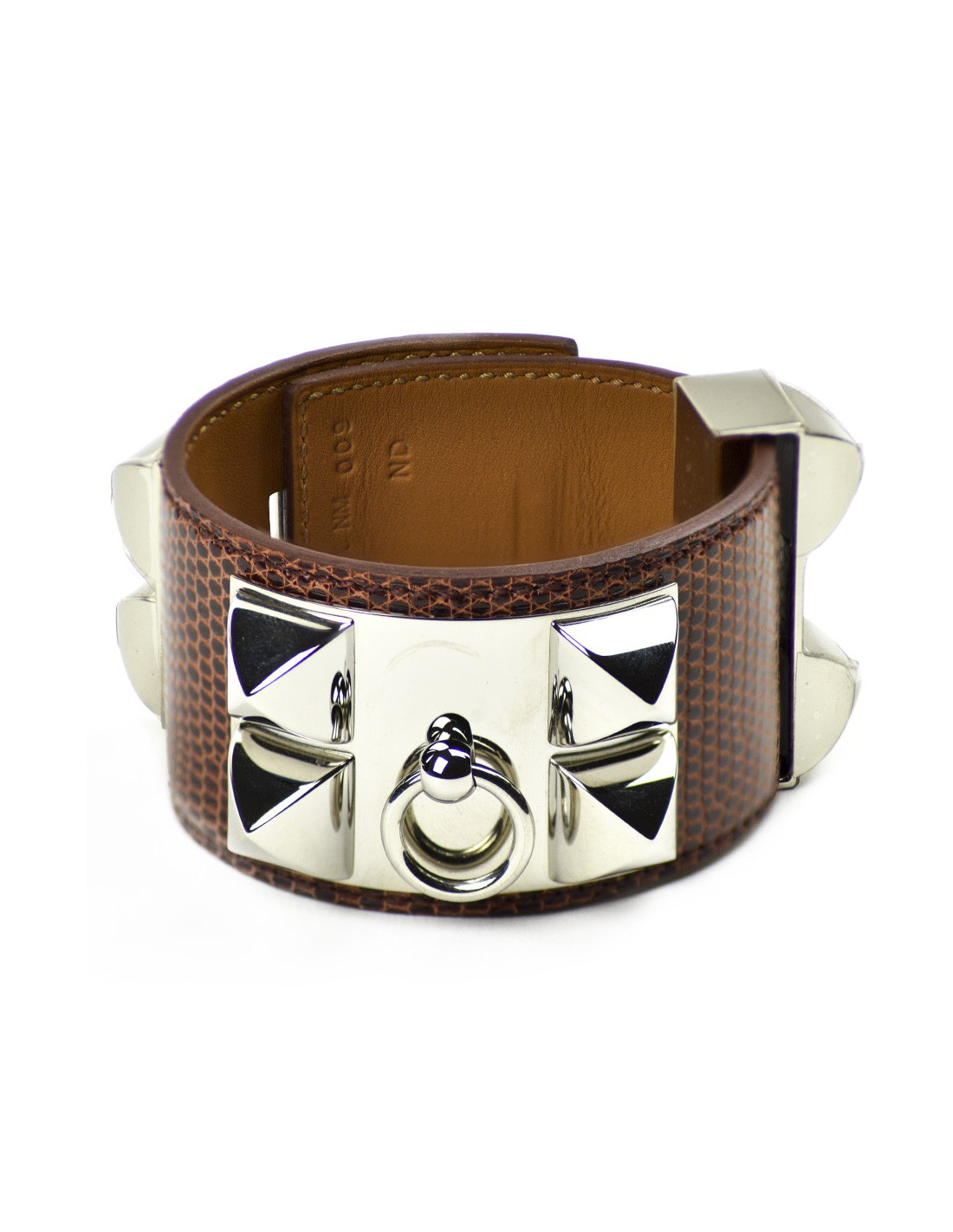 La manchette est un modèle intemporel issu de la Maison HERMES. Il représente un collier de chien en cuir de lézard niloticus lissé de couleur étrusque. L'accastillage de la manchette est en argent palladié.