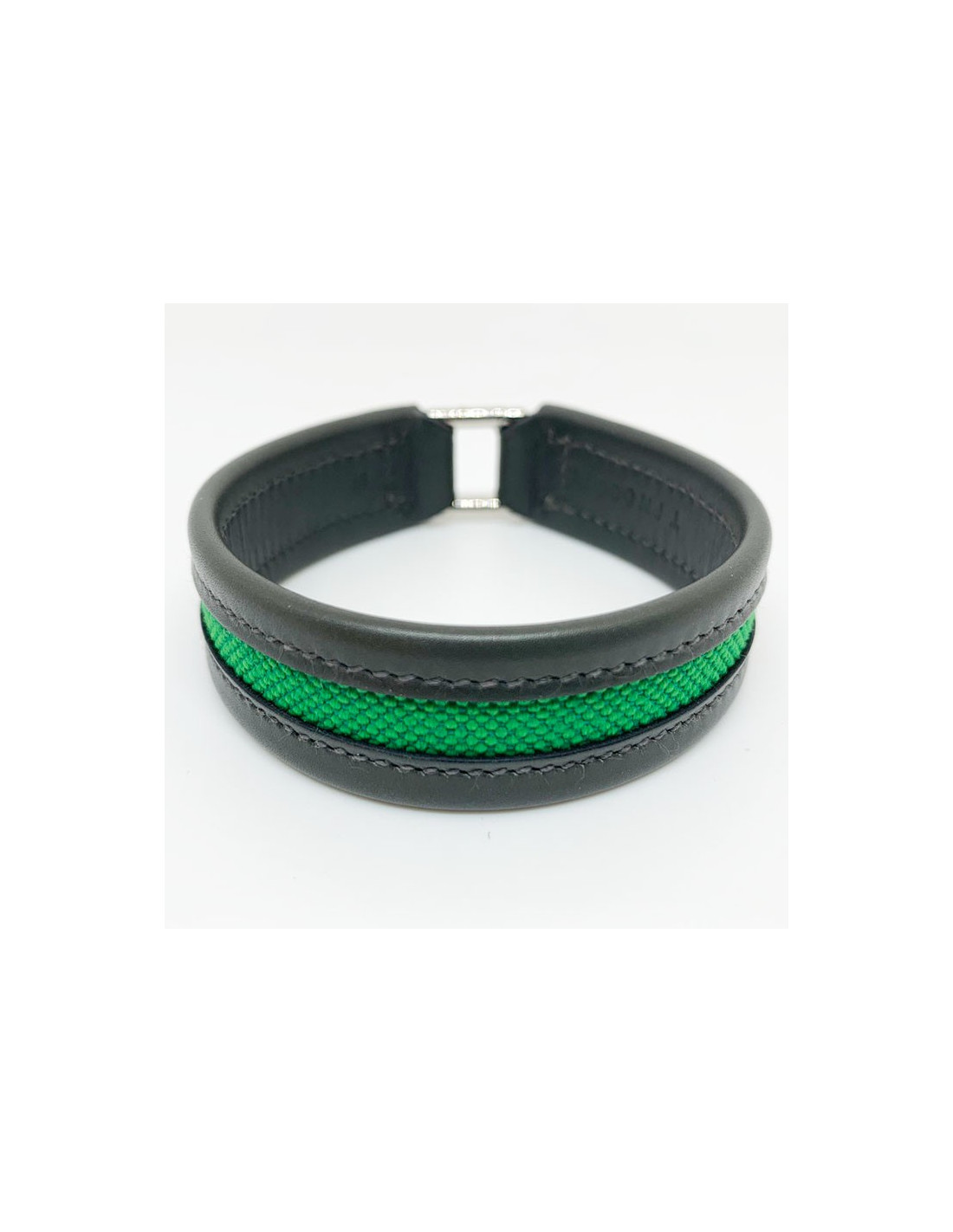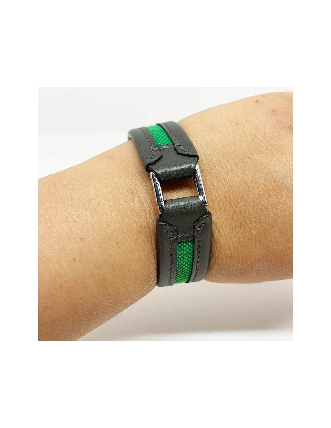 Le bracelet provient de la Maison HERMES. Il est tout en nuances de verts, puisqu'il est vert bronze sur le cuir de veau qui marque le contour, et vert anglais sur la toile du centre. Le fermoir est en laiton.