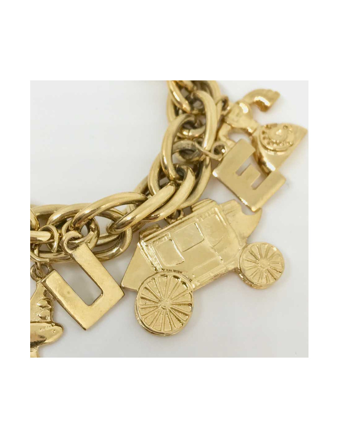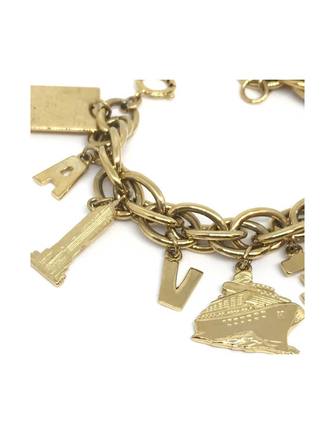 Le bracelet est composé de charms représentant un téléphone, une clef, un carosse, un avion, un ferry, et les lettres correspondant au mot AVENUE.