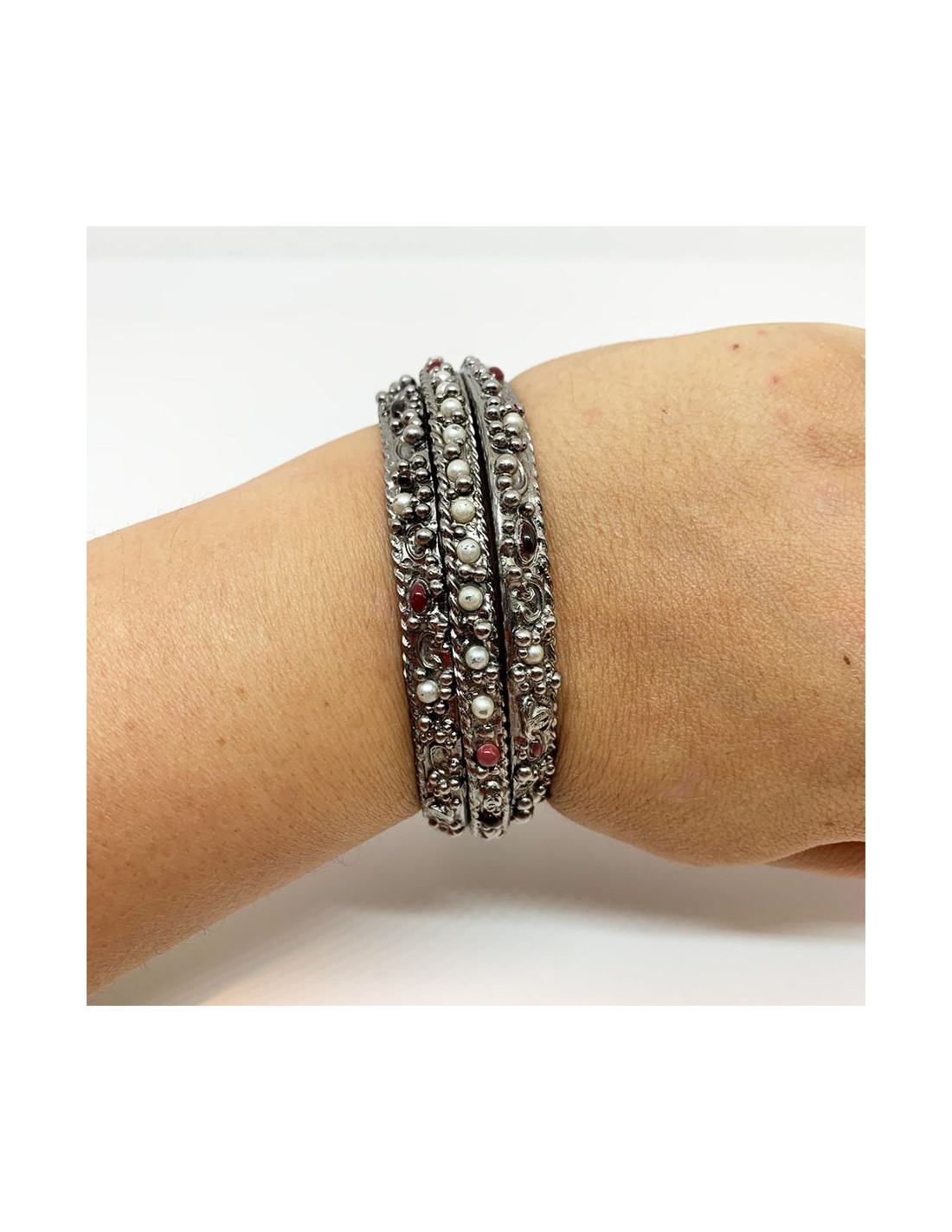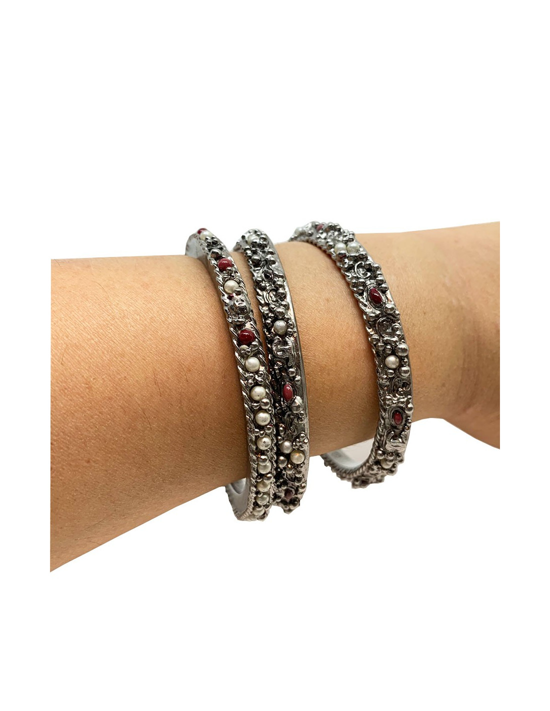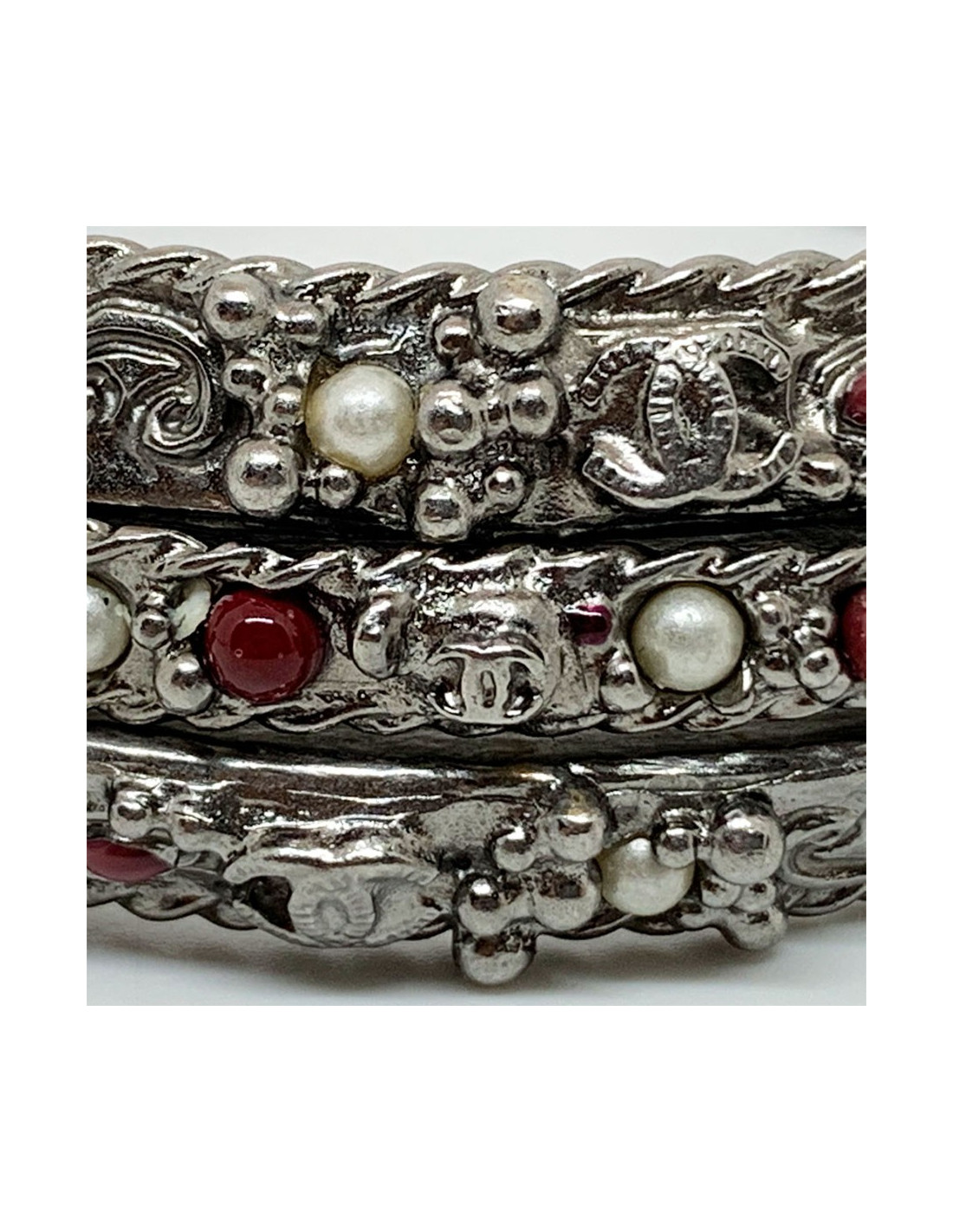 Les bracelets proviennent de la Maison CHANEL. Chaque bracelet est en métal argenté, incrusté de petites perles nacrées et rouges. Deux bracelets sont identiques et le troisième plus fin que les deux autres. Ils se portent en symétrie, le plus fin au milieu des deux identiques. Chaque bracelet comporte le fameux CC gravé dans le métal.