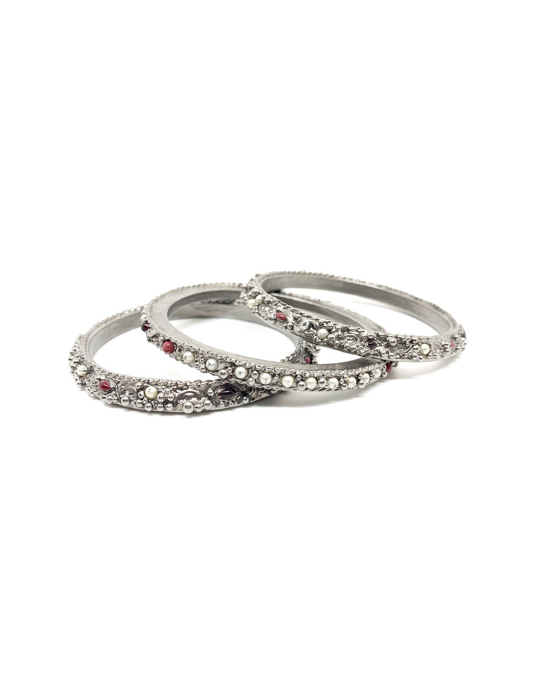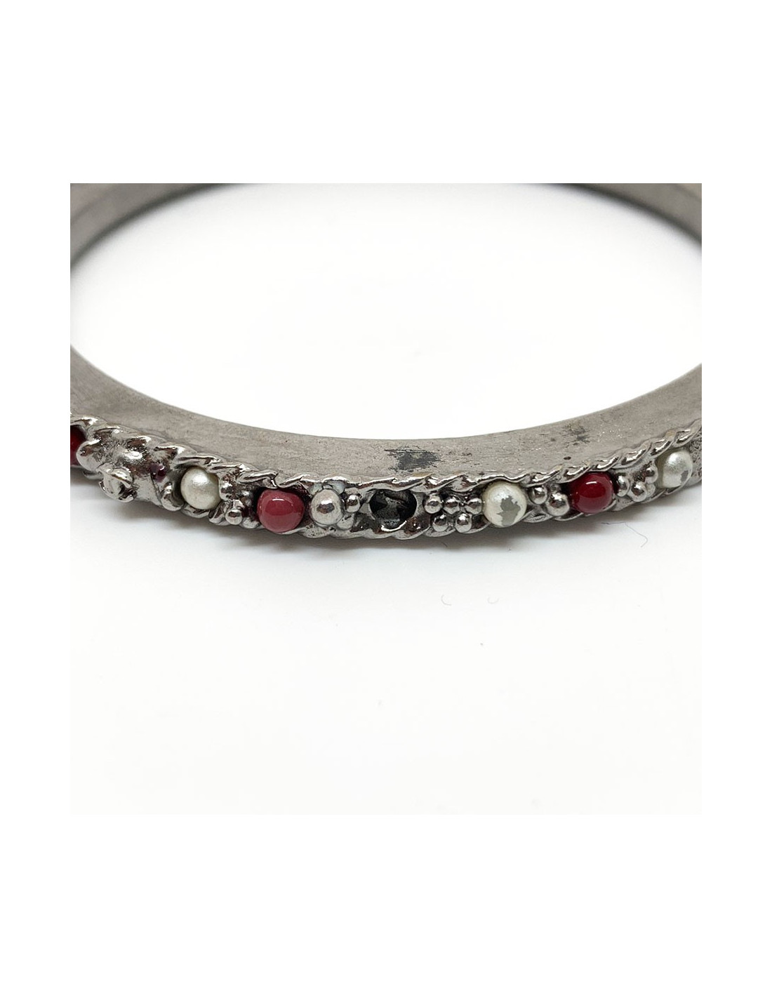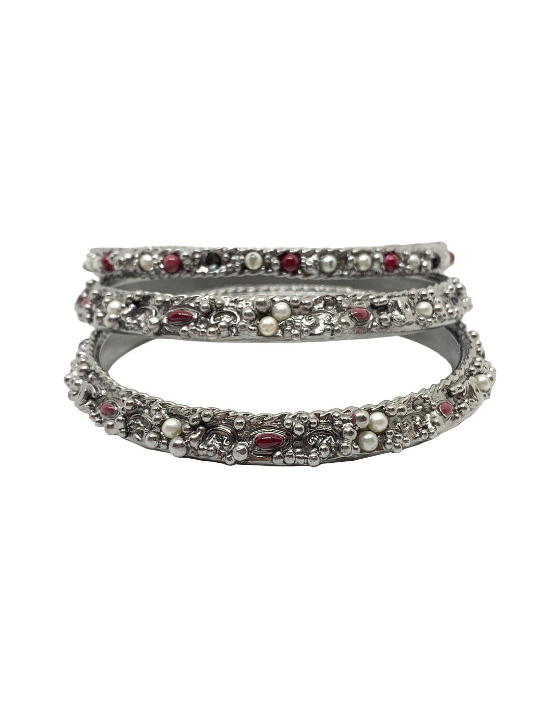 Les bracelets proviennent de la Maison CHANEL. Chaque bracelet est en métal argenté, incrusté de petites perles nacrées et rouges. Deux bracelets sont identiques et le troisième plus fin que les deux autres. Ils se portent en symétrie, le plus fin au milieu des deux identiques. Chaque bracelet comporte le fameux CC gravé dans le métal.