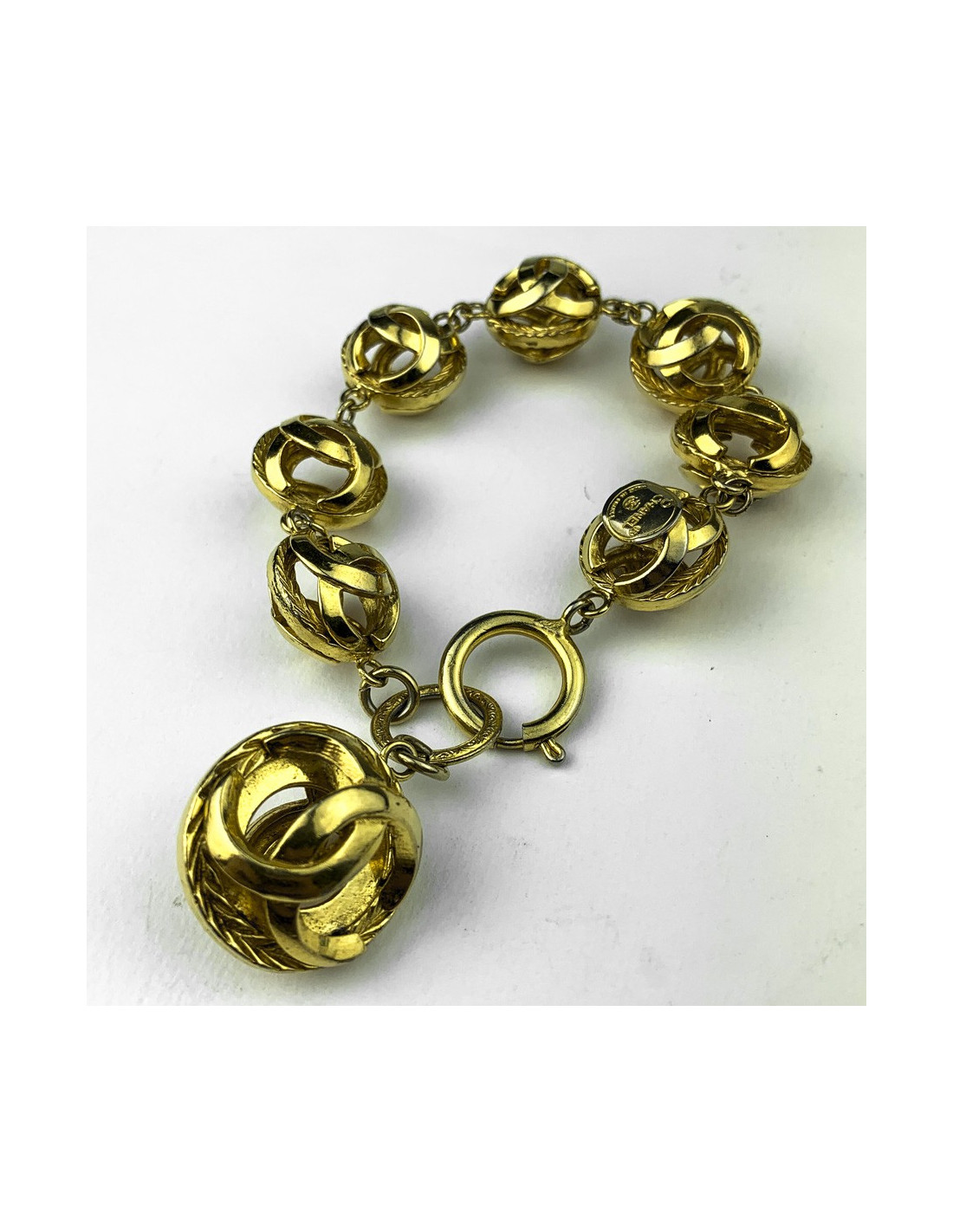Vintage. Le bracelet est signé CHANEL. Il représente une guirlande de 7 petites boules CC qui se succèdent ( chacune faisant 2cm de diamètre) et il se termine par une autre sphère de taille plus importante (3cm de diamètre).