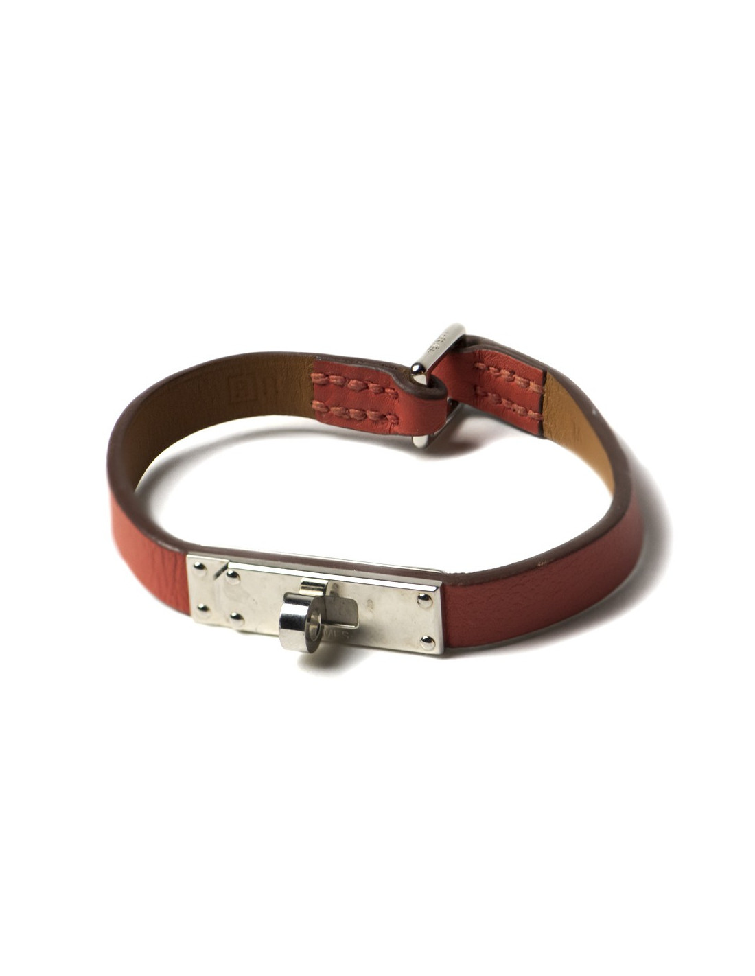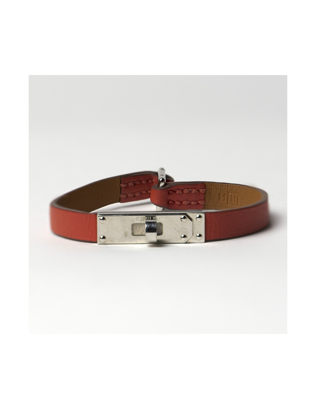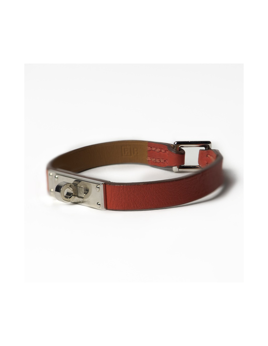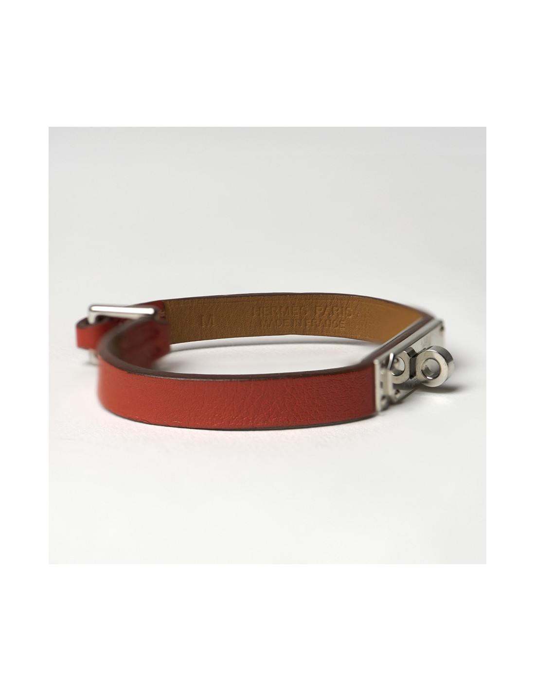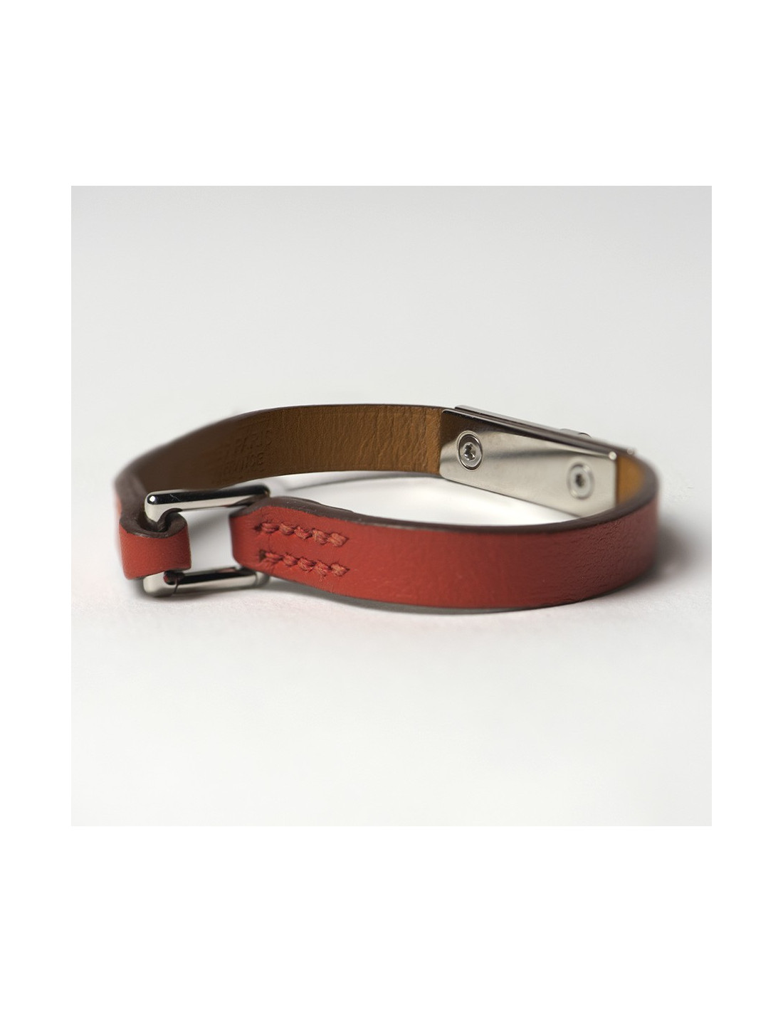 Bracelet tout en finesse avec le modèle Rivale de la Maison Hermès. Ici, en cuir orange et accastillage argent palladié. Très discret au poignet, il apportera une finition chic à votre look.