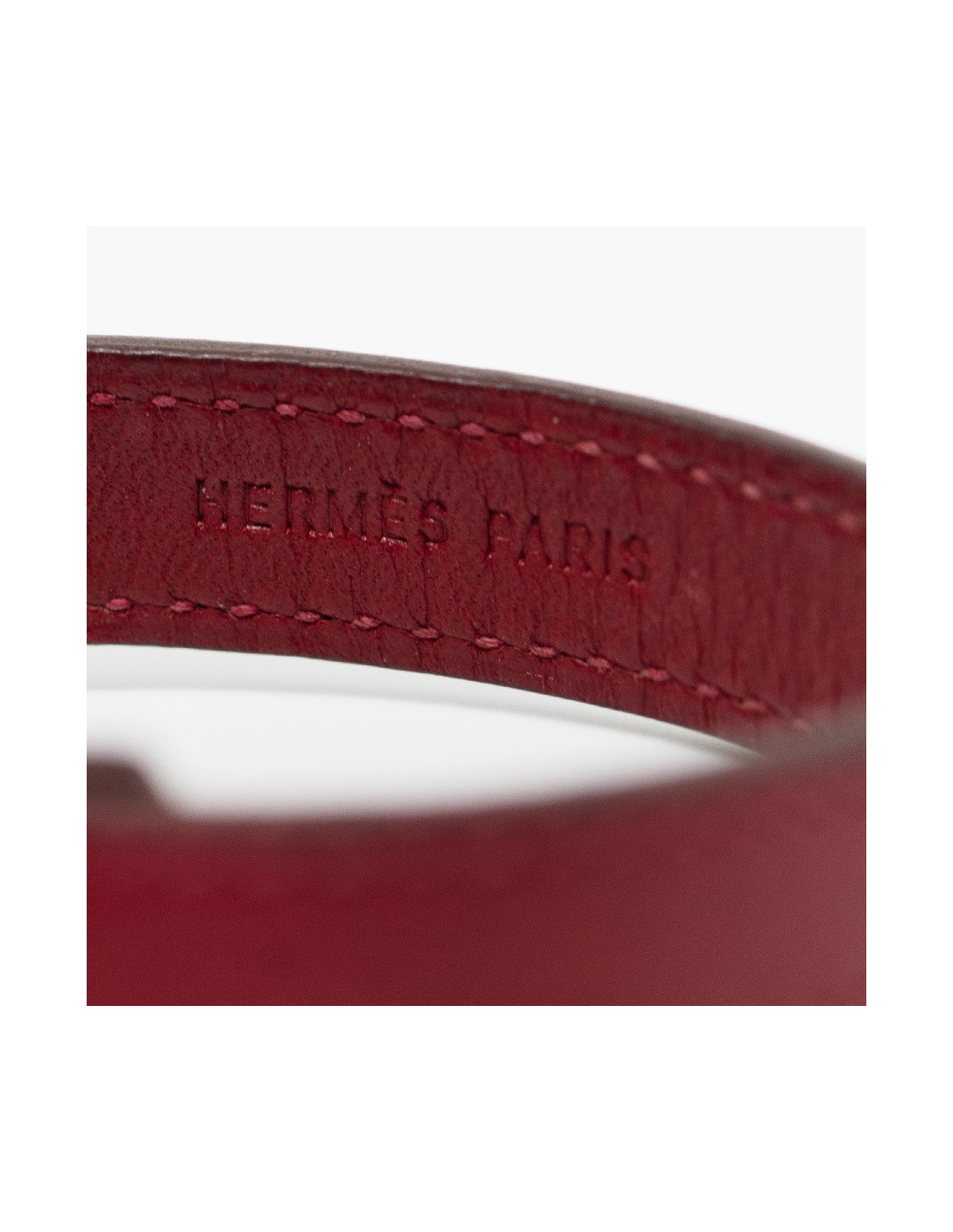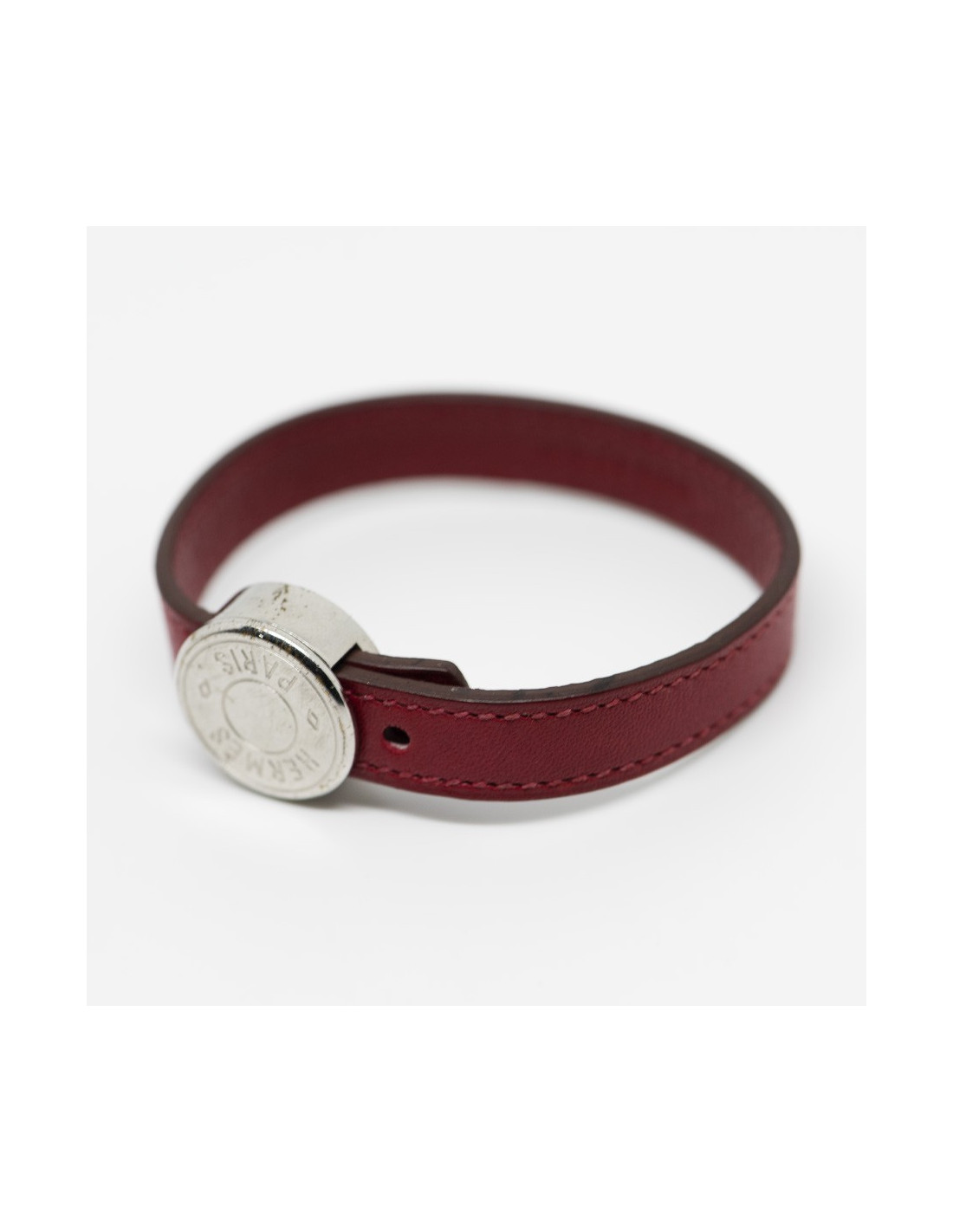 Le bracelet est un modèle "clou de selle" de la maison HERMES. Son cuir est de couleur rouge cerise et son fermoir clou de selle en métal argent palladié. Le clou comporte l'inscription HERMES PARIS.