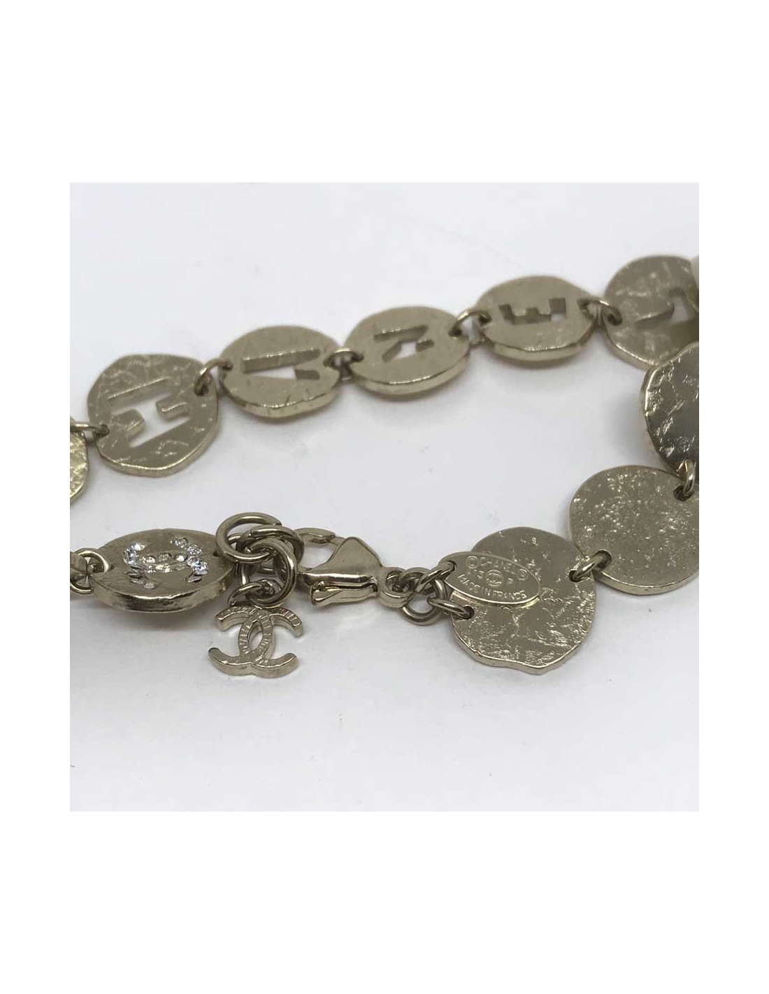 Ce bracelet CHANEL est composé de 13 cercles en métal frappé de couleur dorée. Les cercles du milieu du bracelet sont ajourés des lettres C, H, A, N, E, L pour former le mot CHANEL. Quatre cercles du bracelet sont strassés d'un double C. Le bracelet est agréable à porter, pas trop lourd, ni trop léger. Il peut se porter seul ou être accompagné d'autres bijoux Chanel, comme de belles perles.