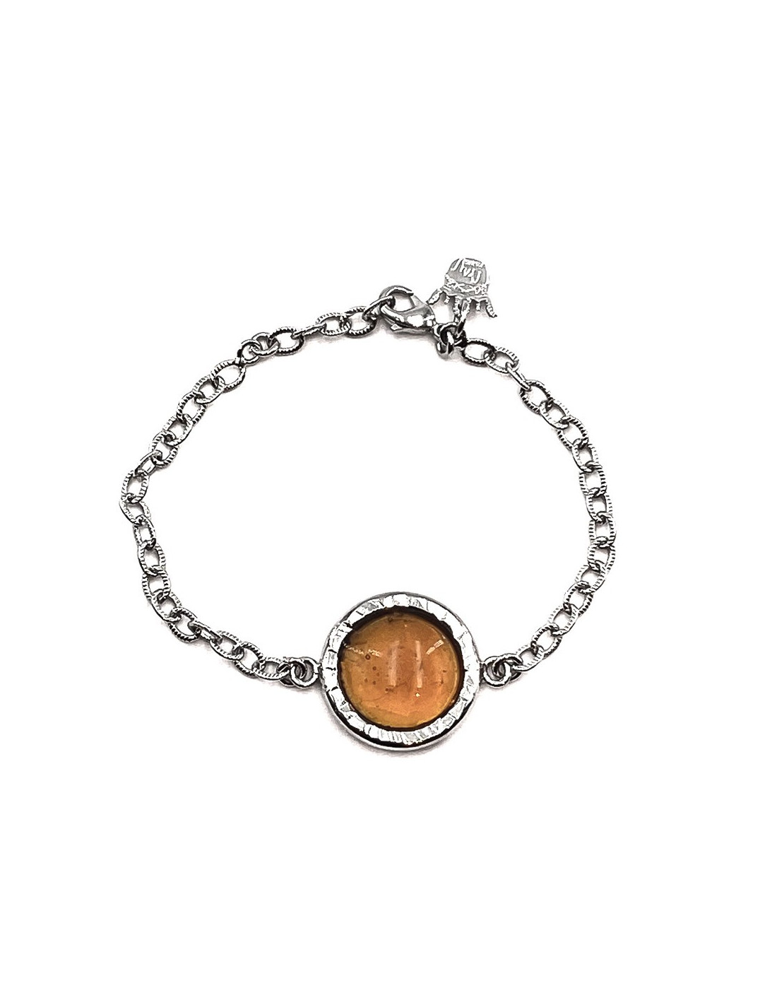 Le bracelet est de la Maison MARGUERITE DE VALOIS. Fait à la main par ses artisans bijoutiers français, il se présente sous forme de chaîne en métal argenté sur laquelle est placé un cabochon de forme ronde en pâte de verre couleur ambre. Soyez élégante en toute simplicité !