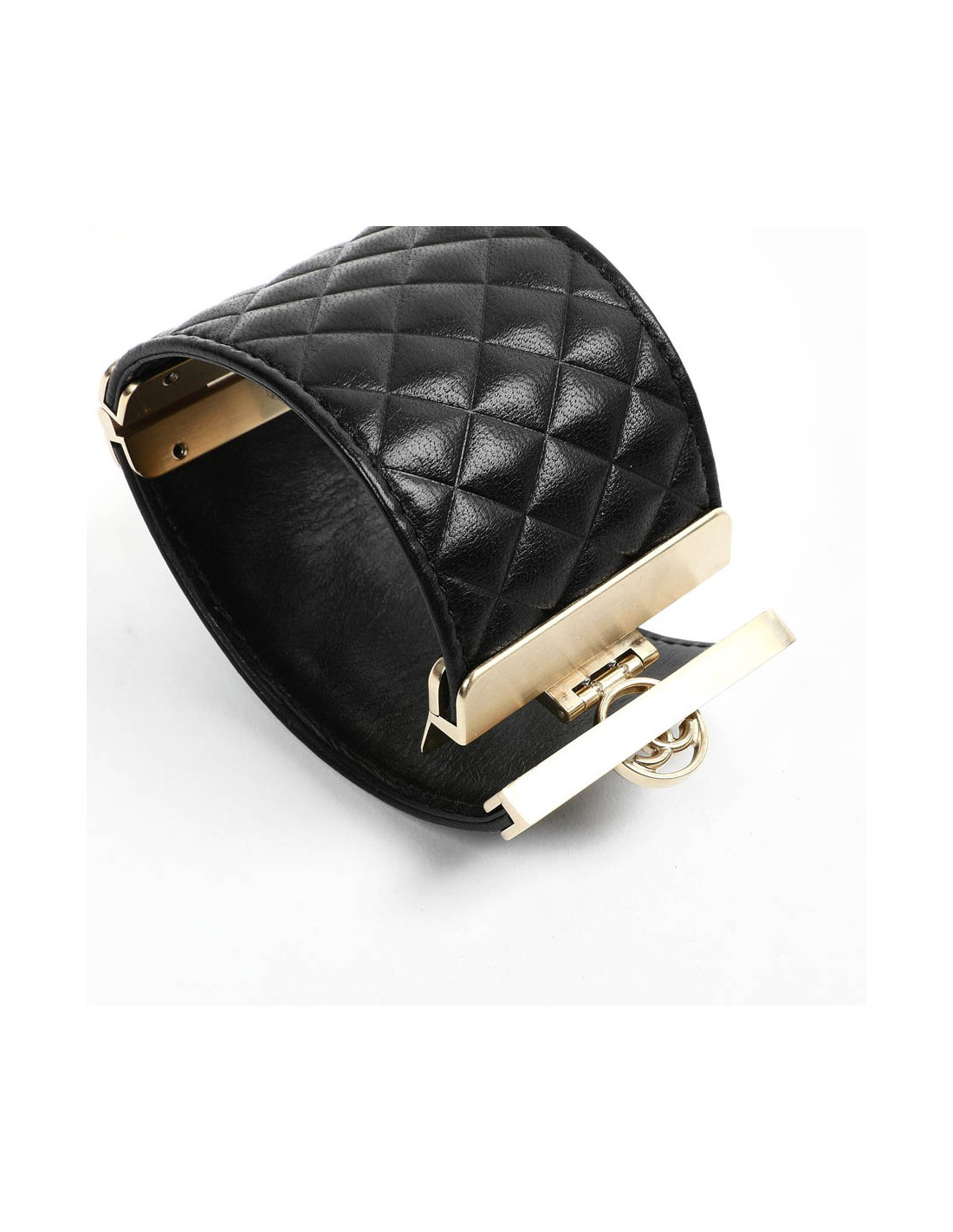 Ravissante manchette en cuir de veau matelassé noir. Les attributs sont or champagne.
