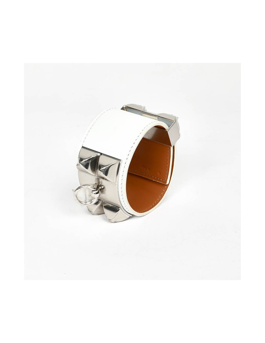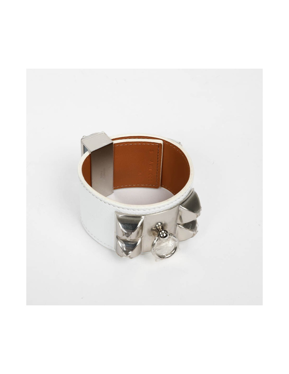 Incontournable manchette CDC, collier de chien cuir de veau epsom blanc. Attributs argent. Il n'a jamais été porté.Elle mesure 21,5 cm. La longueur la plus petite est de 15,5cm.