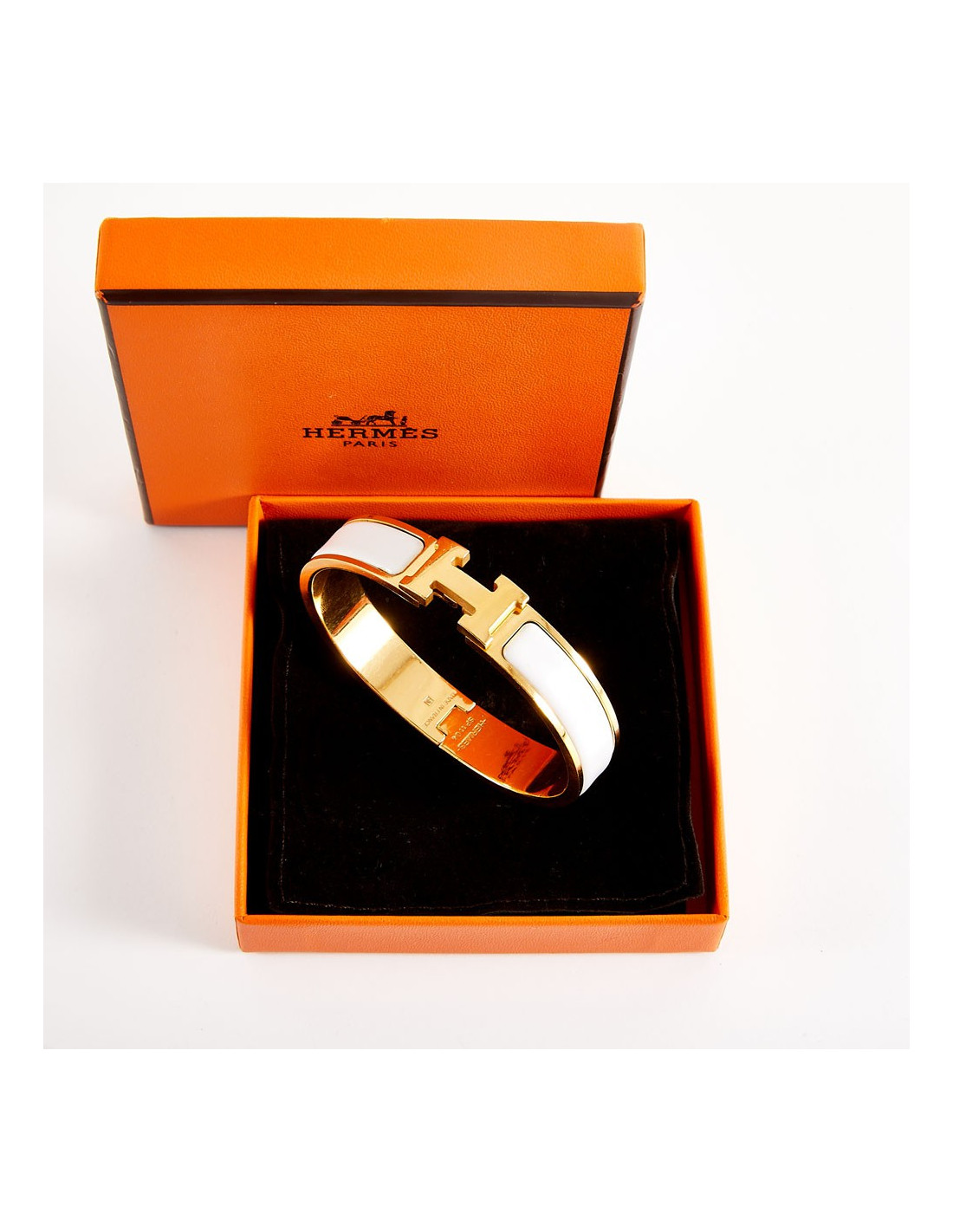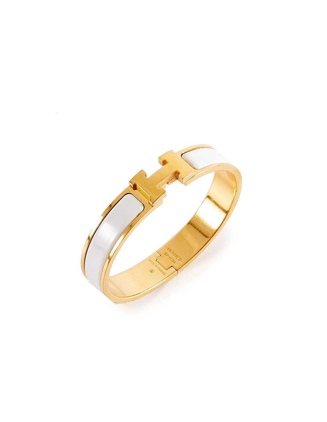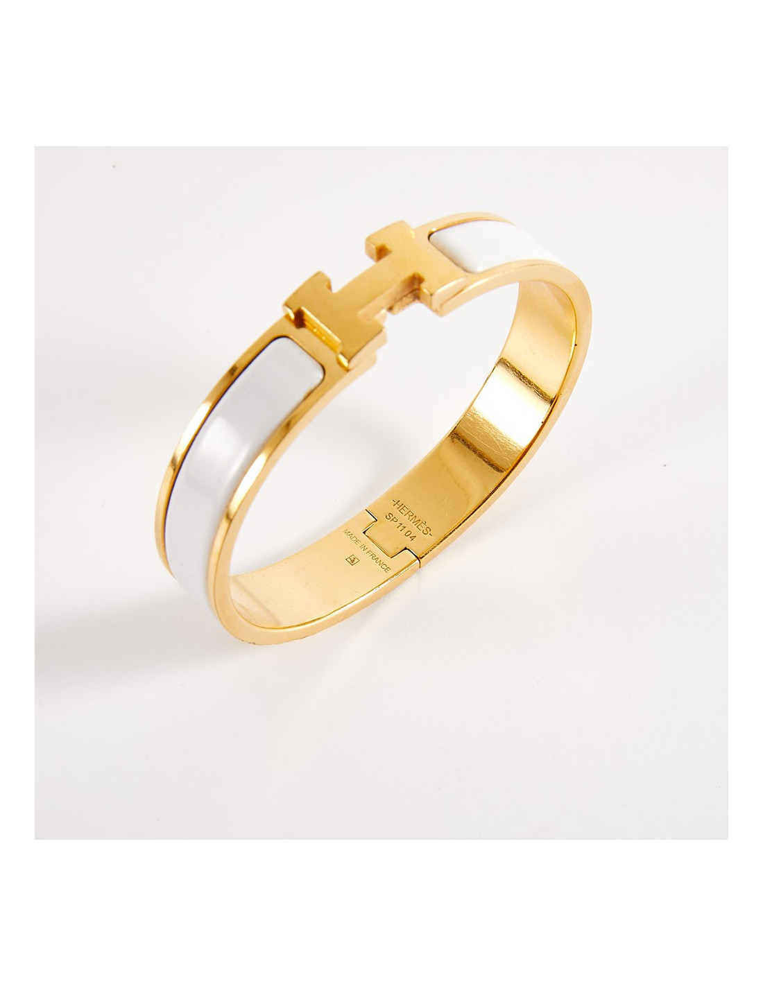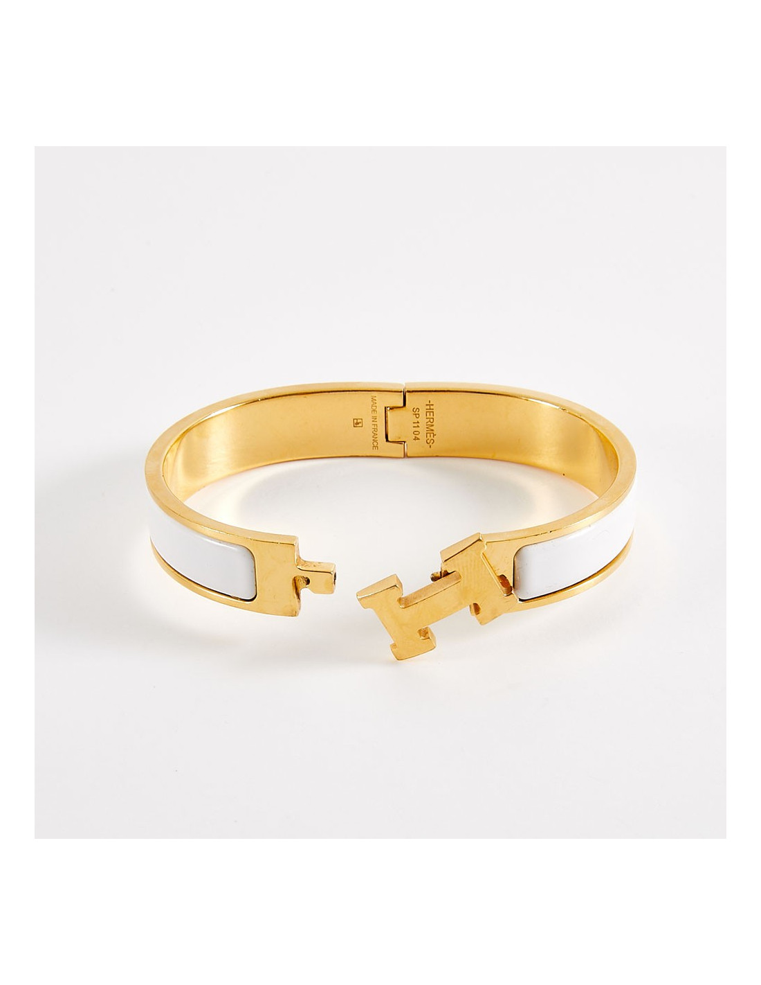 Iconique bracelet clic clac Hermès, en émail blanc et bijouterie dorée avec micro rayures sur tout le bracelet, celui-ci ayant été porté.