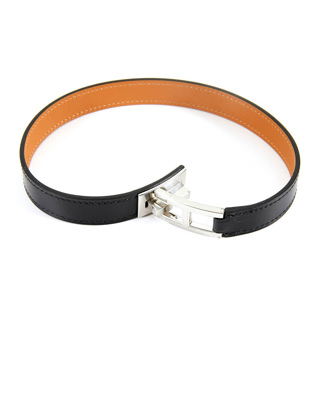 Manchette en cuir de veau box noir, doublé en cuir gold. La bijouterie est argent palladié, les plastiques sont présents. Afin d'ouvrir le fermoir, il suffit d'appuyer sur la partie saillante.