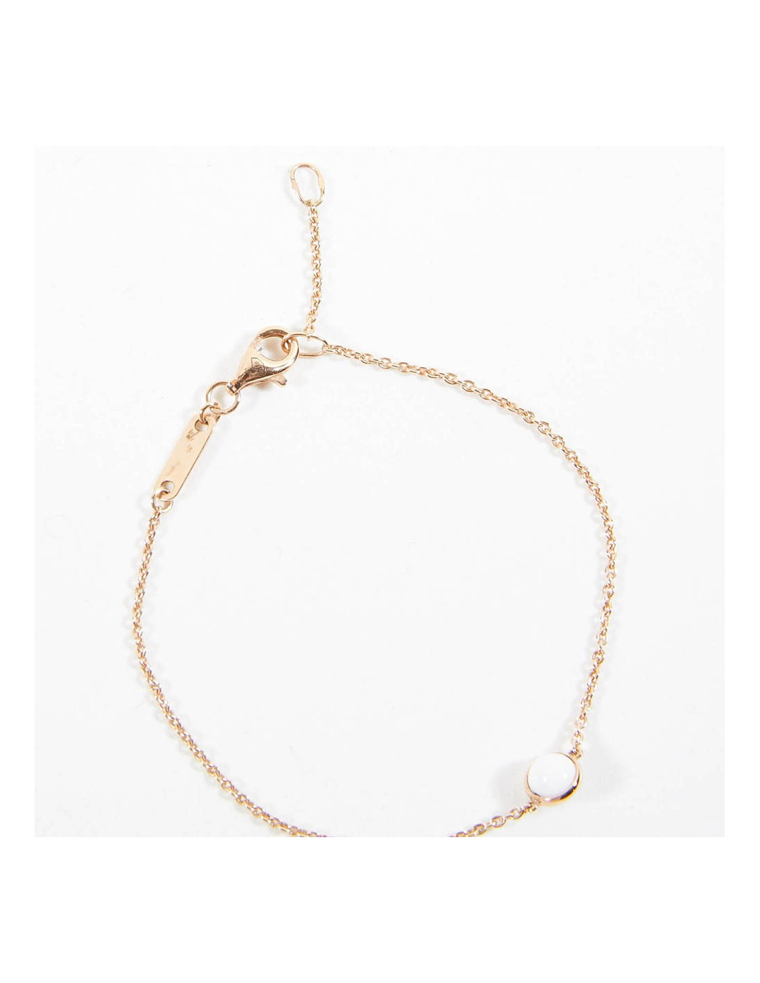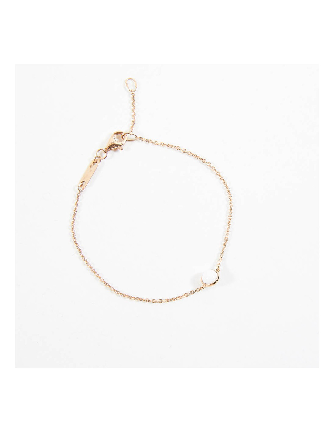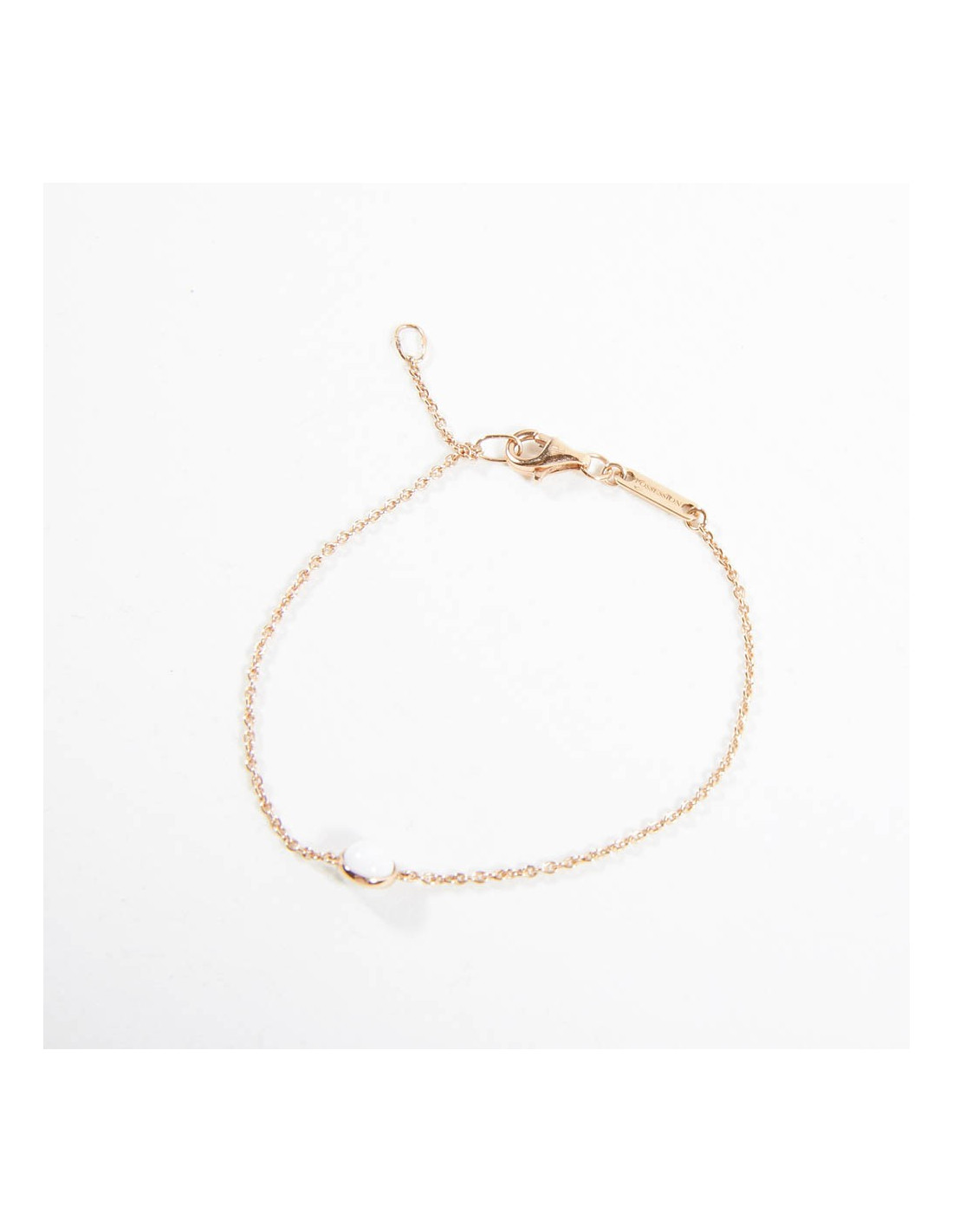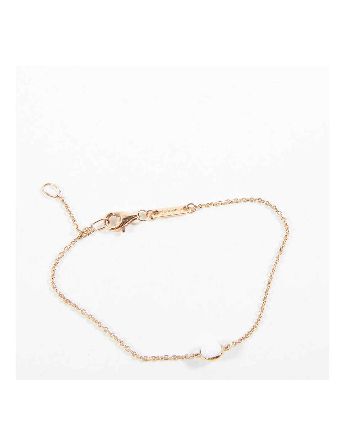 Ce bracelet est en or rose. Or 18K. C'est une fine chaîne. Il est orné d'une bille en calcédoine. Il a sa plaque avec l'inscription "Possession".