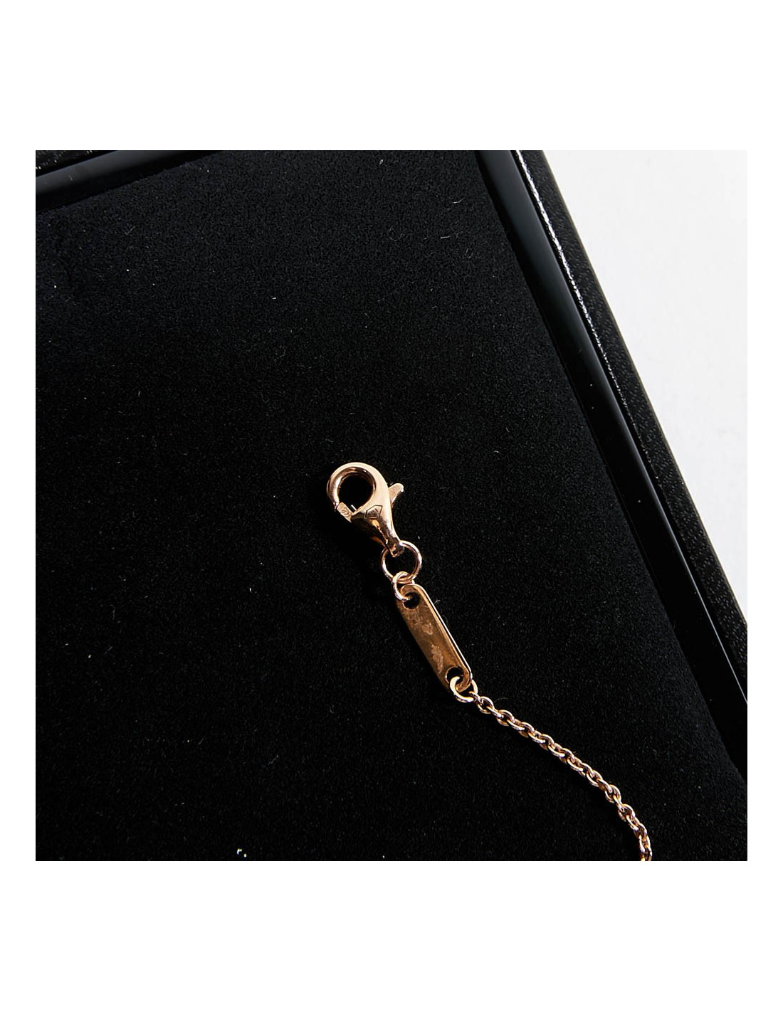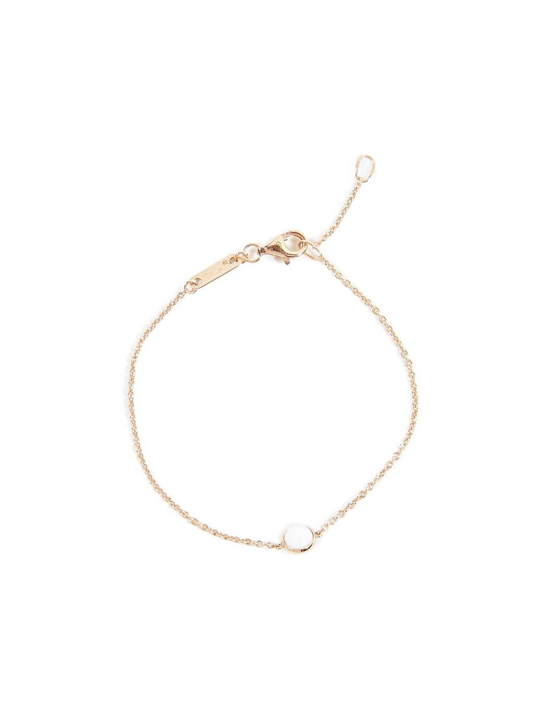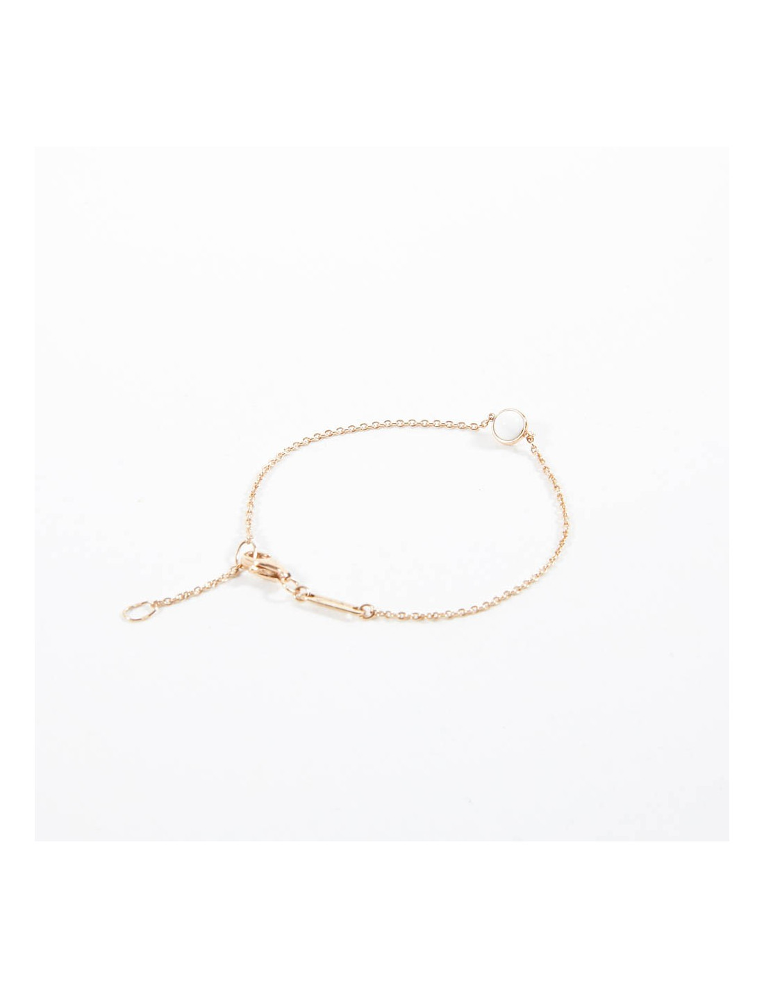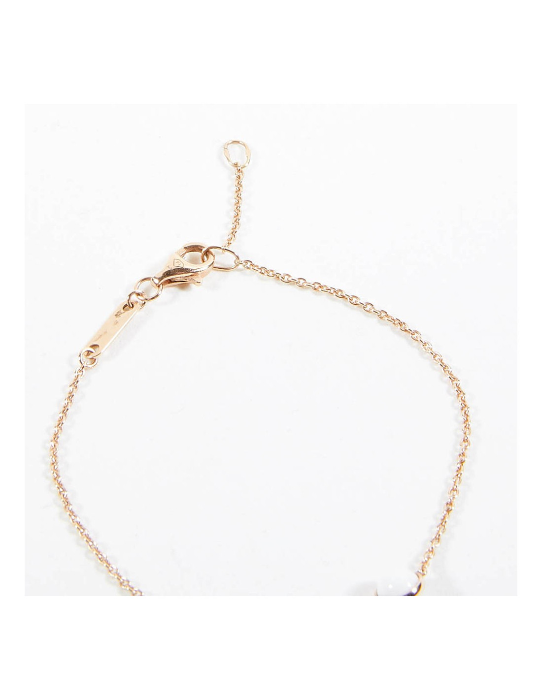 Ce bracelet est en or rose. Or 18K. C'est une fine chaîne. Il est orné d'une bille en calcédoine. Il a sa plaque avec l'inscription "Possession".