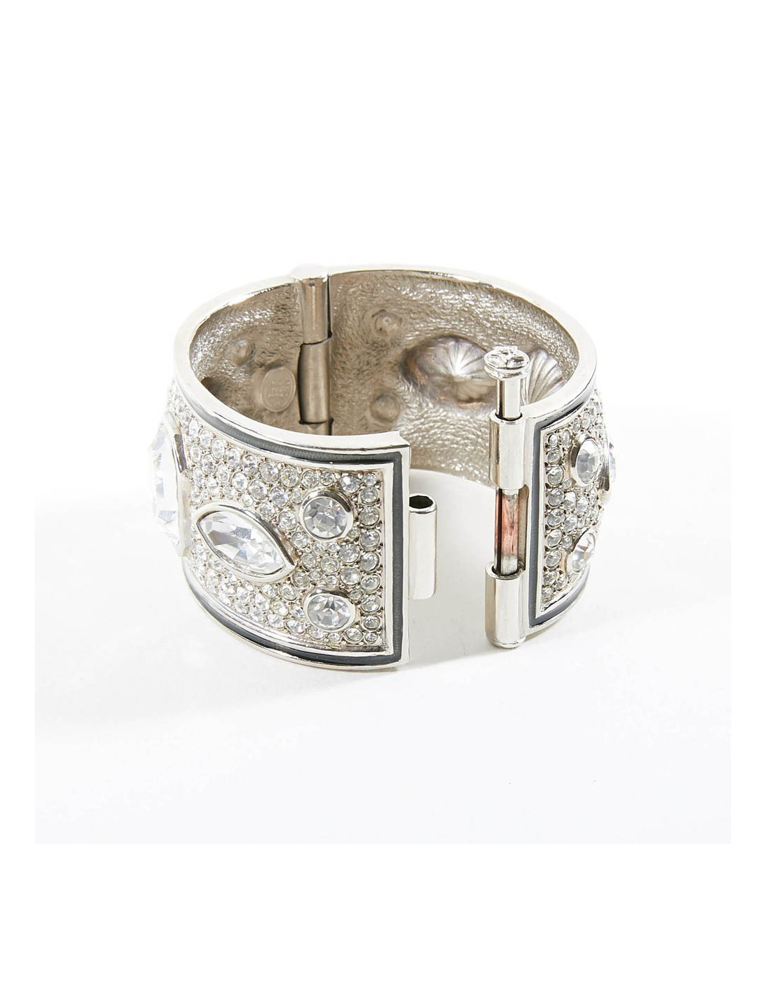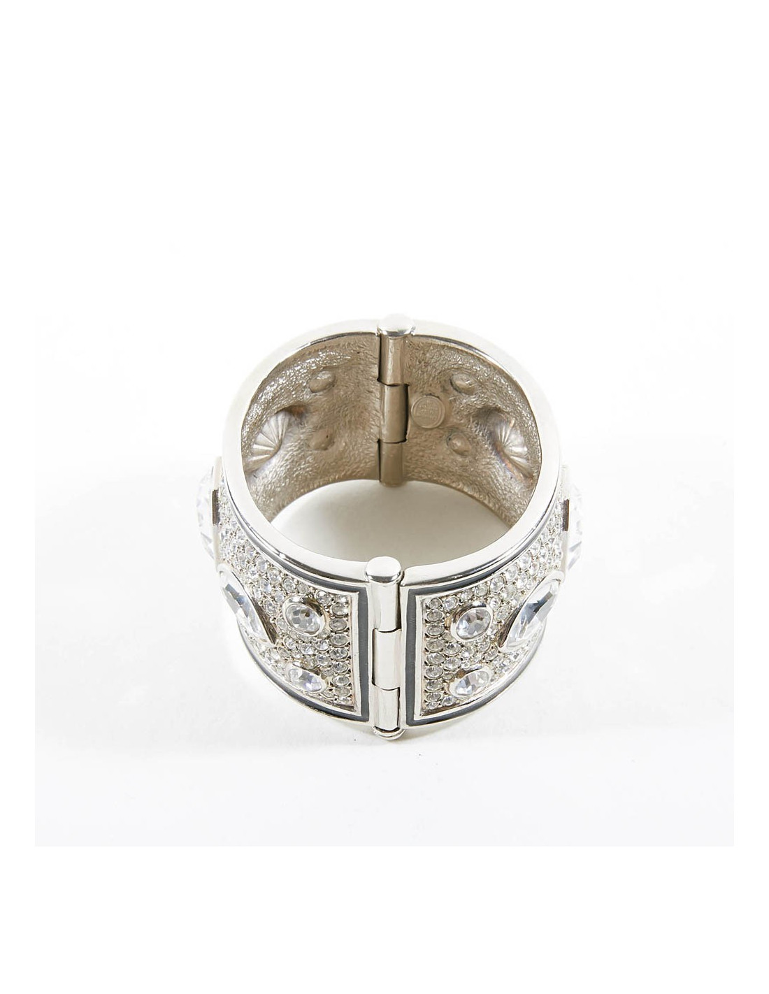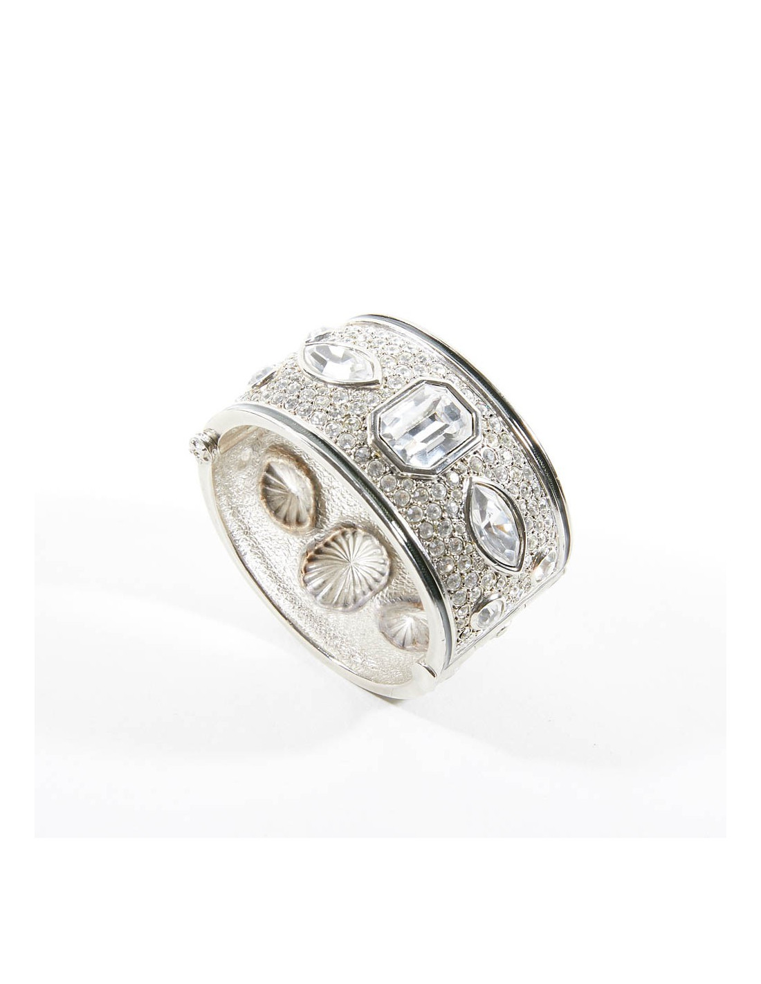 On dirait un bracelet de haute joaillerie, tant il est bien réalisé. Cette manchette est sertie de strass et cabochons en cristal. On le date de l'époque de Gianfranco Ferré.