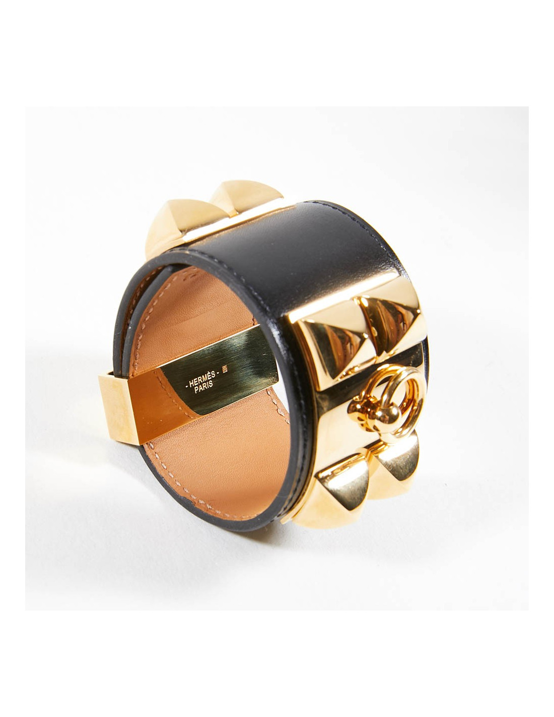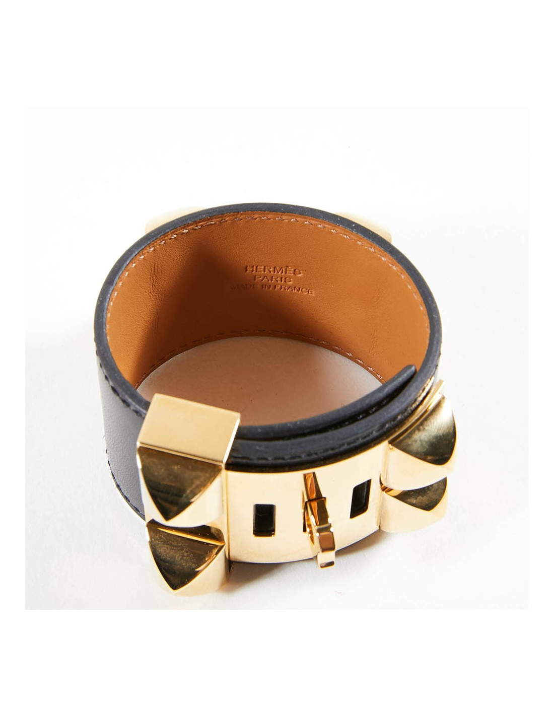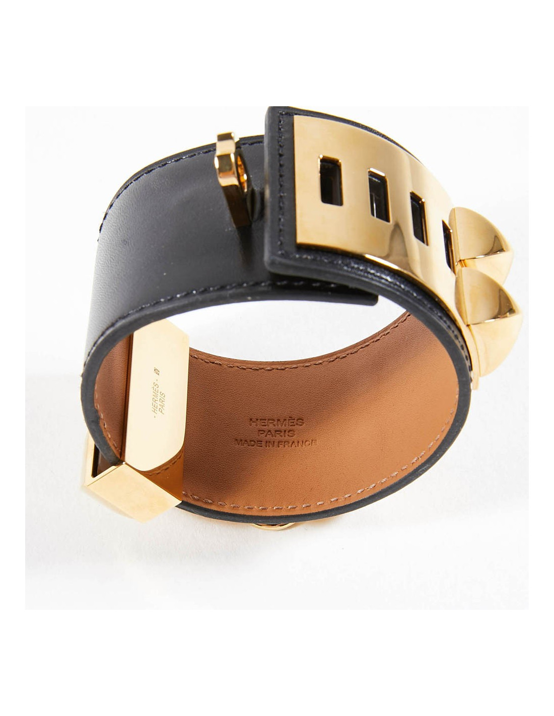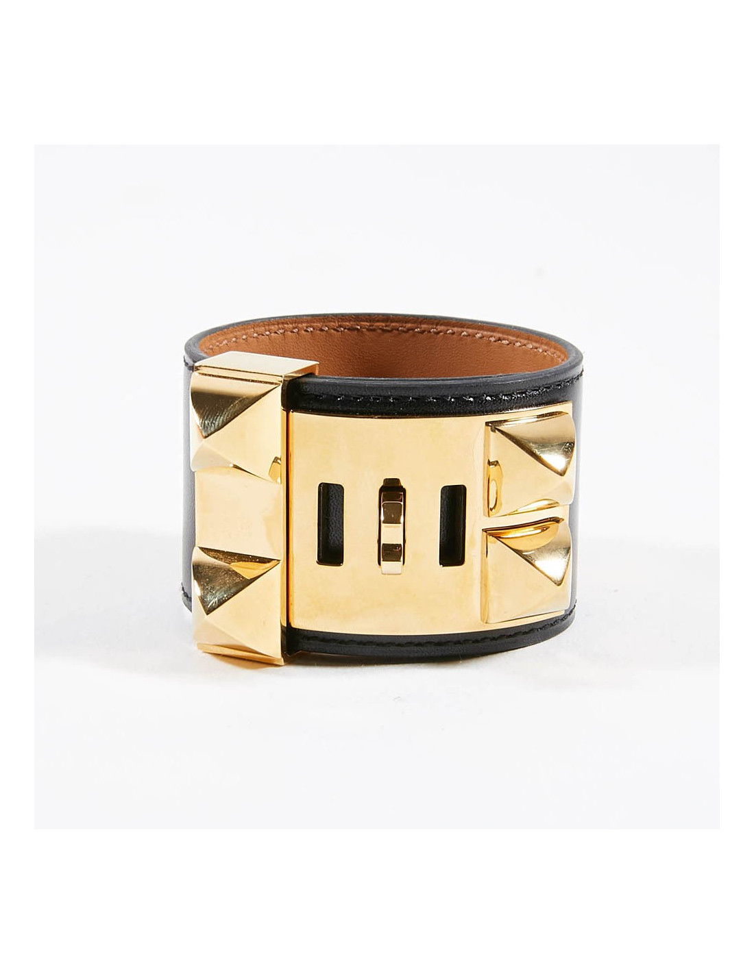 Manchette ou bracelet Hermes en cuir de veau Box. C'est le modèle CDC collier de chien clouté Médor. Les finitions sont en plaqué or.
