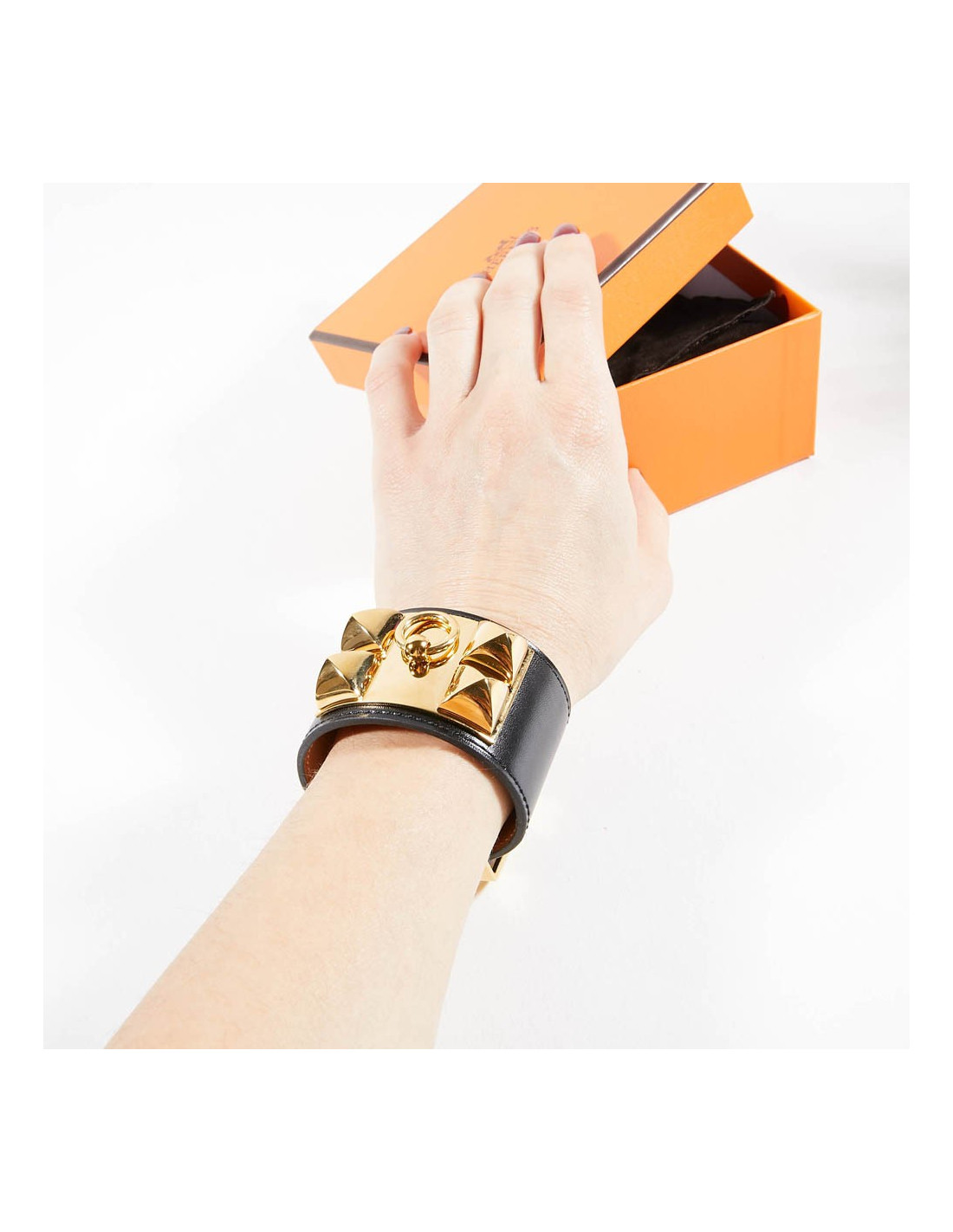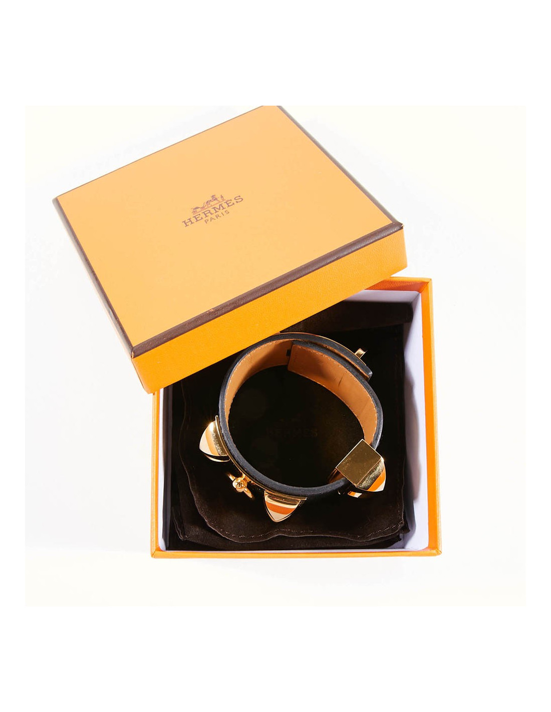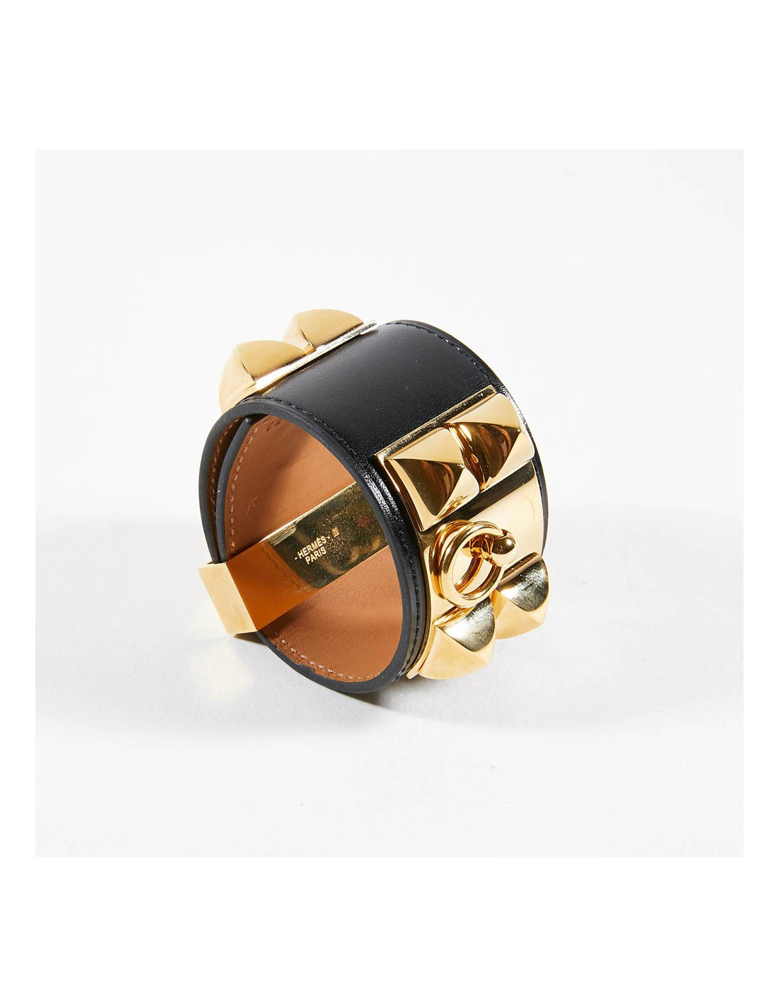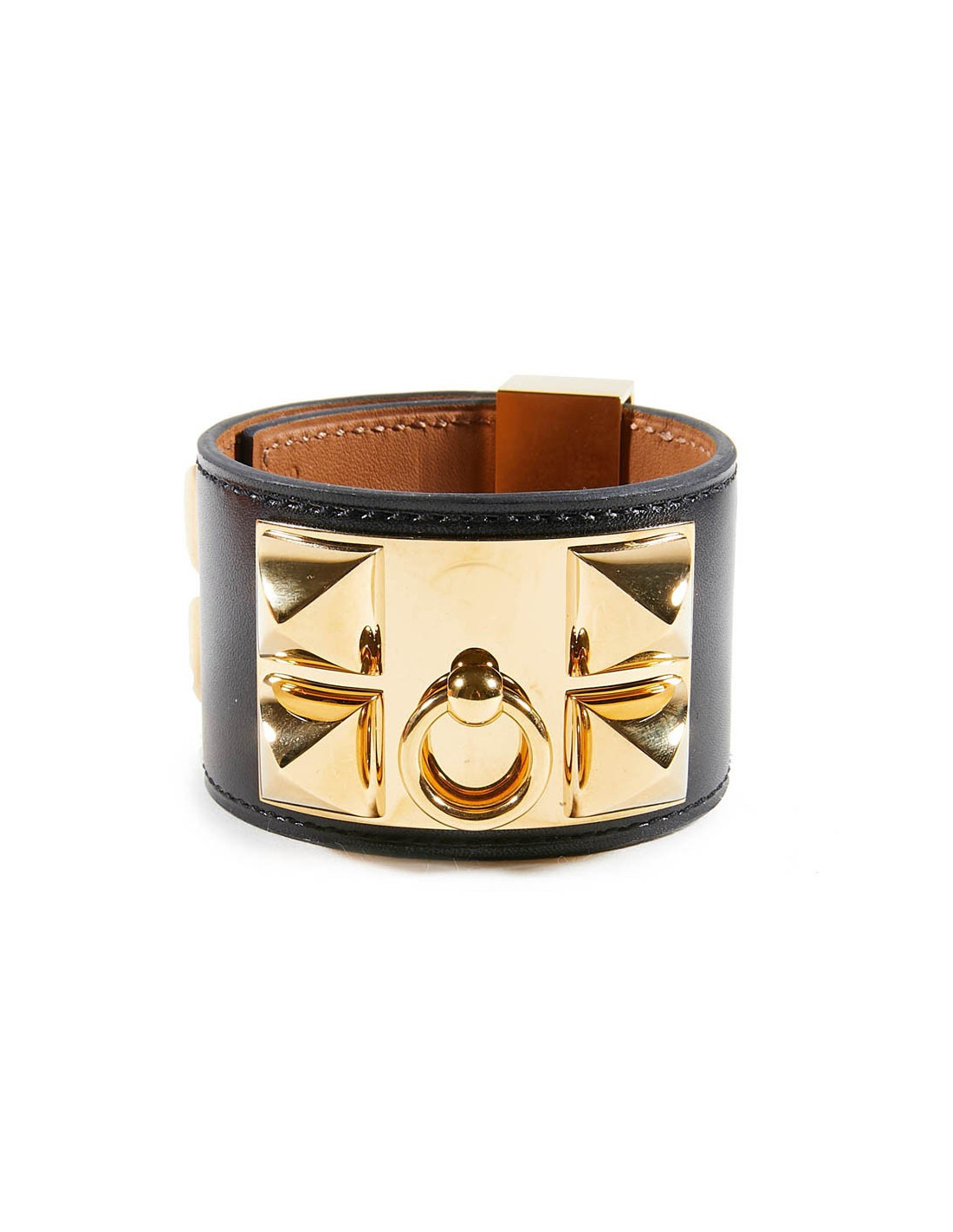 Manchette ou bracelet Hermes en cuir de veau Box. C'est le modèle CDC collier de chien clouté Médor. Les finitions sont en plaqué or.