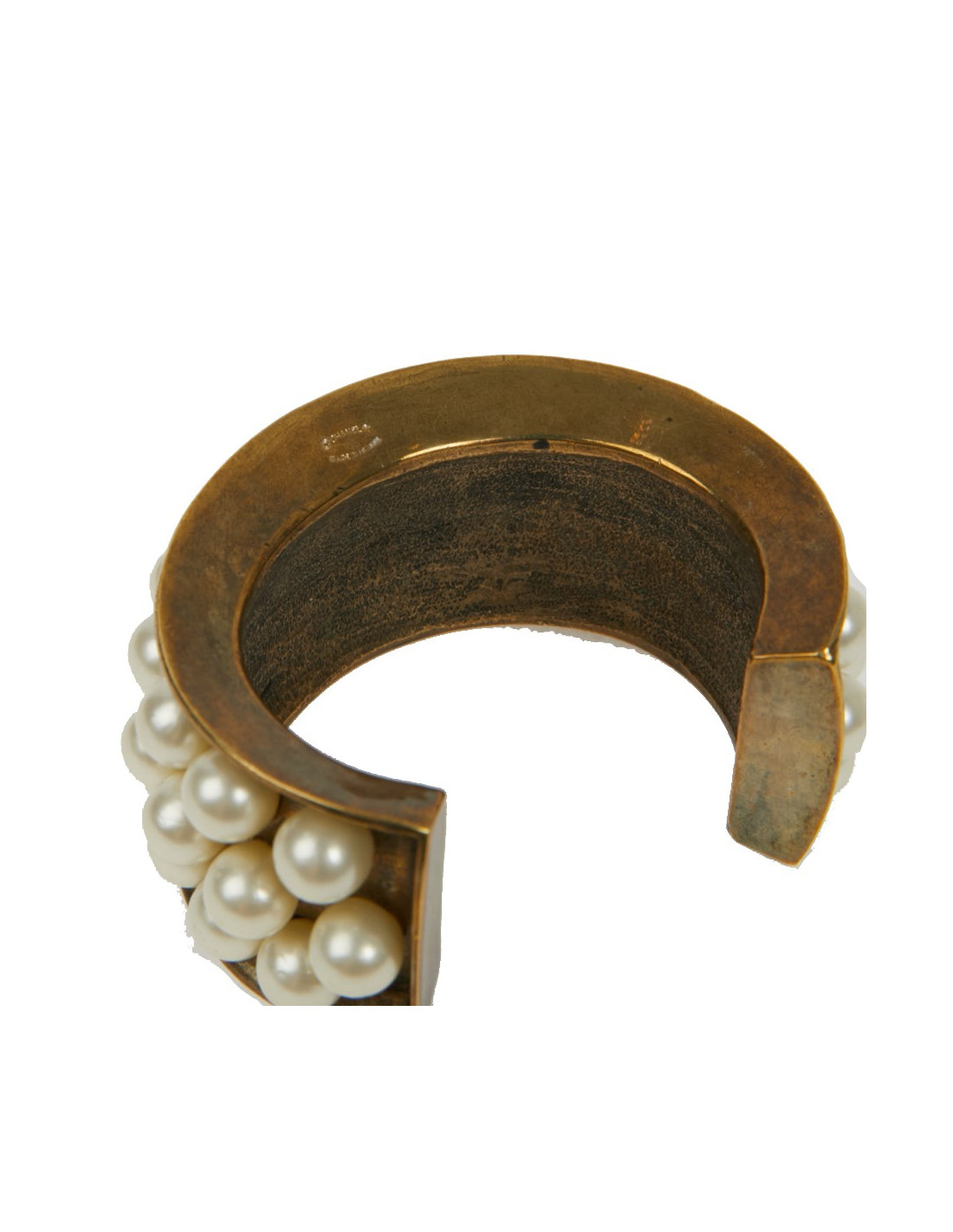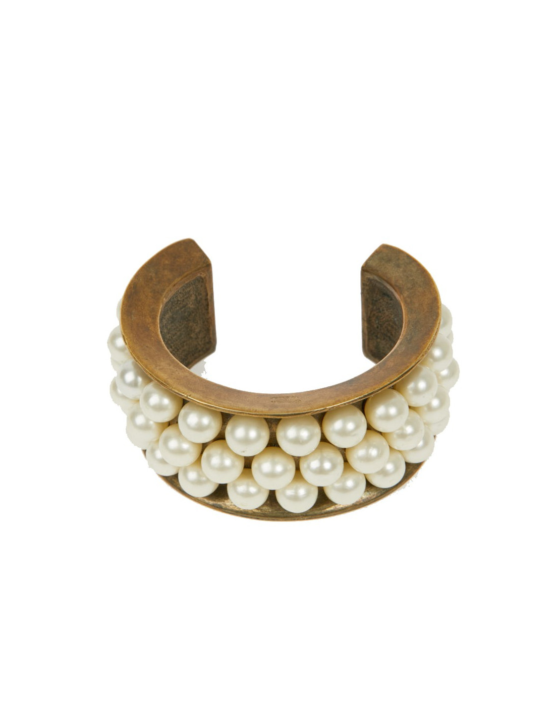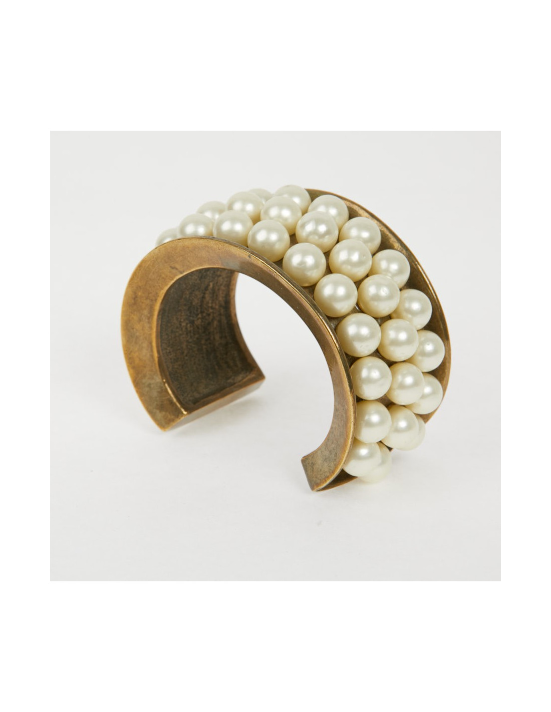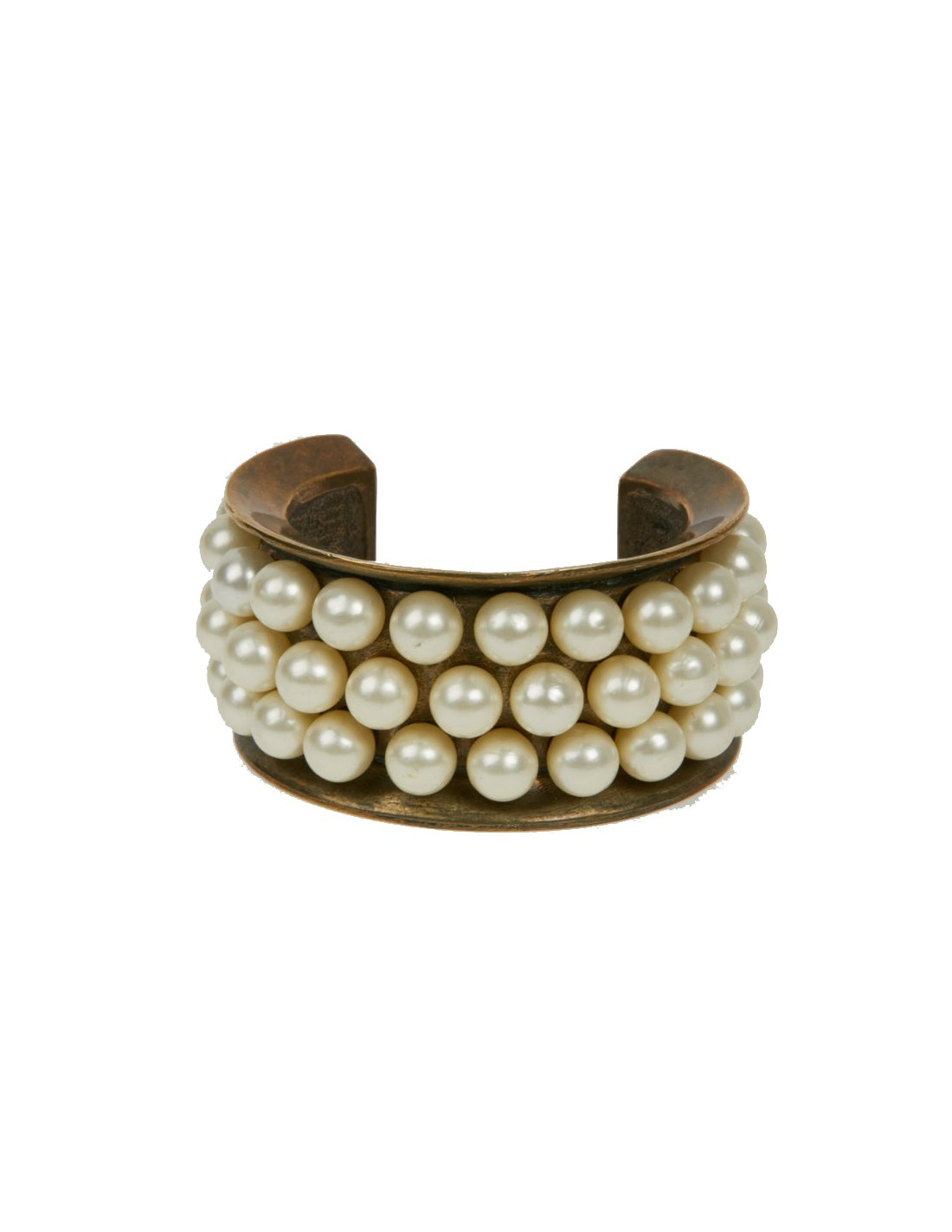 Vintage. Superbe bijou en très bon état de la Maison CHANEL composé de perles de verres nacrées collées, sur un manchette effet doré vieilli cuivré. Cette manchette a les dimensions suivantes : largeur de l’ovale au plus grand 5.9 cm, hauteur 3.5 cm, écartement pour l'ouverture 3.9 cm, longueur intérieure du bracelet 13 cm, épaisseur du replis 1 cm.