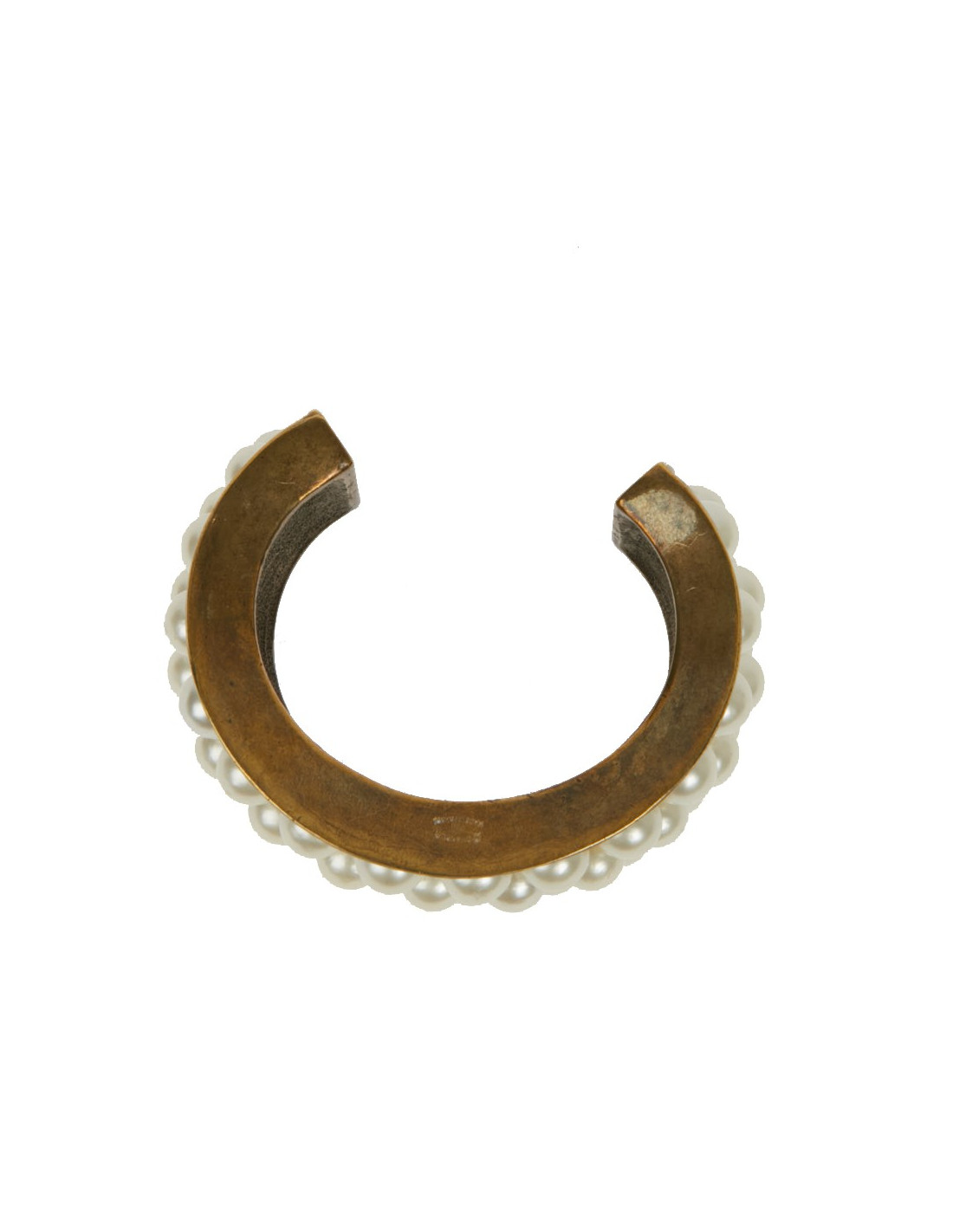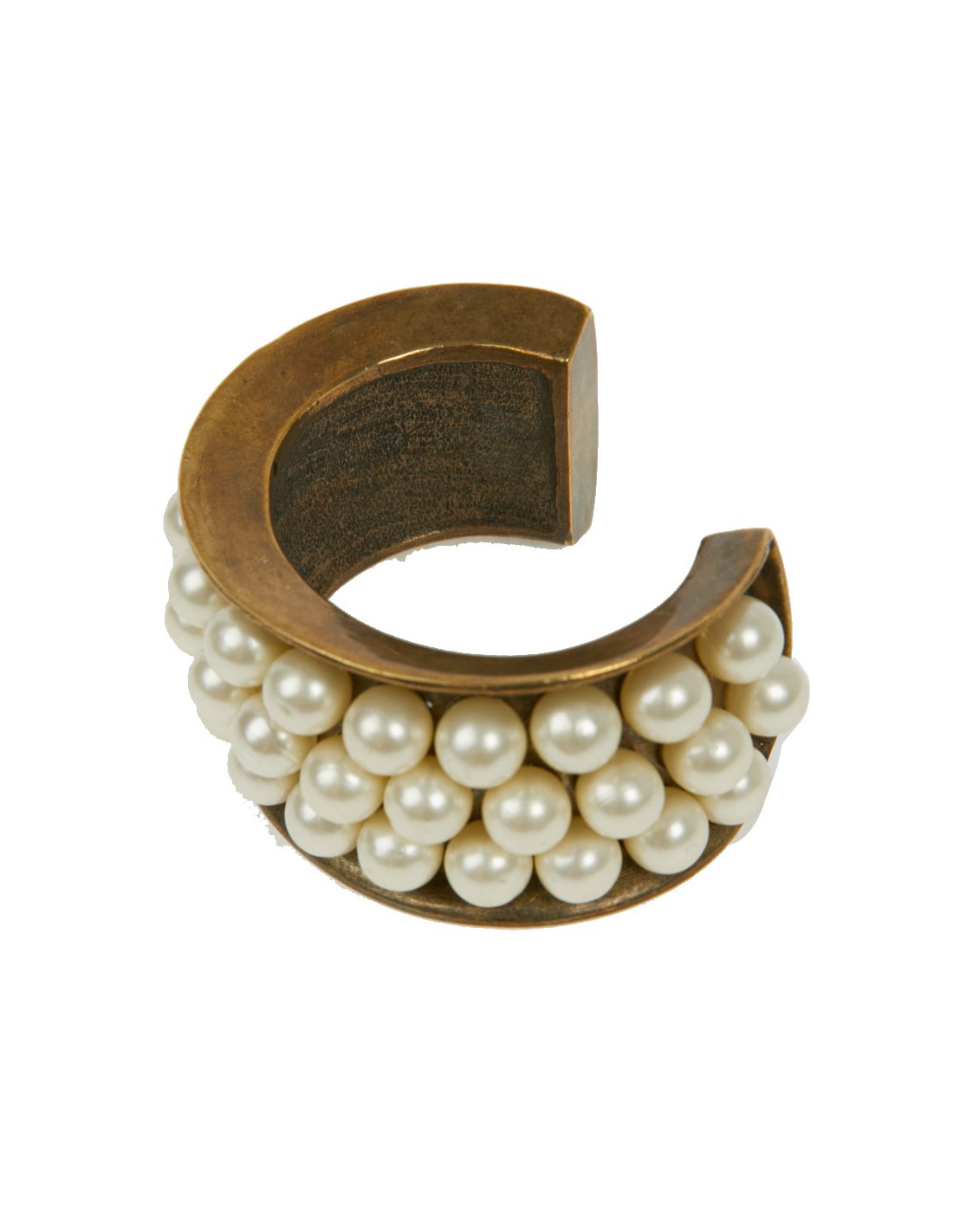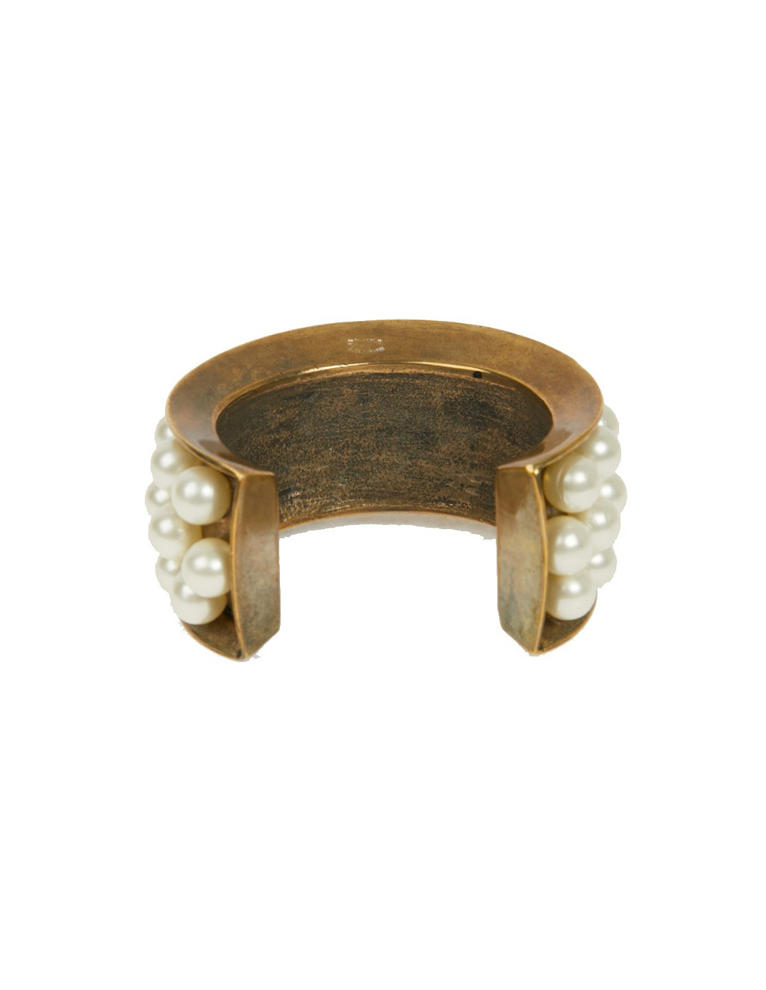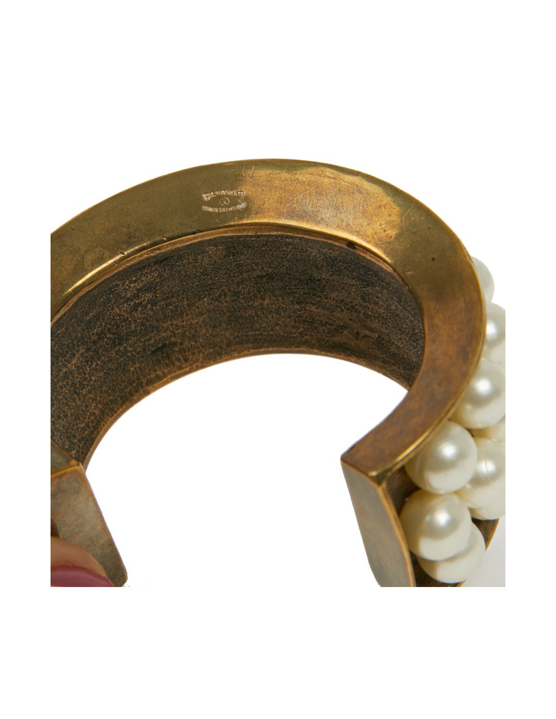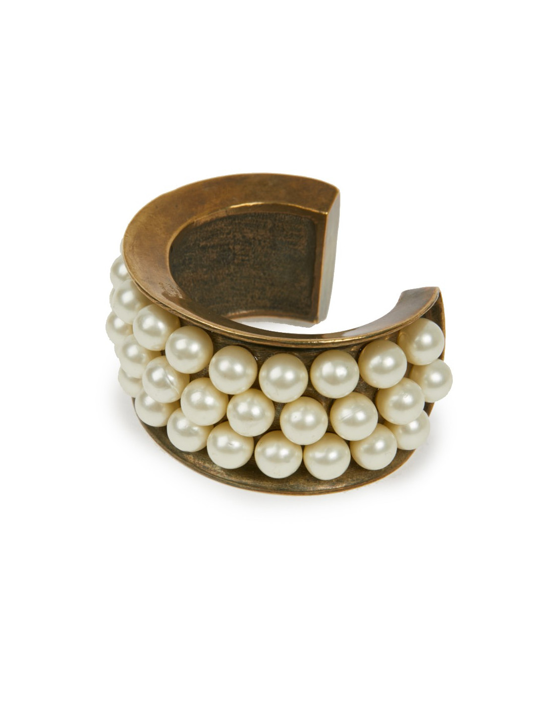 Vintage. Superbe bijou en très bon état de la Maison CHANEL composé de perles de verres nacrées collées, sur un manchette effet doré vieilli cuivré. Cette manchette a les dimensions suivantes : largeur de l’ovale au plus grand 5.9 cm, hauteur 3.5 cm, écartement pour l'ouverture 3.9 cm, longueur intérieure du bracelet 13 cm, épaisseur du replis 1 cm.
