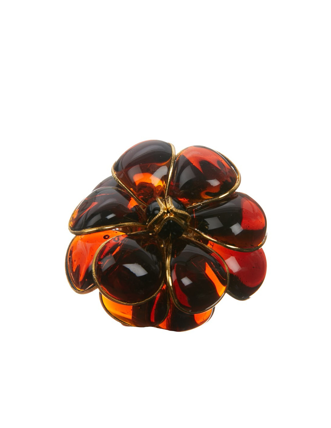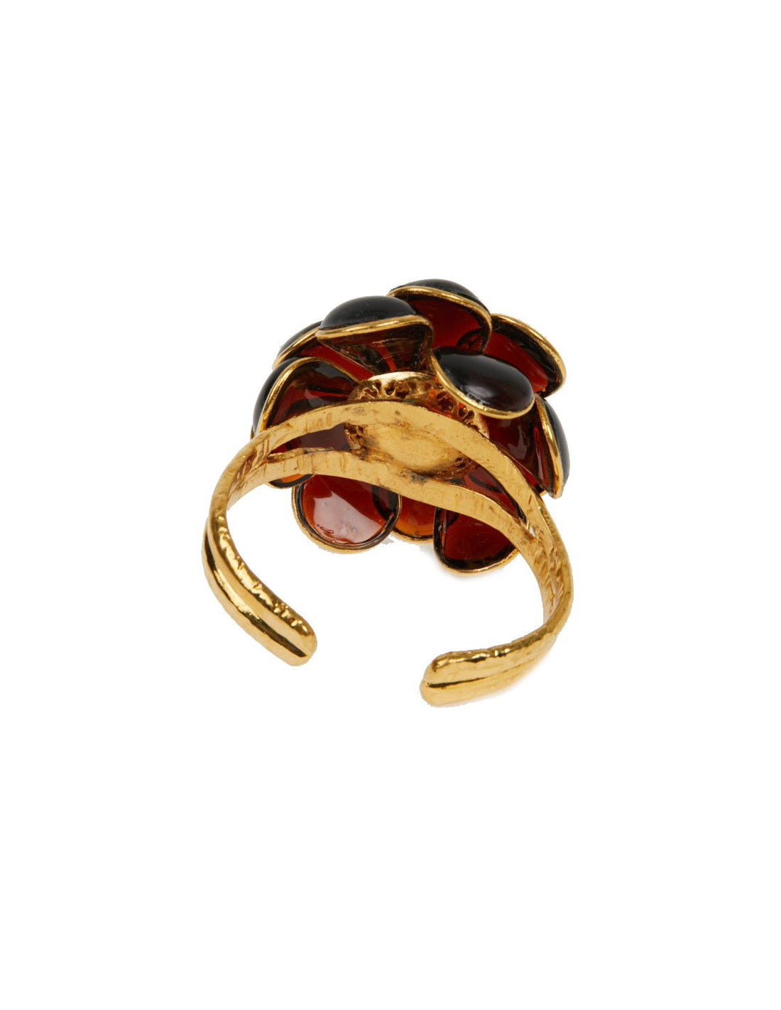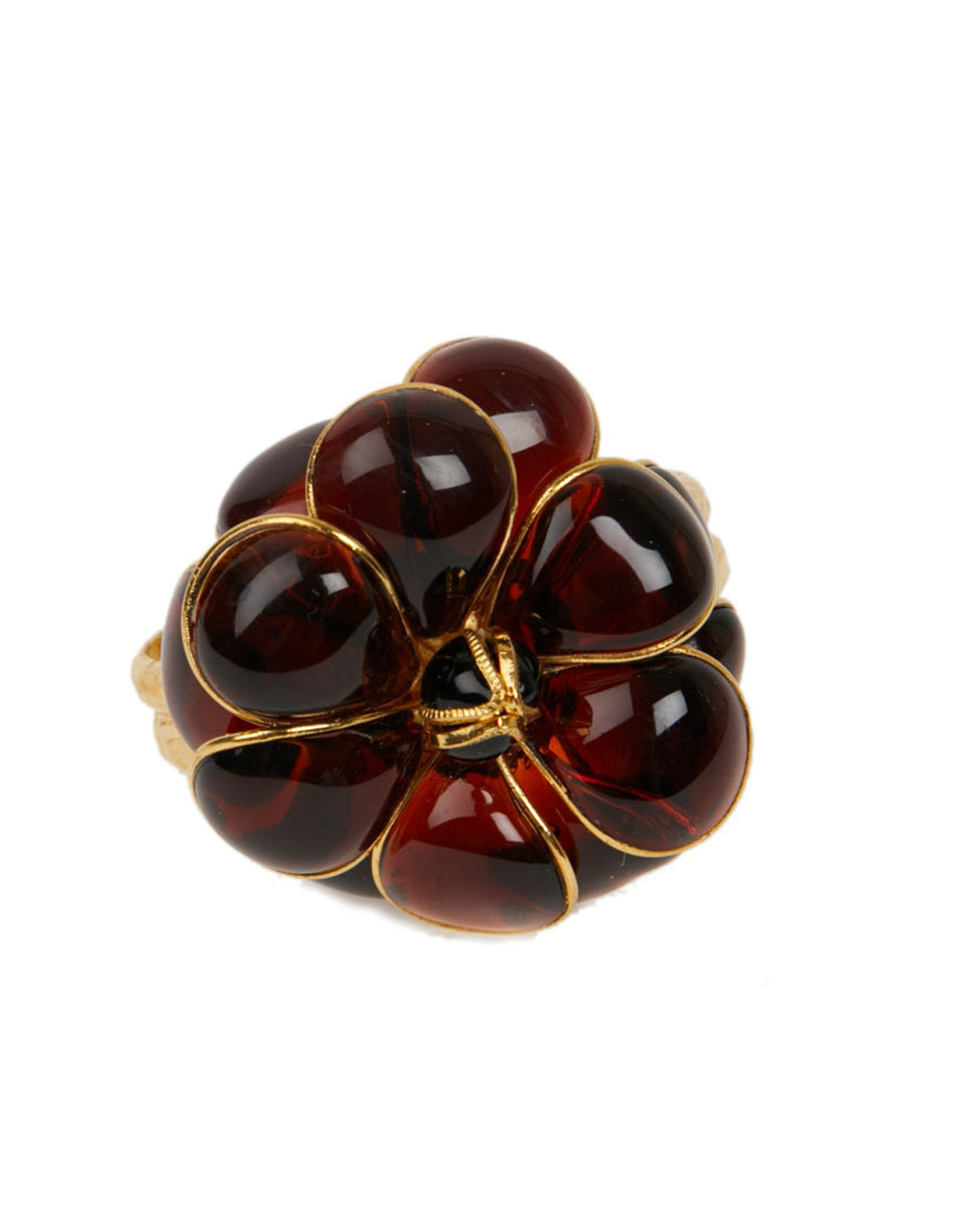 Pièce unique. Magnifique bracelet Couture Marguerite de Valois. Une fleur en pâte de verre topaze soudée sur une monture dorée à l'or fin. Elle représente un camélia. Elle n'a jamais été portée.