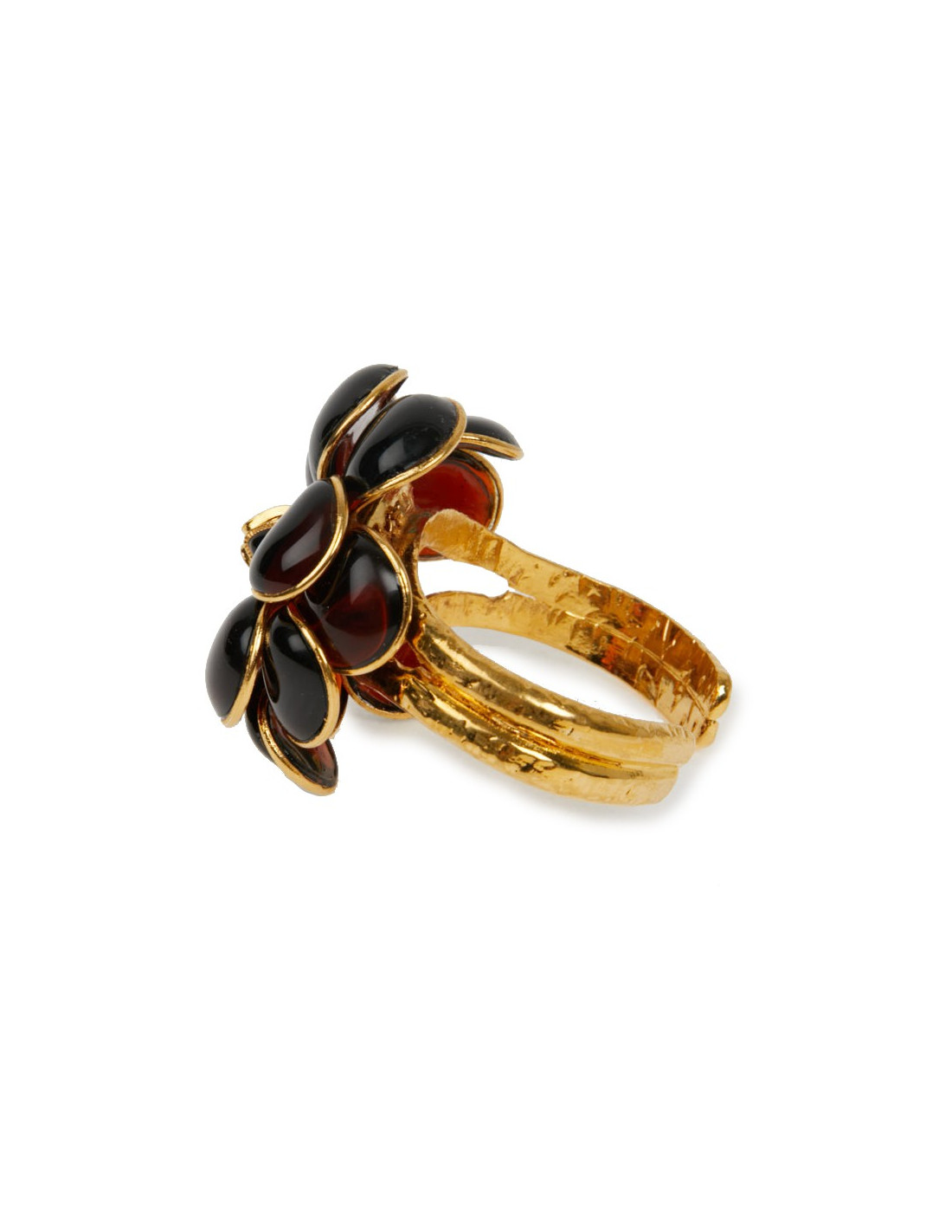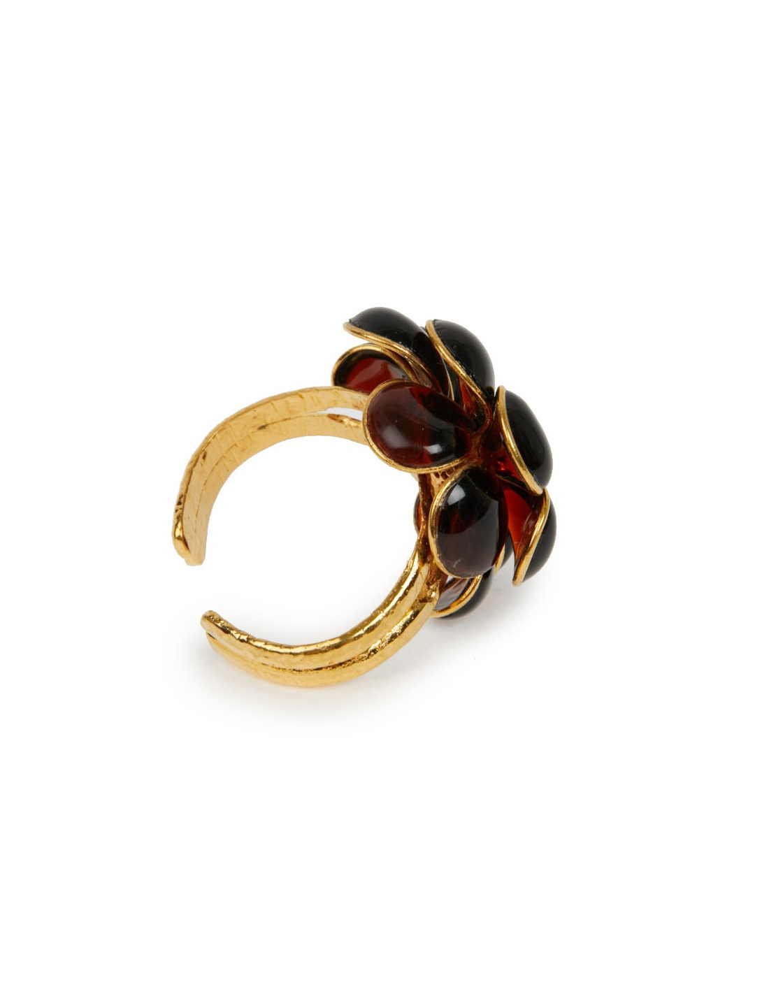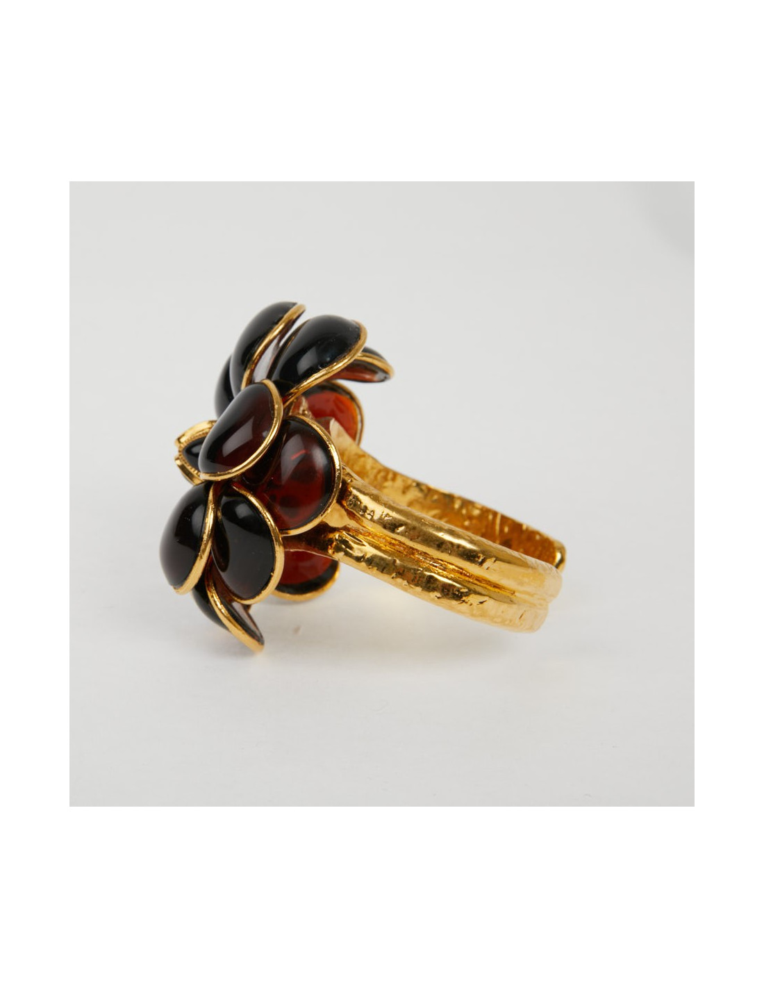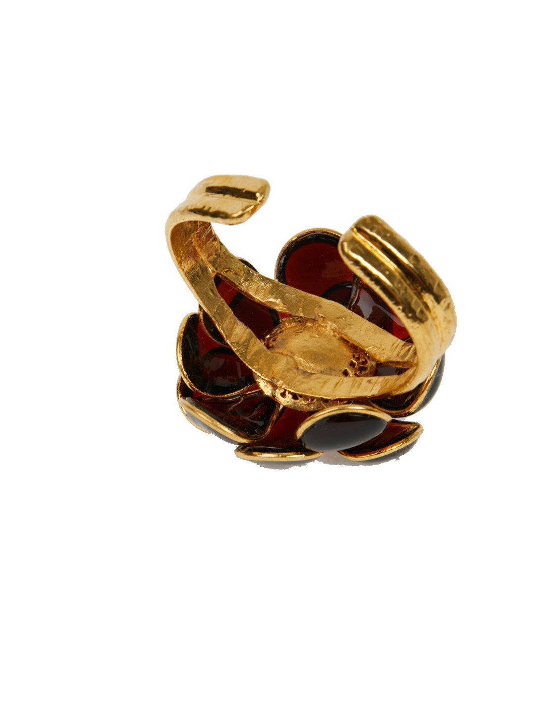 Pièce unique. Magnifique bracelet Couture Marguerite de Valois. Une fleur en pâte de verre topaze soudée sur une monture dorée à l'or fin. Elle représente un camélia. Elle n'a jamais été portée.