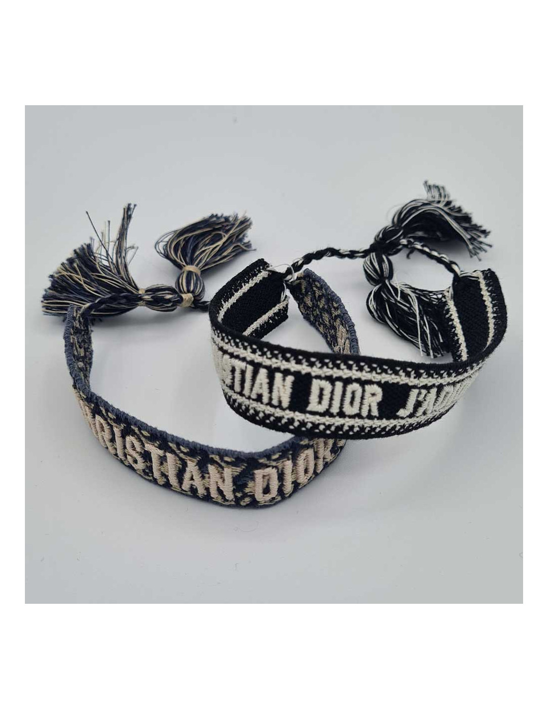 La signature "CHRISTIAN DIOR J'ADIOR" est dessiné sur le coton tissé. Un des bracelets est sur fond de toile oblique et l'autre uni.