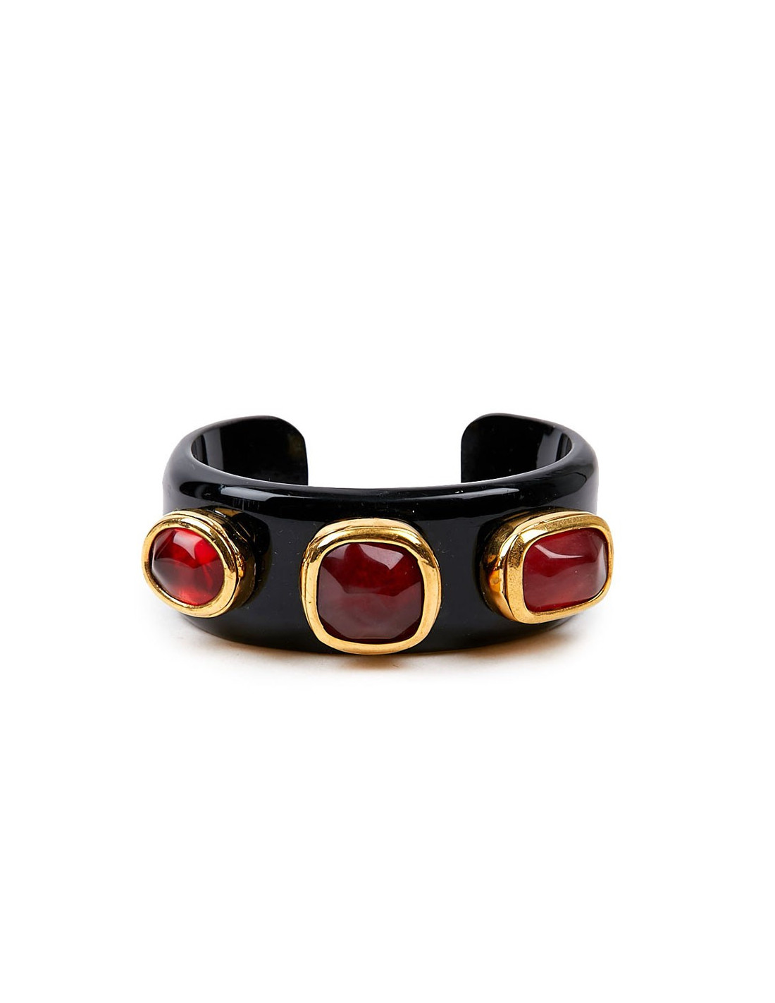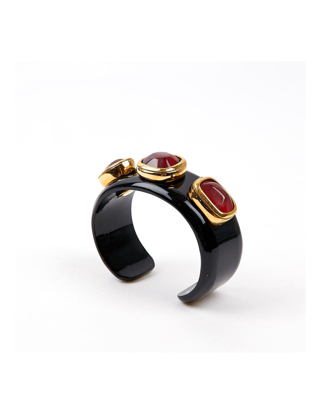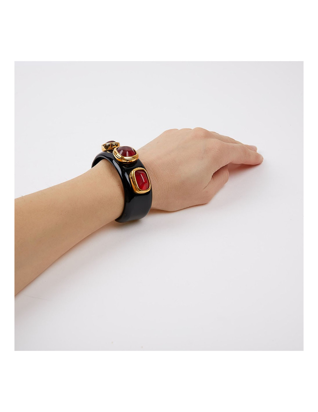 Bracelet rigide en résine et cristal de roche teinté en rouge. Ces bijoux ont été fabriqués dans les ateliers anciennement à  Monsieur Robert Goossens. La Maison appartient à présent à Chanel.