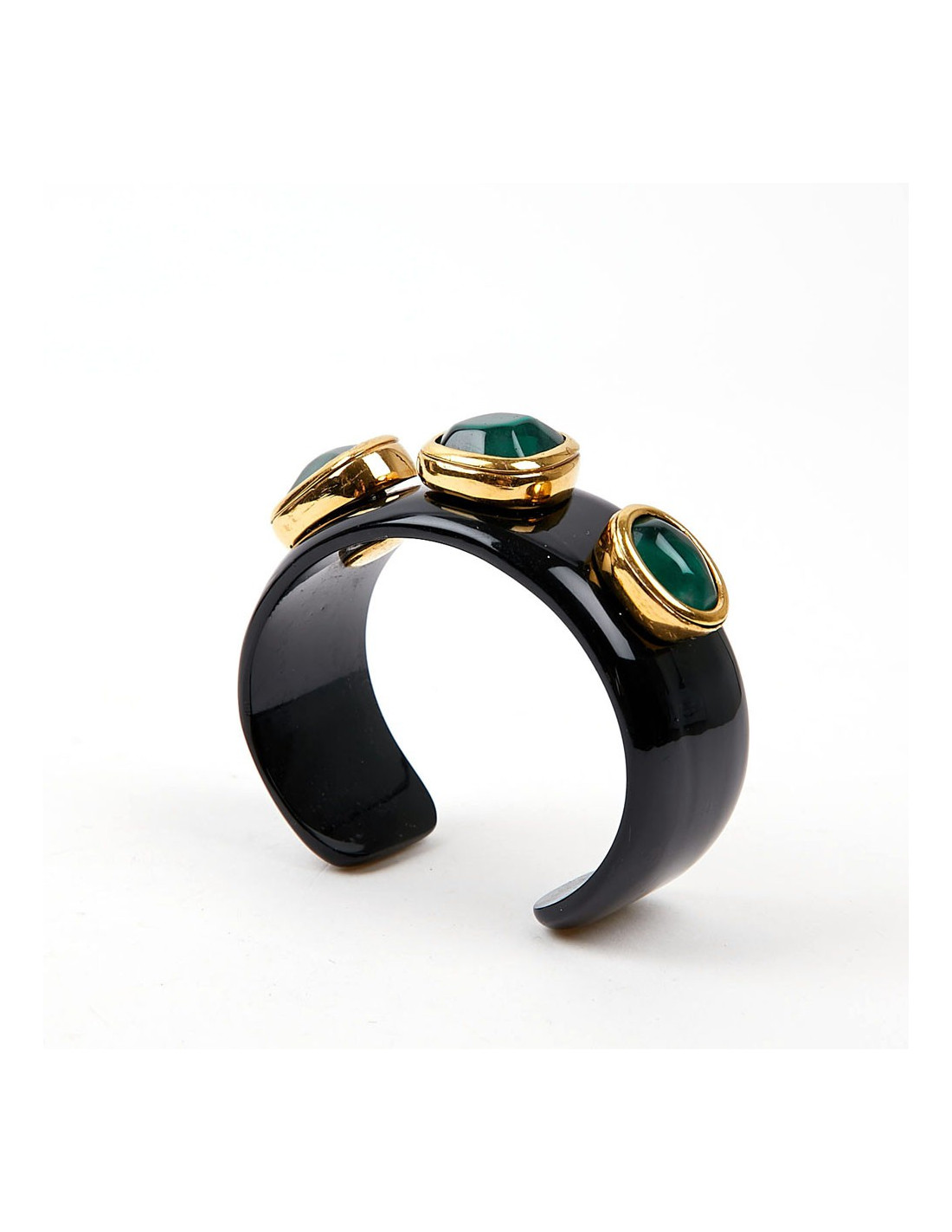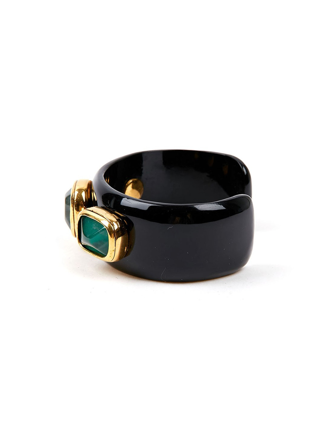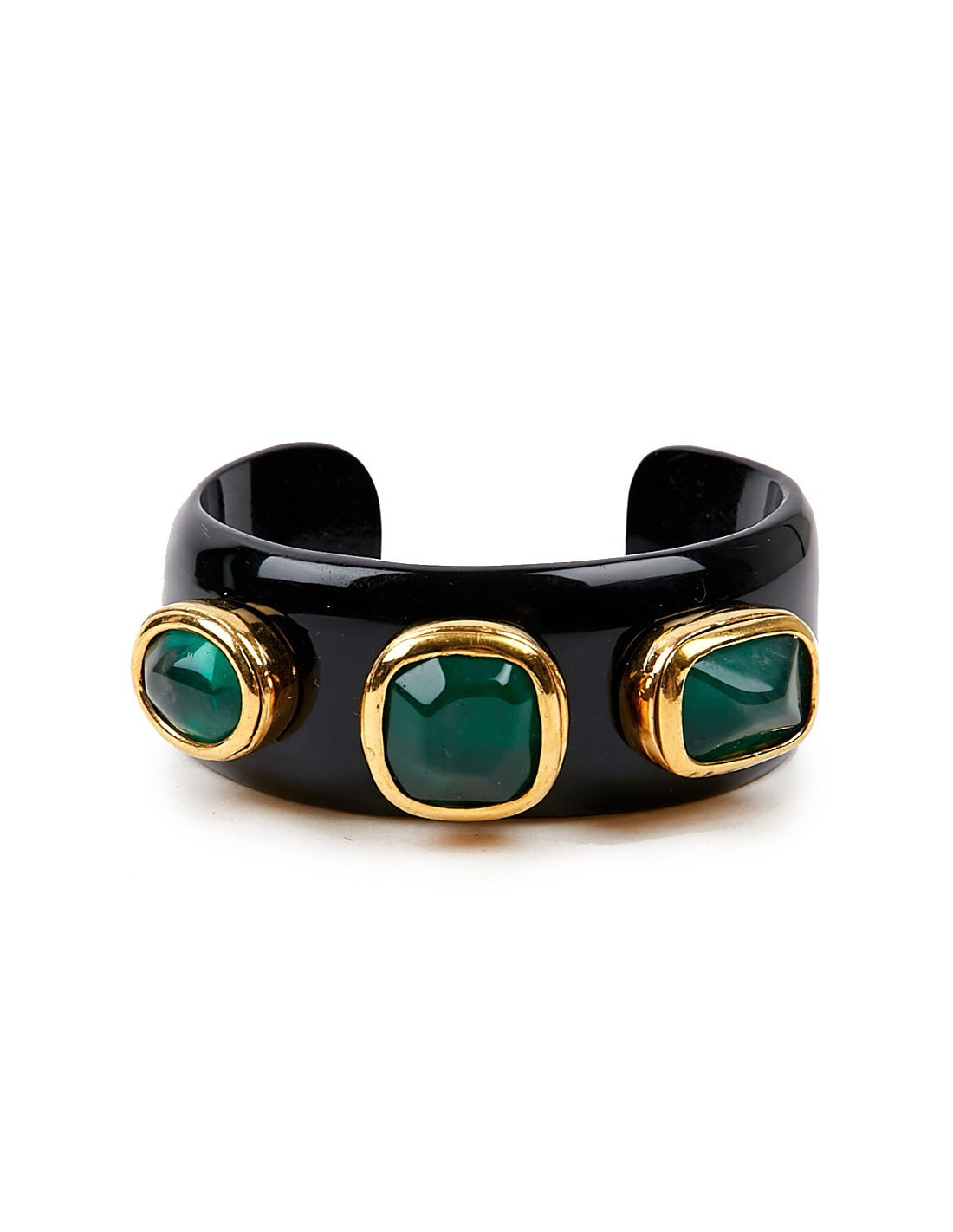 ravissante manchette en résine noire et cabochons couleur émeraude.