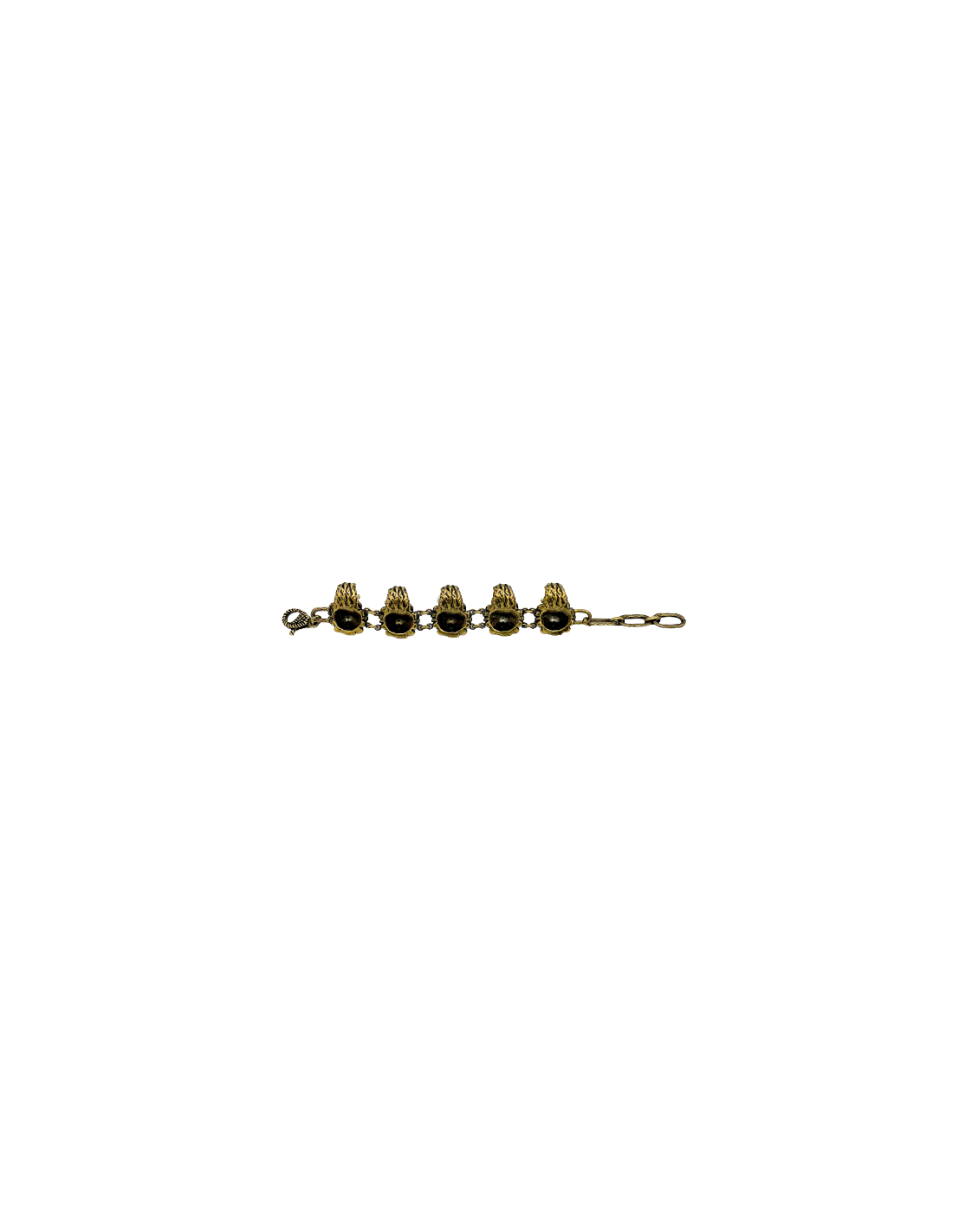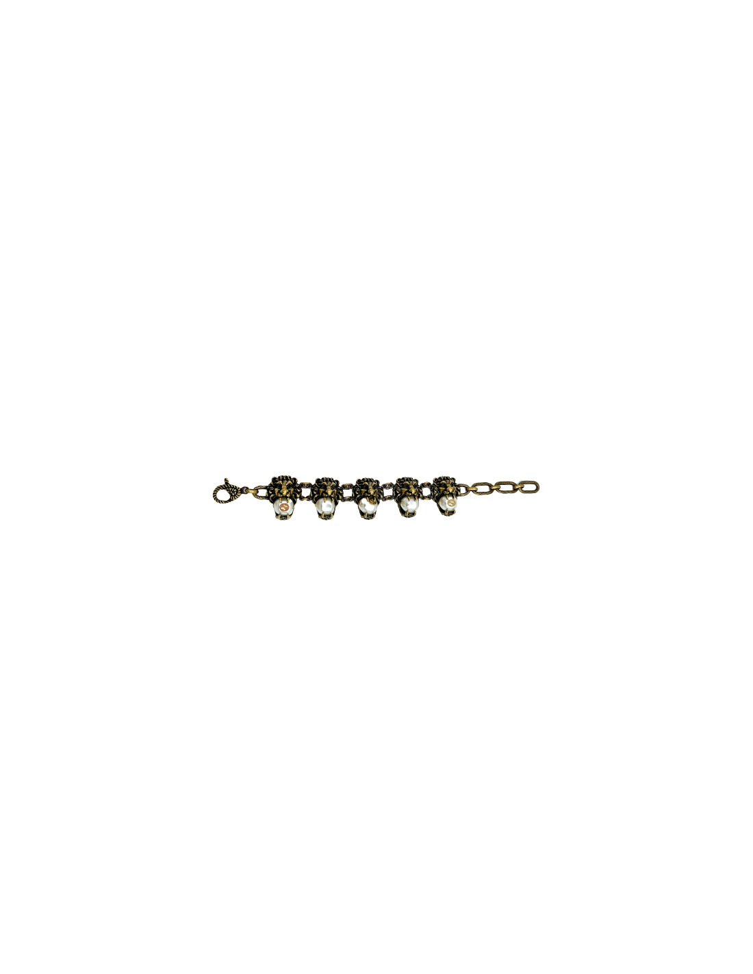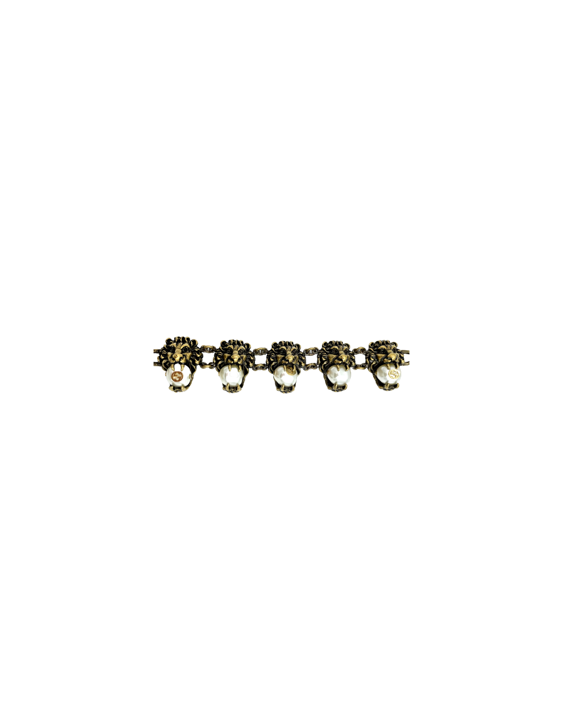 Bracelet représentant des têtes de lion tenant dans leurs crocs des perles nacrées. Il est doré, or vintage vieilli.