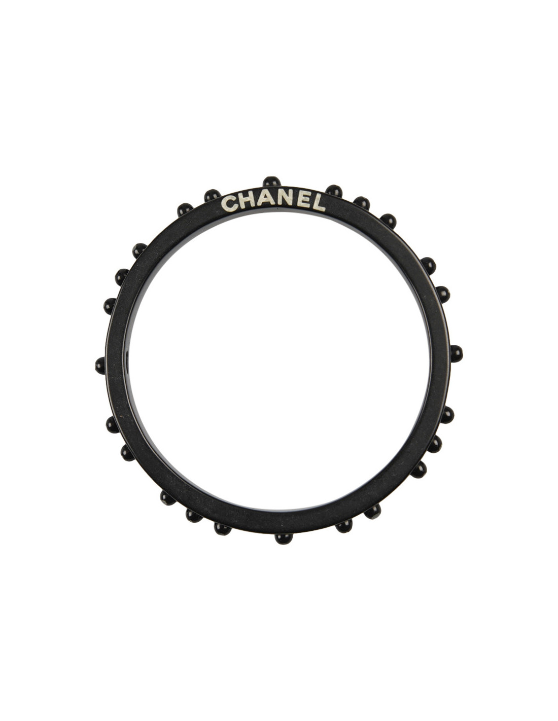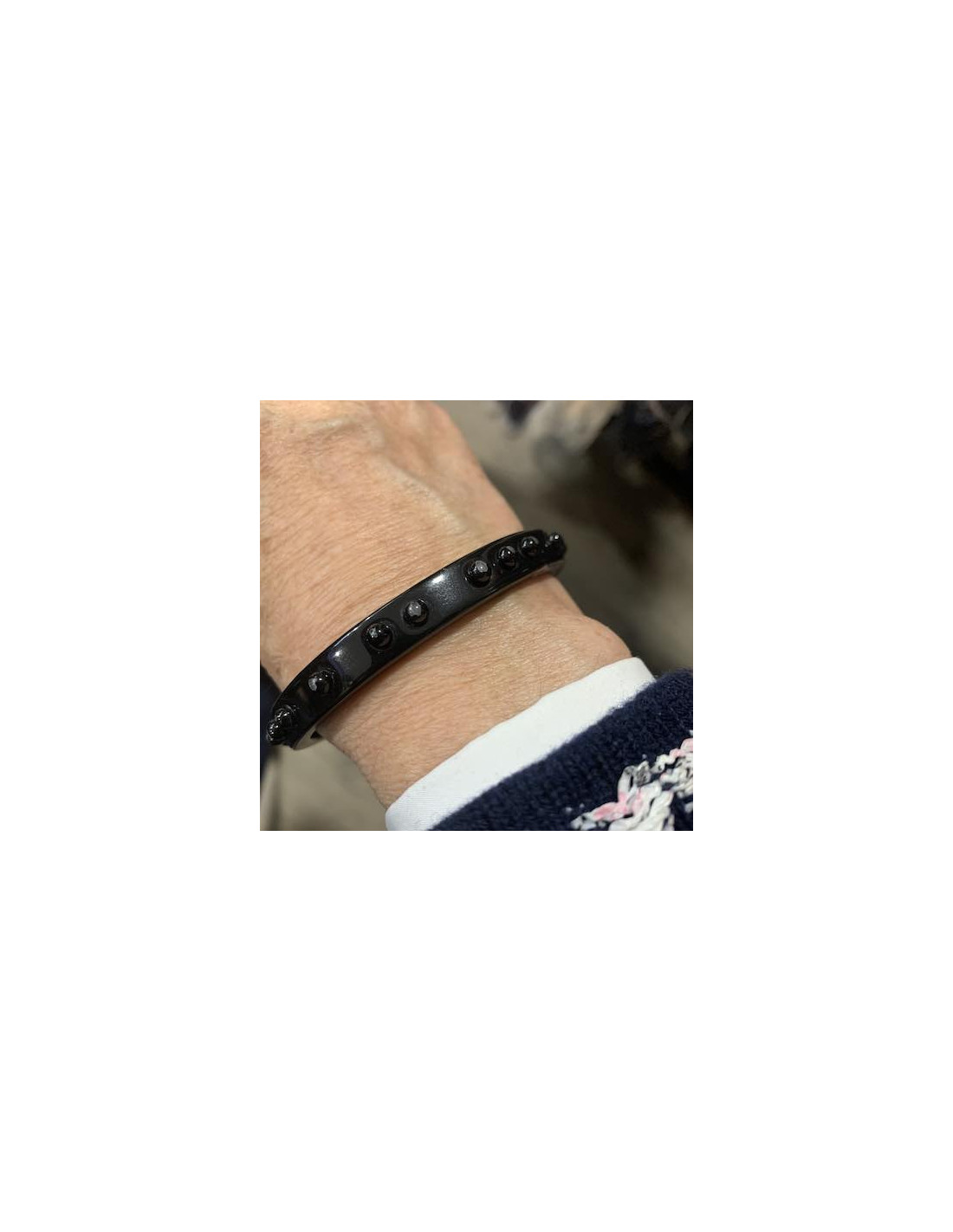Détails : La coloration est partie sur le dessus des petites perles noires , bracelet noir avec inscription Chanel en blanc