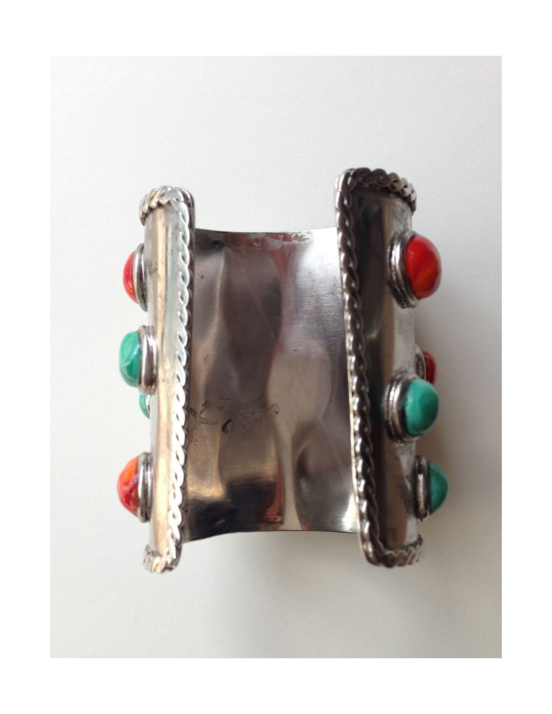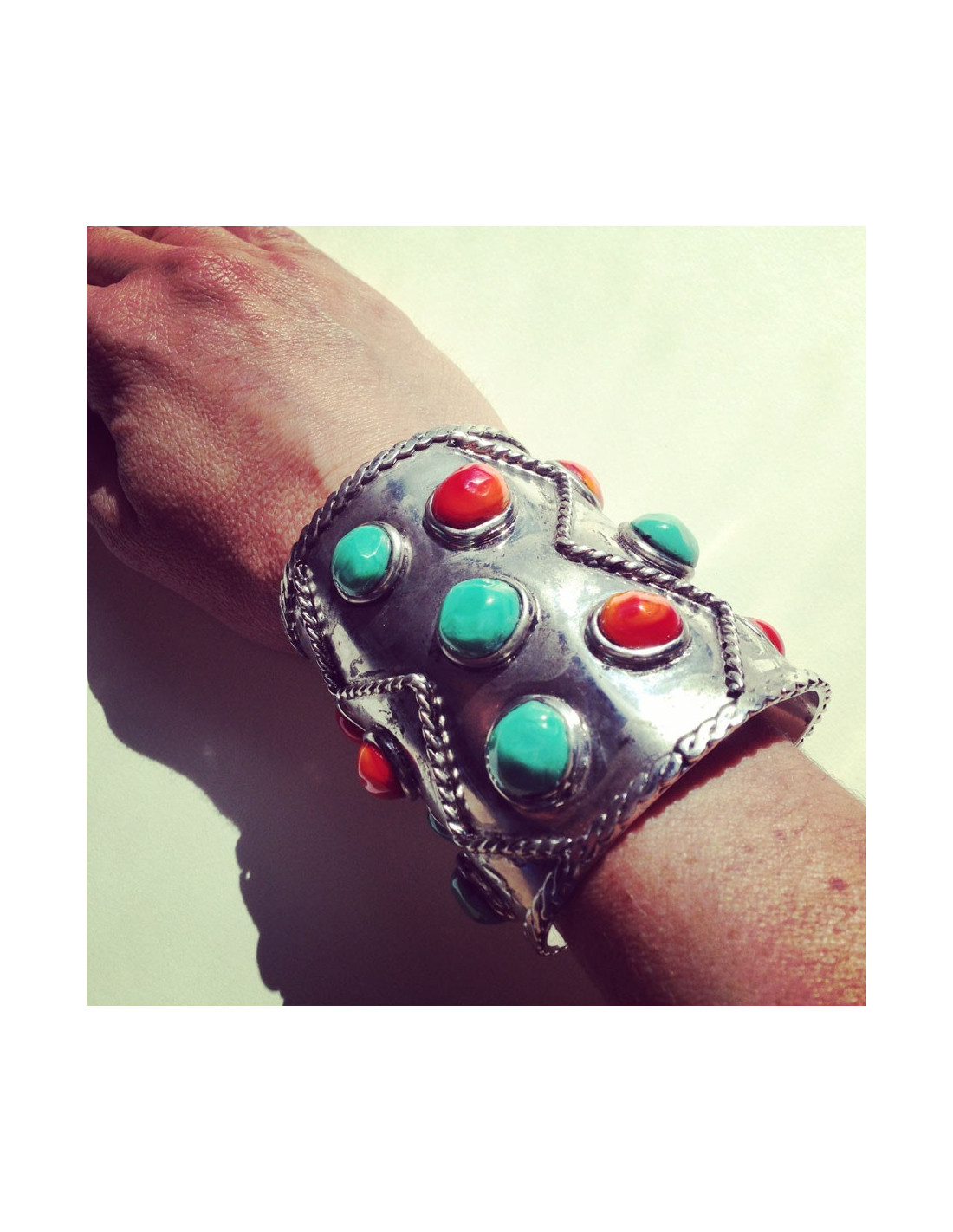 Manchette corail et turquoise MARGUERITE DE VALOIS cabochons pâte de verre et métal argenté