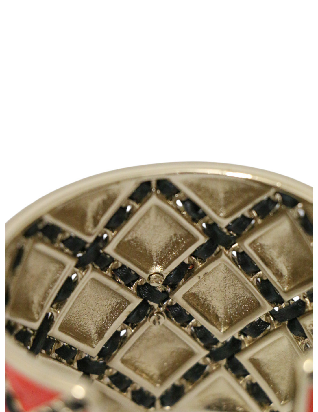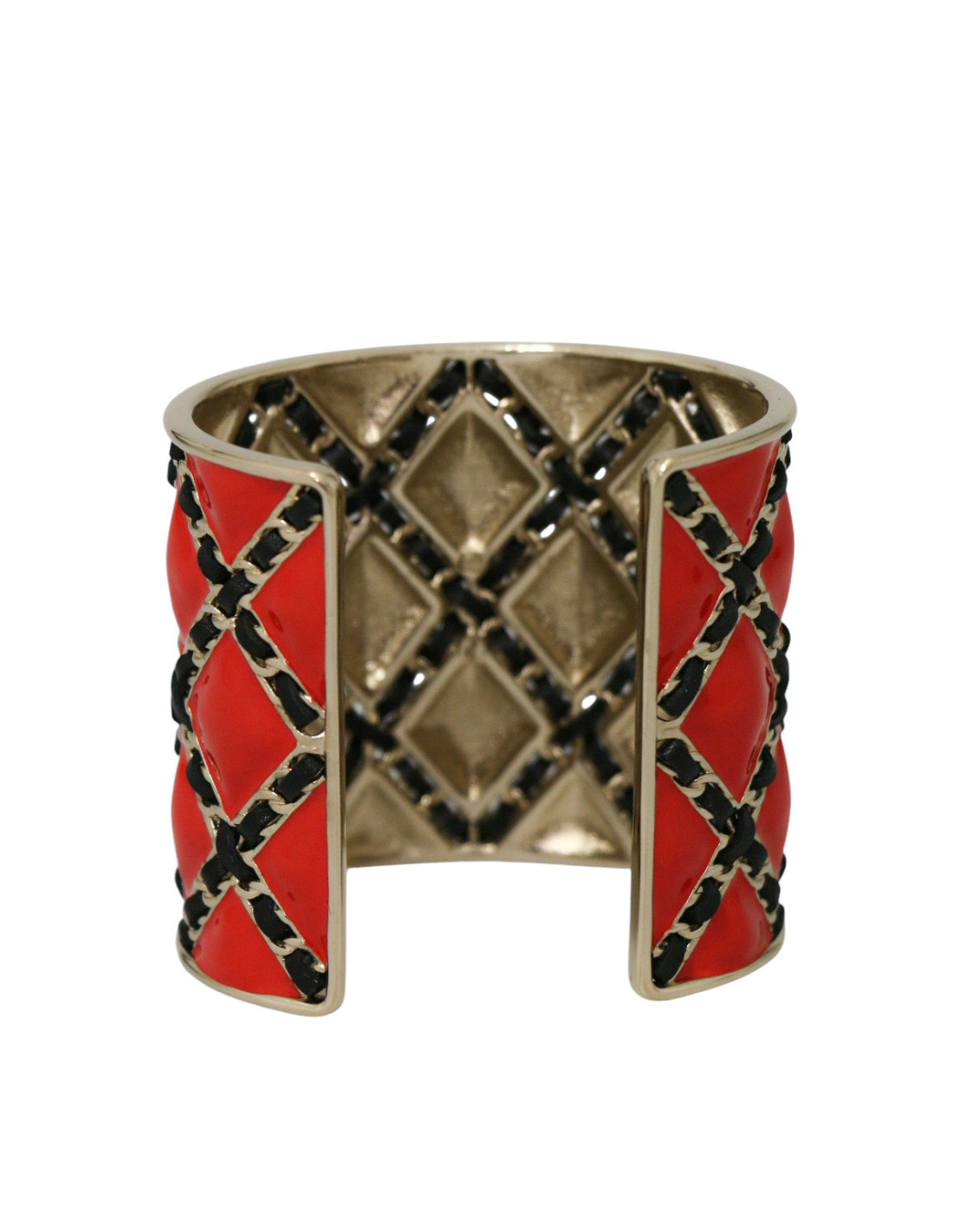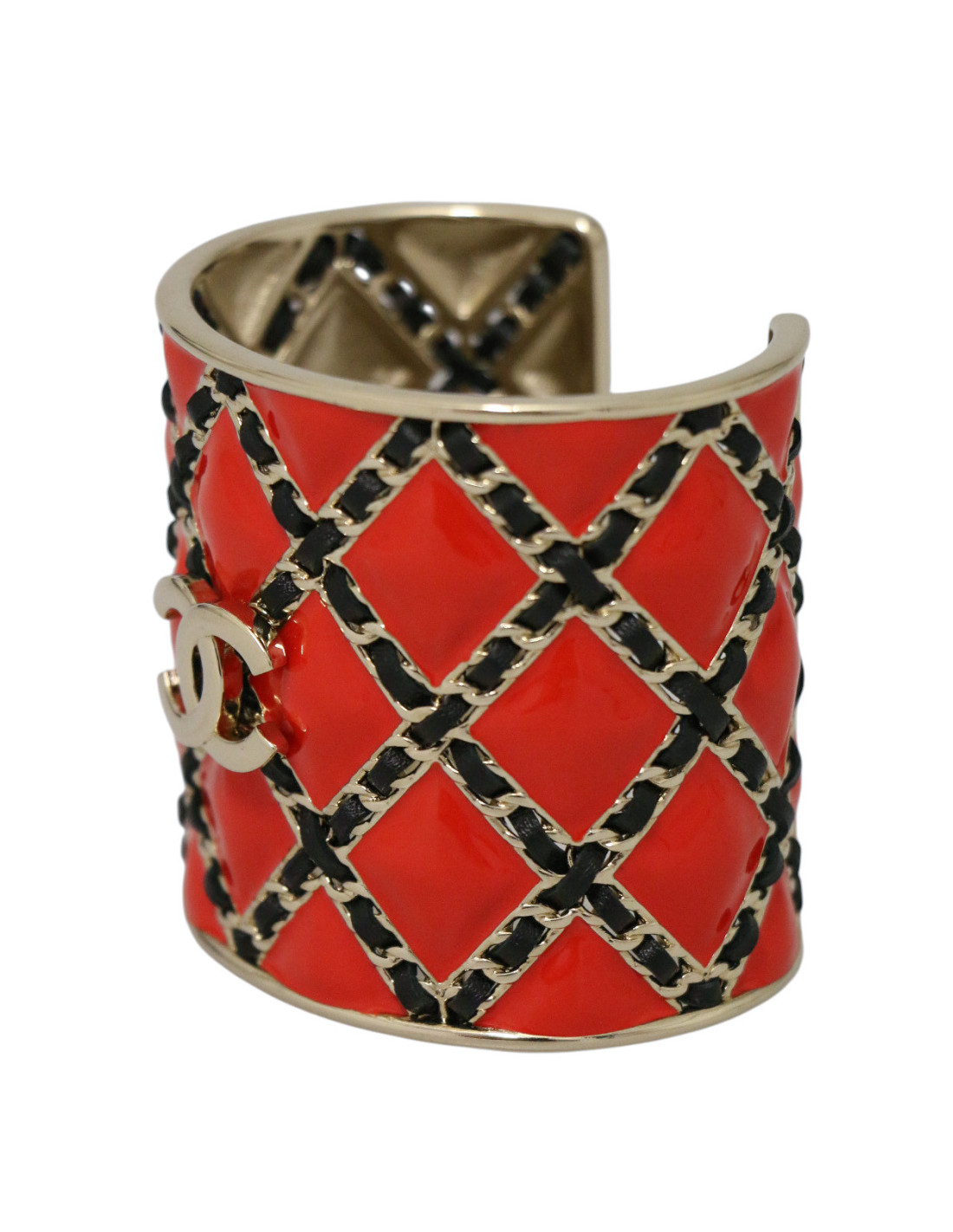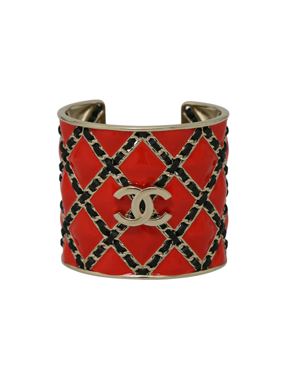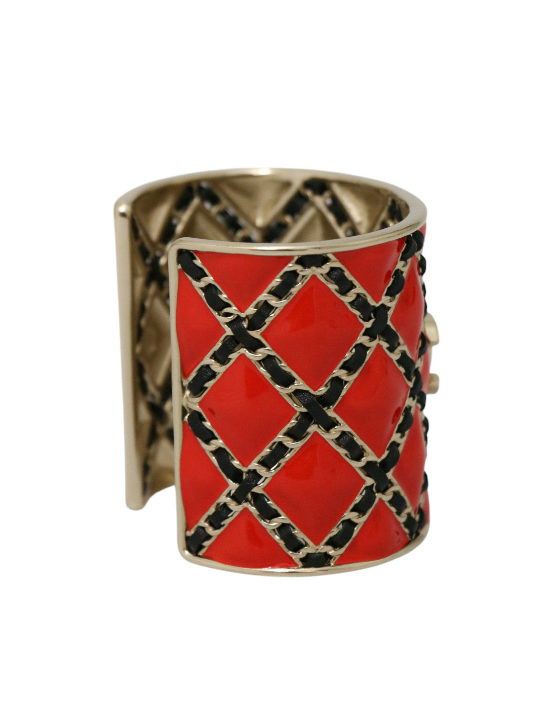 Détails : manchette rigide en métal doré, décor quadrillé en émail rouge vif entrelacé de cuir rappelant le matelassé iconique des sacs Chanel