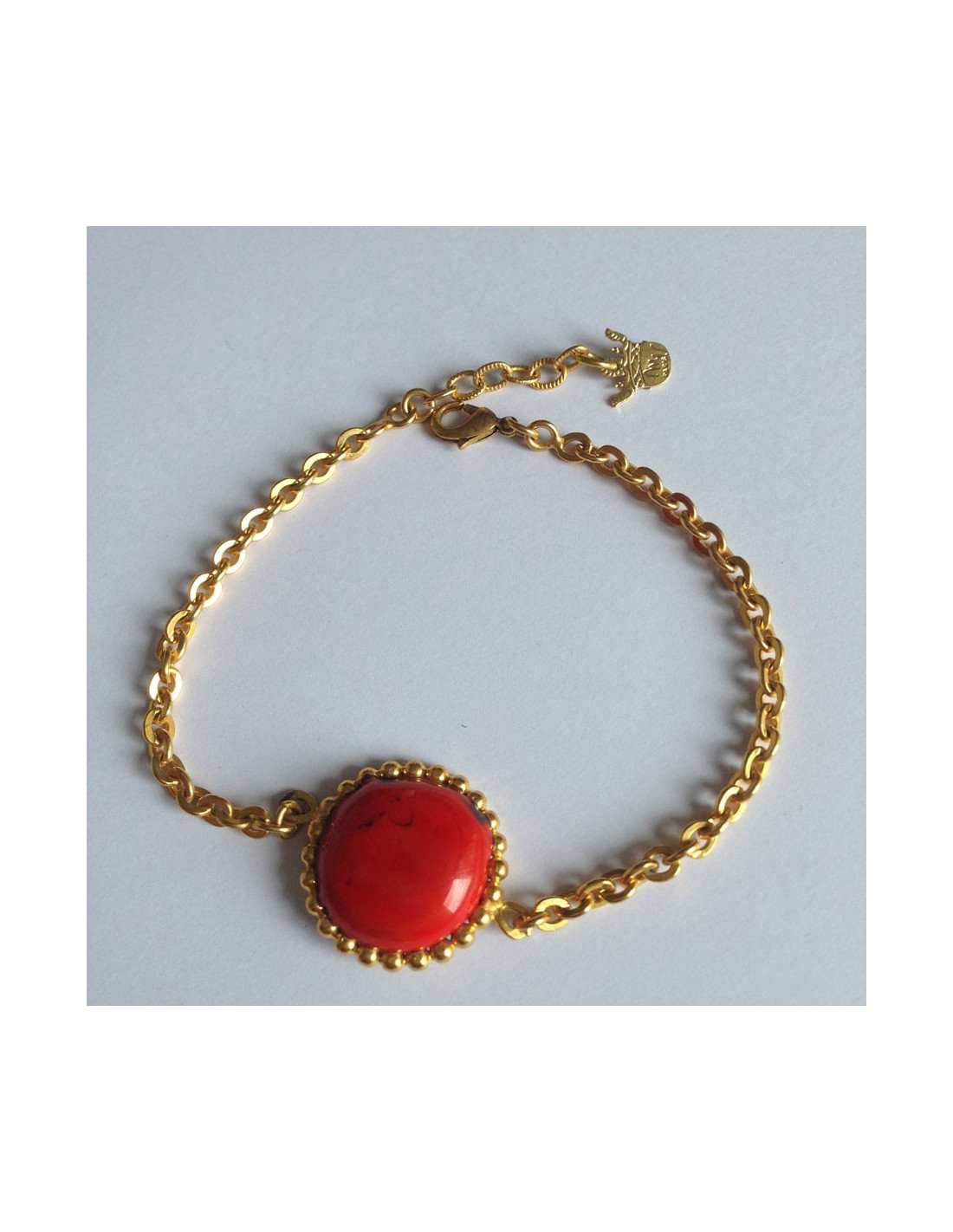 Bracelet Marguerite de Valois cabochon rond rouge opaque et métal doré à l'or fin.