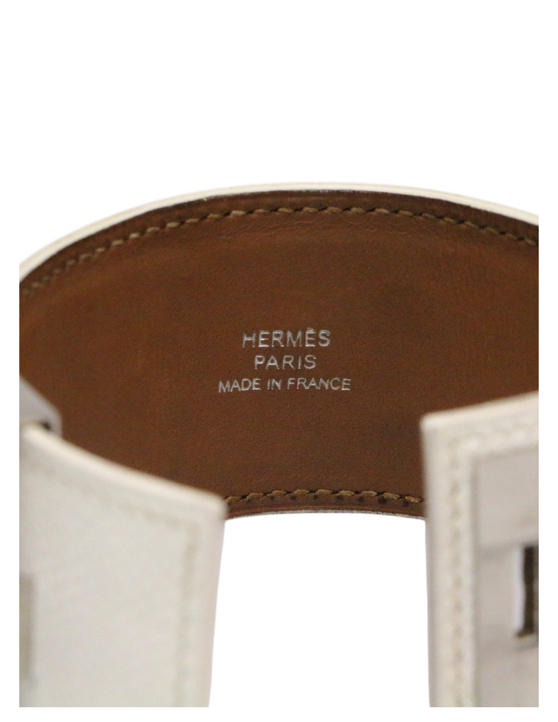 Cette manchette Collier de Chien de la maison Hermès se présente comme une large bande de cuir grainé, doublée d’un intérieur en cuir gold, alliant élégance et robustesse. Il est orné de pièces métalliques argentées et de clous pyramidaux, un design emblématique créé dans les années 1920. Inspirée à l’origine des colliers pour chiens utilisés à l’époque, cette manchette a été réinterprétée par Hermès en bijou puis en accessoire, devenant un symbole du style audacieux et raffiné de la maison. C'est une taille ajustable, il convient à un tour de poignet jusqu'à 19 cm. La bijouterie palladium présente quelques fines rayures et marques (voir photos).
