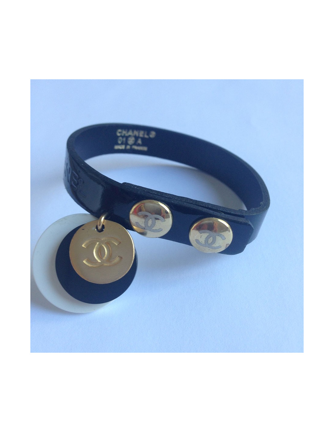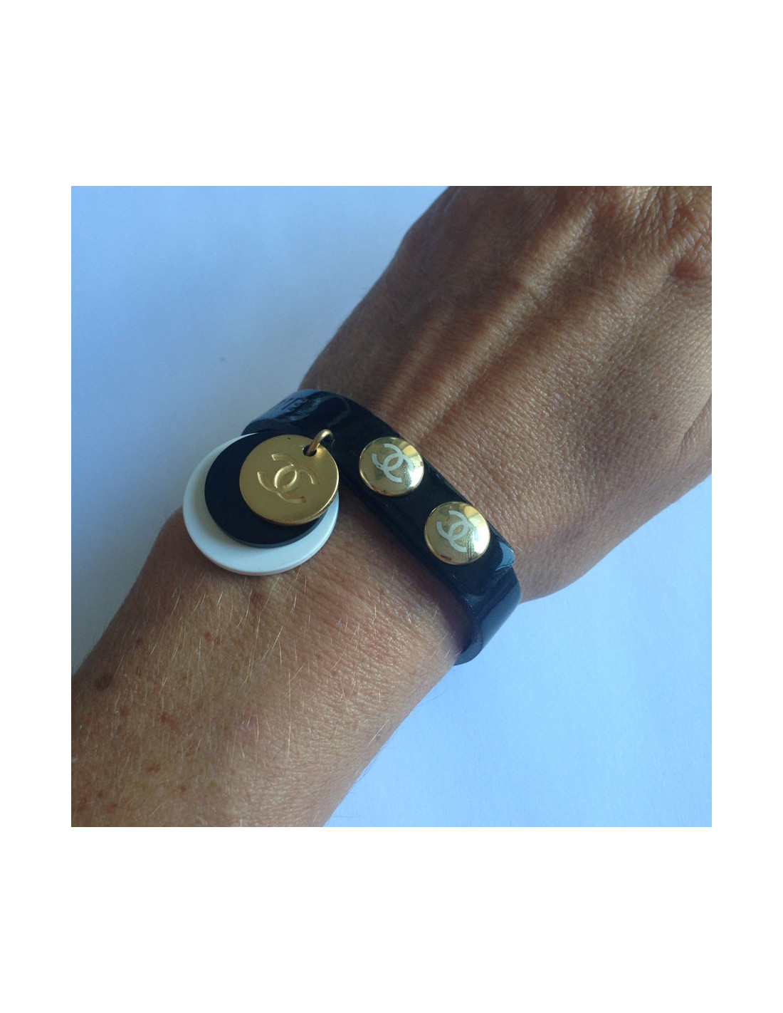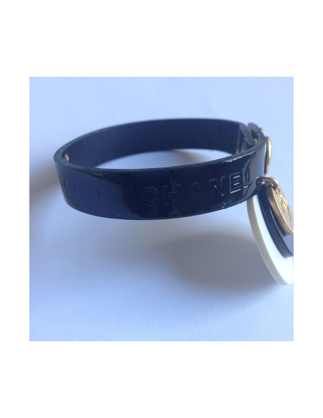 Bracelet Chanel cuir verni noir et breloques noir,blanc et métal doré CC. Bracelet en cuir verni noir sur lequel et inscrit COCO CHANEL.