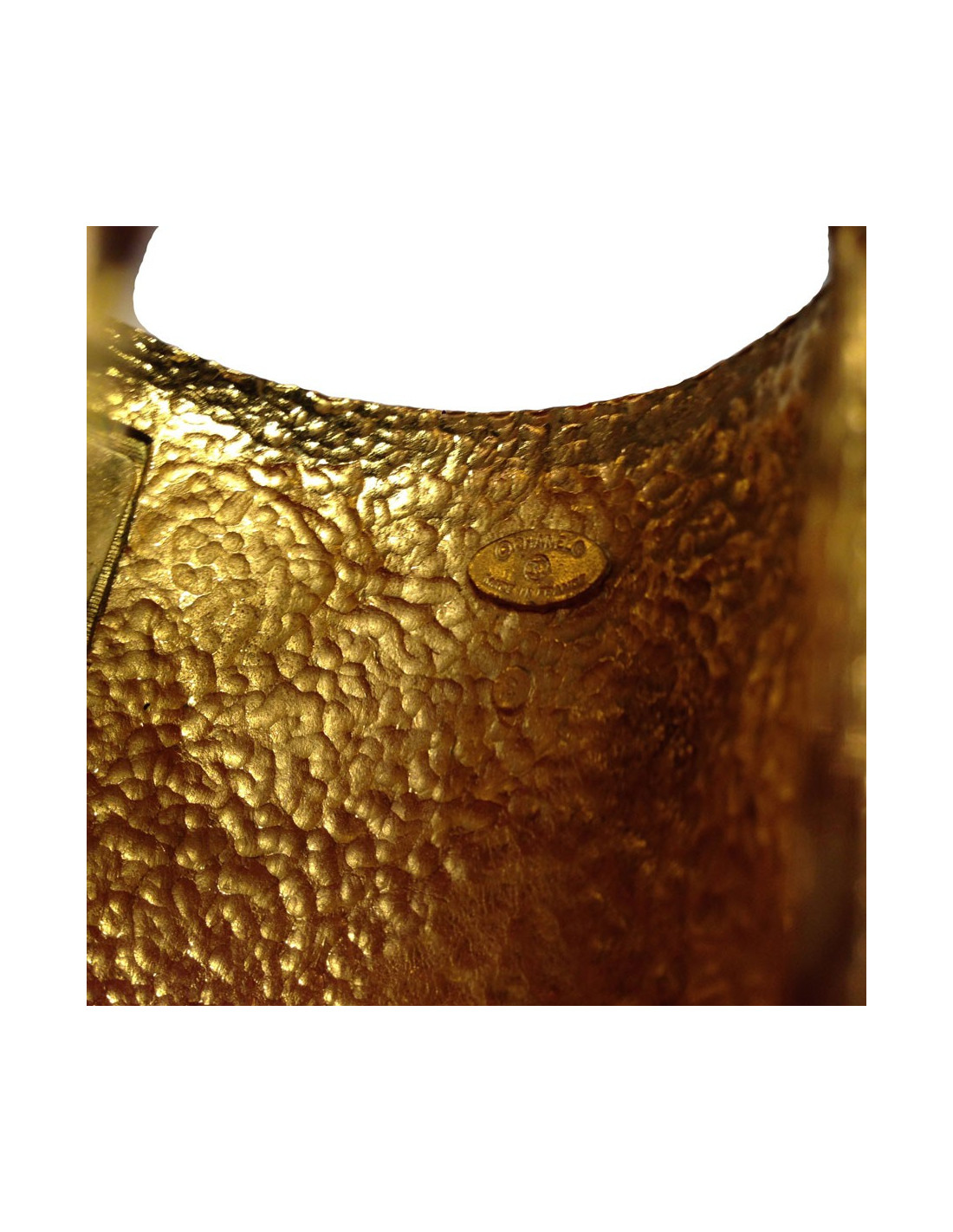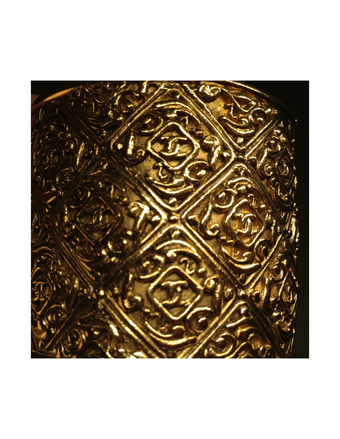 Exceptionnelle manchette CHANEL vintage en métal doré. Elle est articulée par 2 ressorts et se ferme avec 2 petits fermoirs. L'intérieur de la manchette est martelé, l'extérieur est orné de CC en relief.