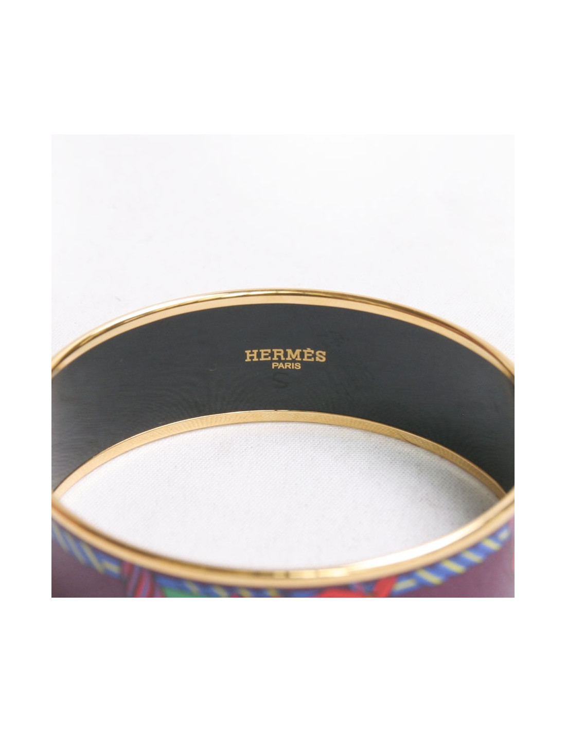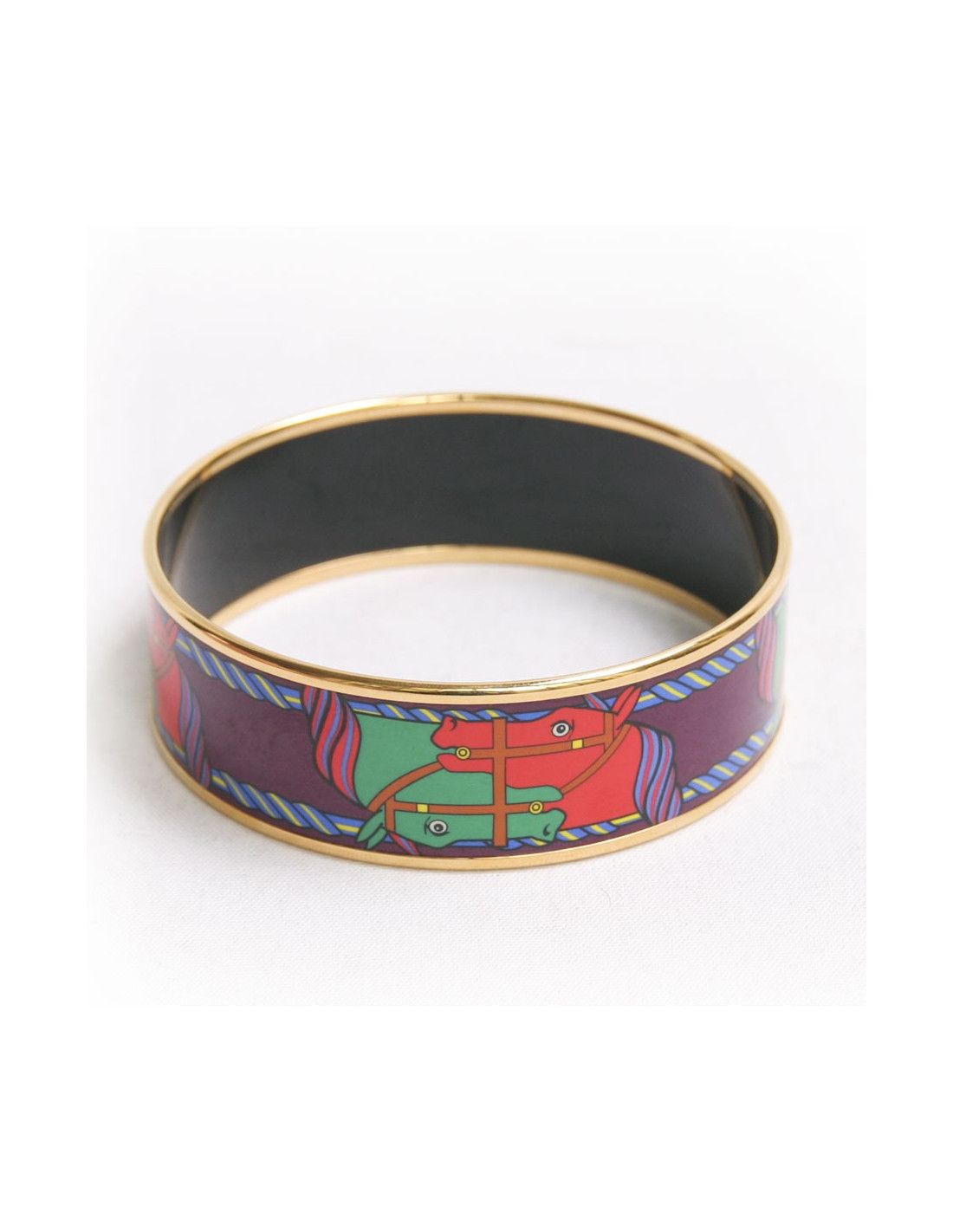 Bracelet large quadrille Hermès multicolores en email doré, les couleurs du bracelet sont vert, bleu, rouge, jaune et aubergine, le tour du bracelet est en palladium sature 70. Le prix boutique du bracelet est de 445 euros. Très bon état