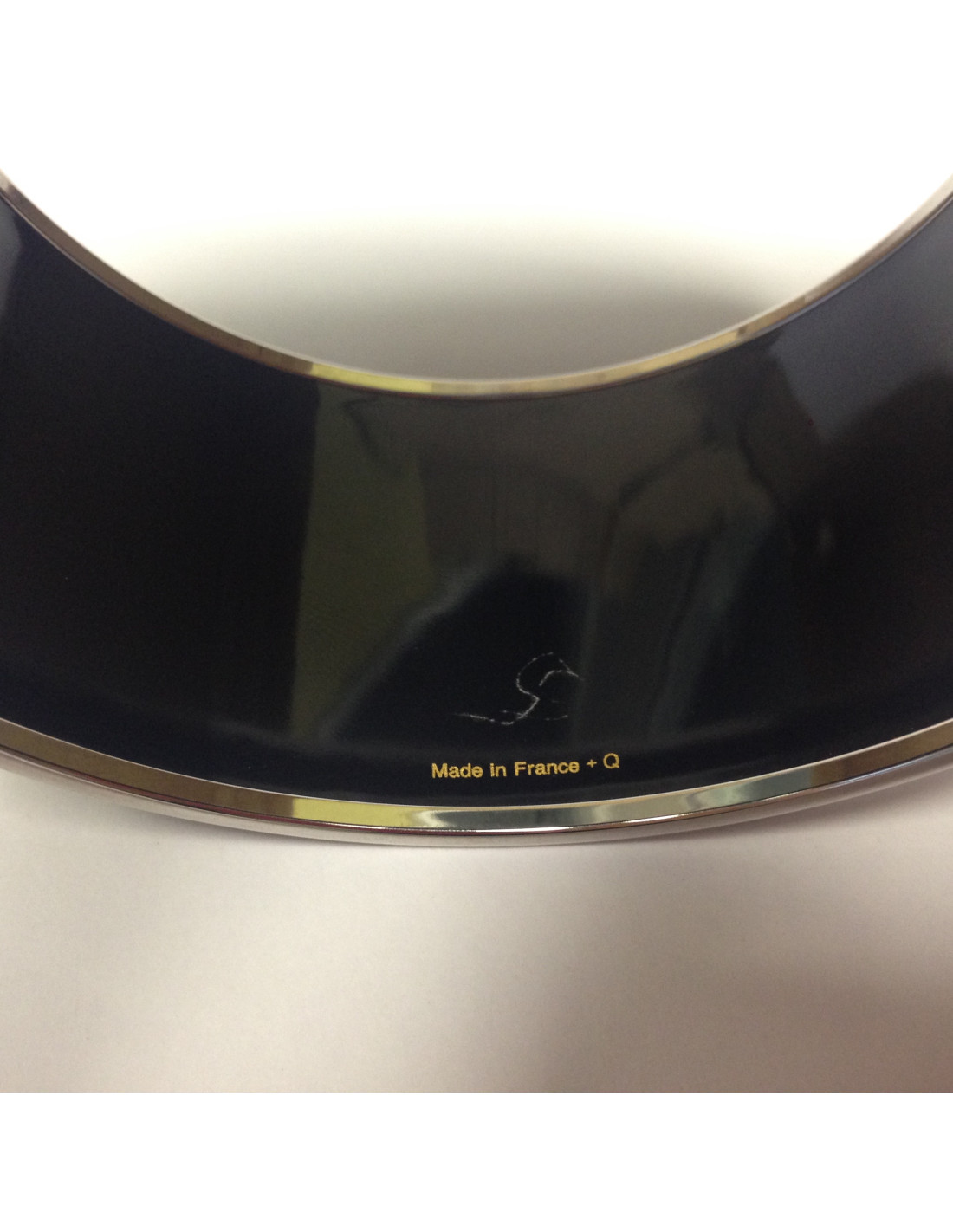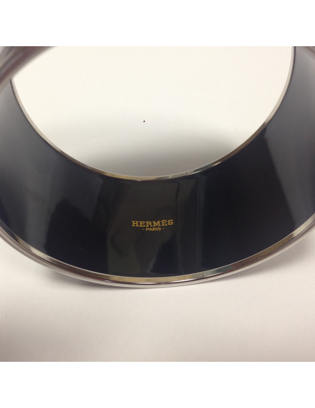 Bracelet XL "Grand Apparat" platine, émail palladié noir de la maison HERMES. Le tour du bracelet est en palladium sature 70. Les dessins sont fins dans les tons gris argentés. Le cerclage est en laqué argent et palladium. Griffé "Made in France + Q". Très bon état.