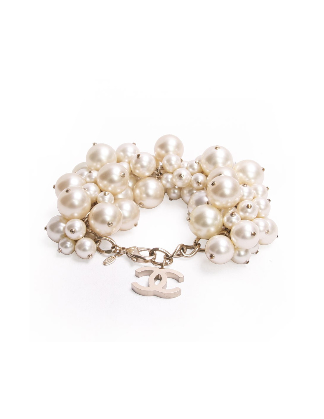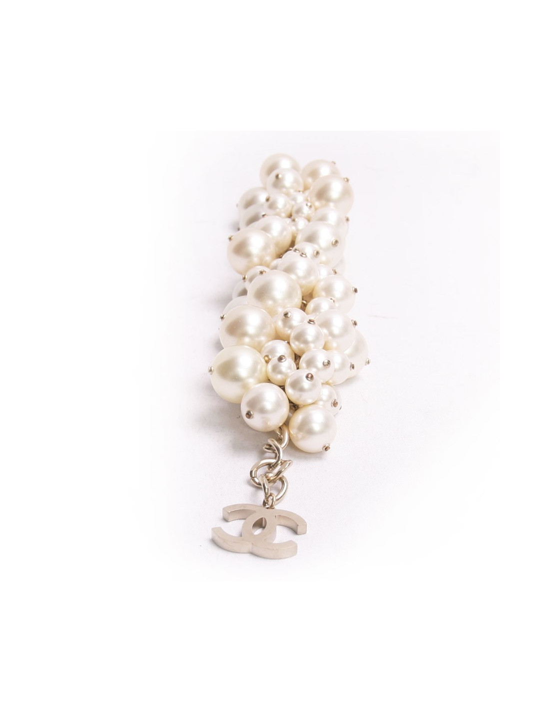 Magnifique et imposant bracelet en grosses perles nacrées Chanel. En très bon état malgré des toutes petites marques peu visibles , sur quelques perles. Diamètre des grosses perles : 2.3 cm - diamètre des perles moyennes 1.5 cm. la longueur du bracelet : 24 cm. Chaine dorée se terminant par un gros double C 3 cm x 2 cm.