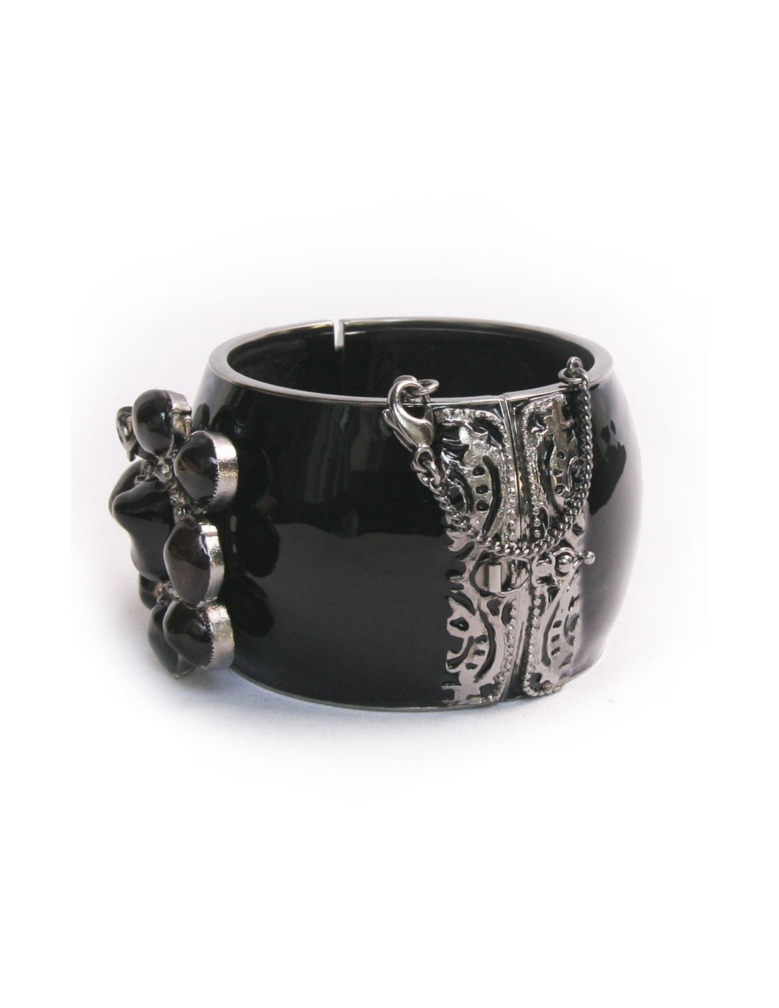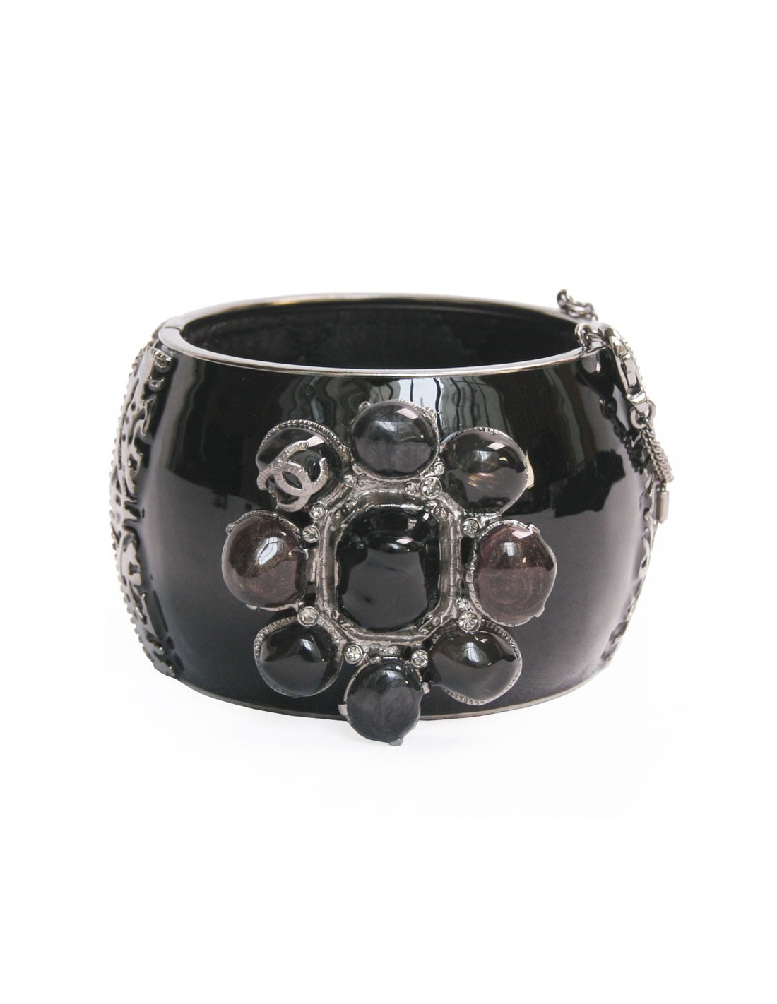 Magnifique manchette Chanel, émaillée noire, et surmontée d'un imposant bijou en pâte de verre couleur topaze clair,