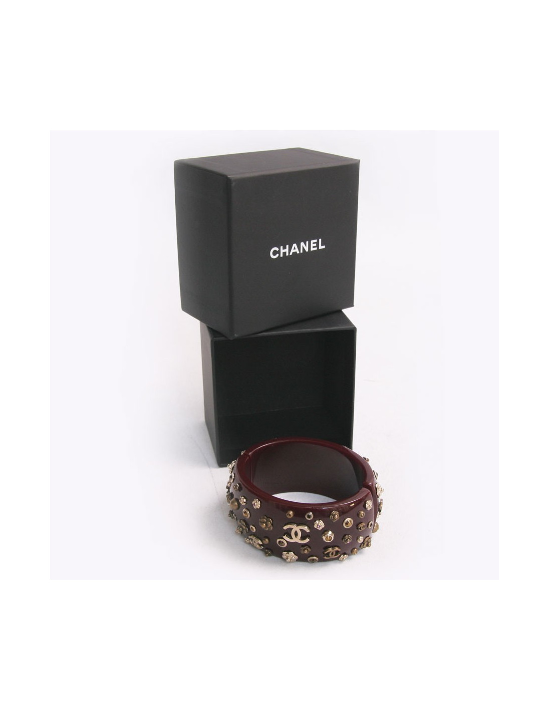 Jolie manchette Chanel en résine, couleur bordeaux, incrustée de camélias, de double C de clous, de brillants... dorés vieillis. Elle se ferme à l'aide d'un aimant - dimensions : circonférence : 23 cm x hauteur 3.5 cm - en très bon état. Elle sera livrée dans une boite Chanel