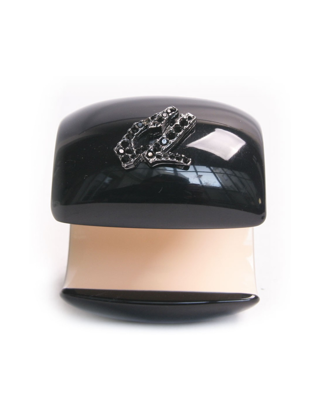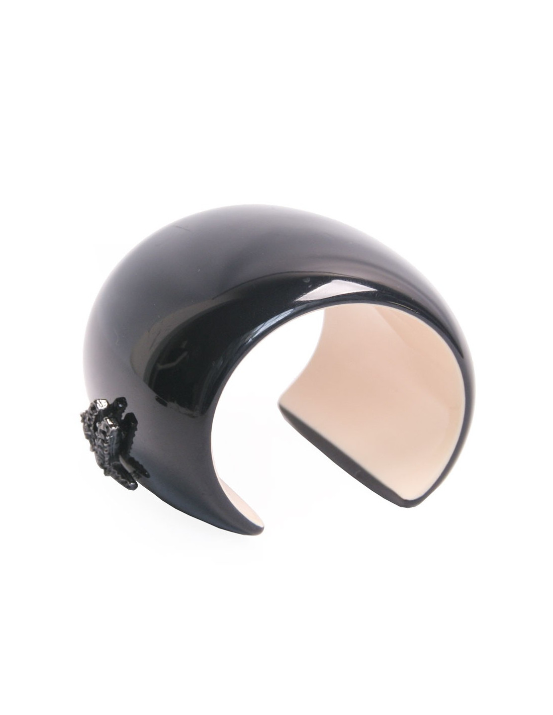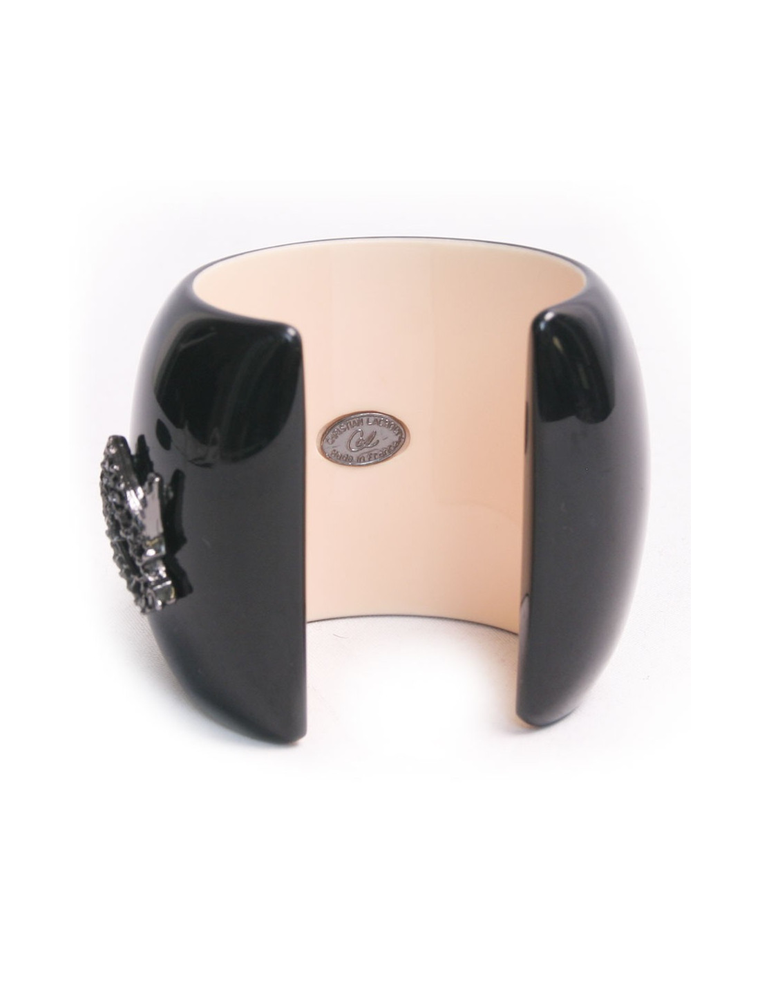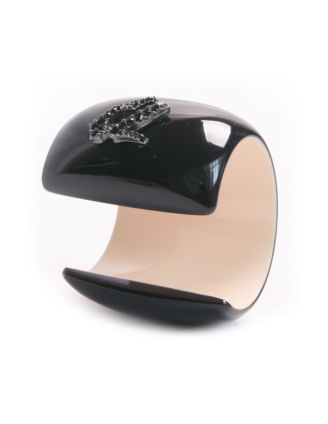 Manchette rigide Christian Lacroix en résine noire et intérieur beige, elle est agrémentée d'un bijou représentant le logo CL en argent vieilli avec strass noirs.
